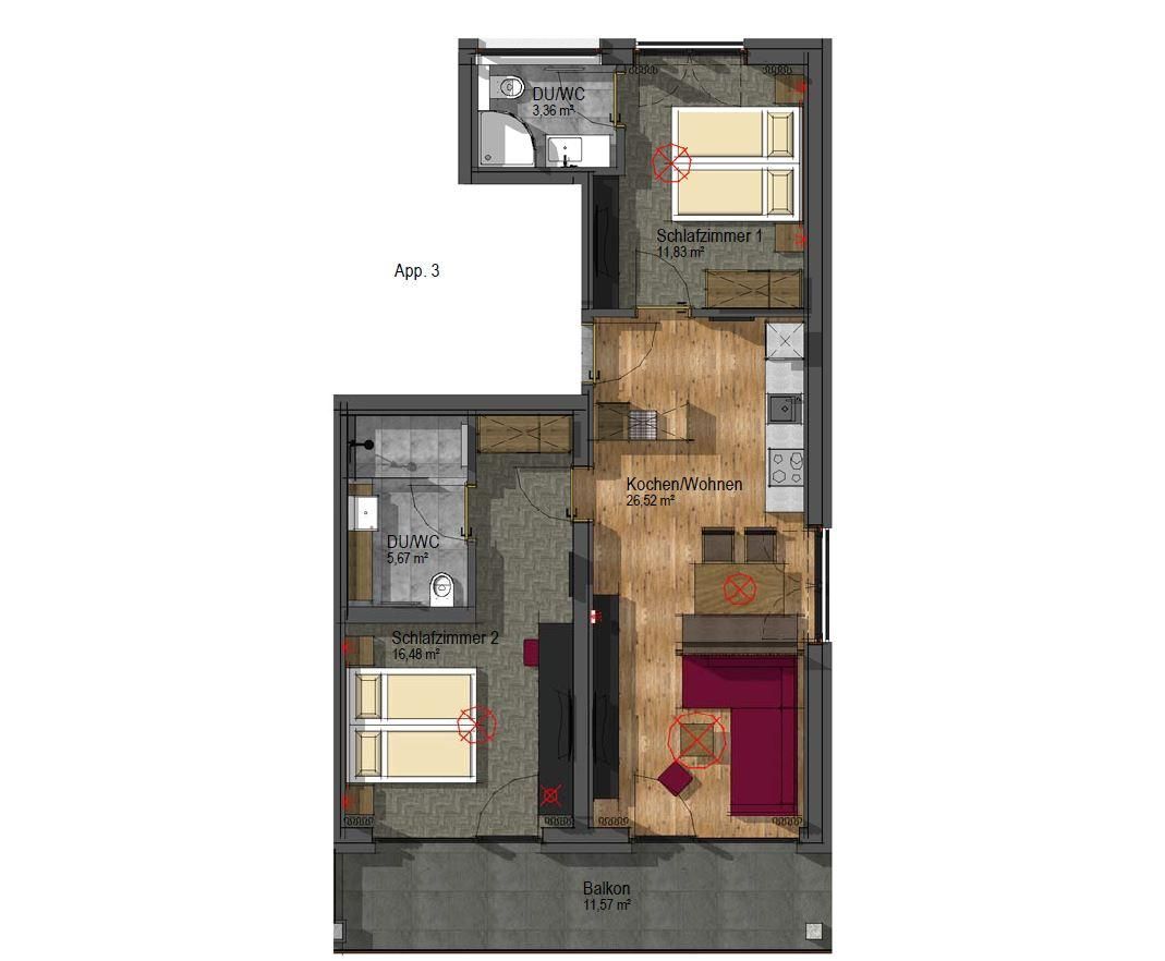 Modernes Appartement im Obergeschoss mit 65 m². Gemütlicher Wohn- & Essbereich, 2 Schlafzimmer, 2 Badezimmer und Balkon