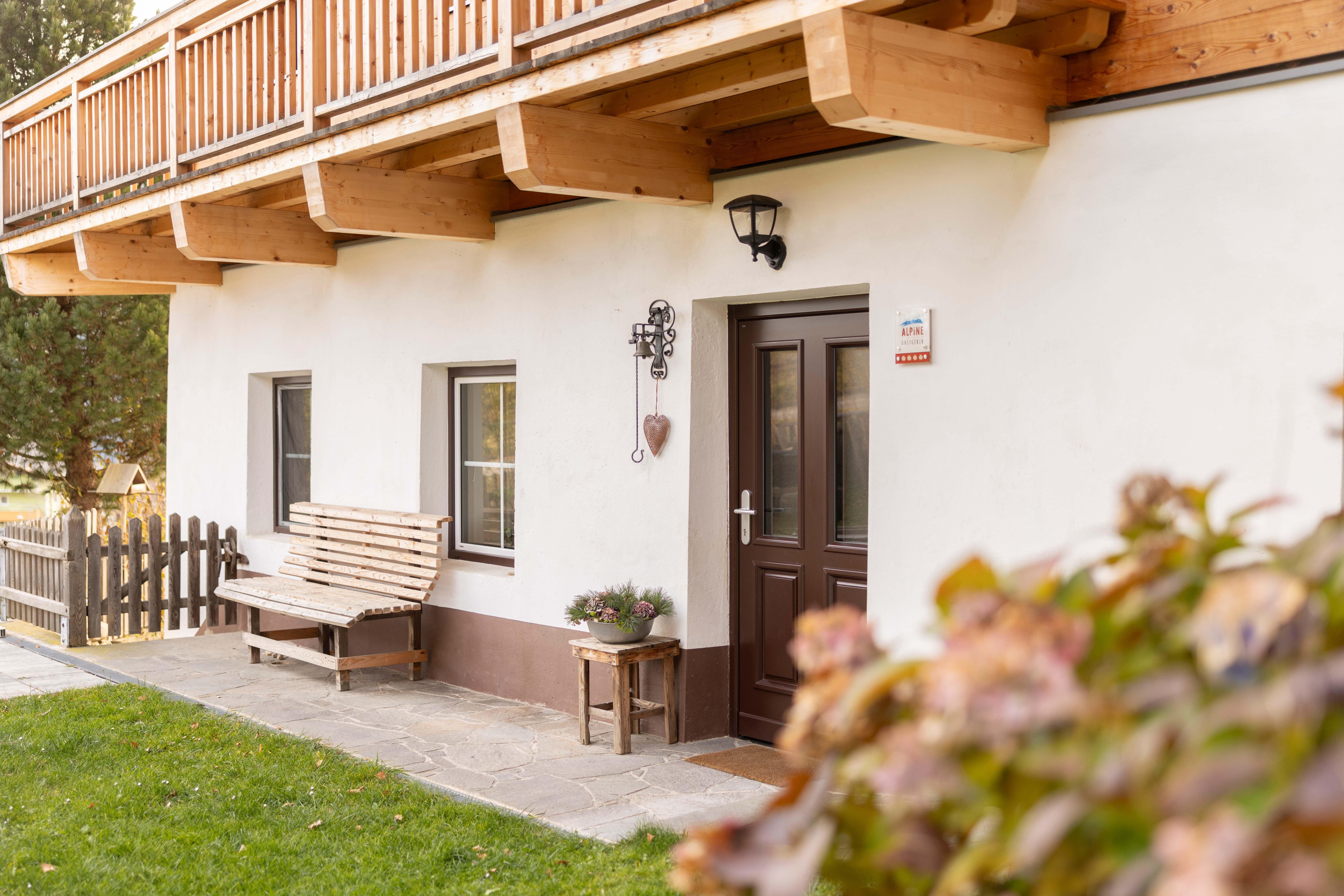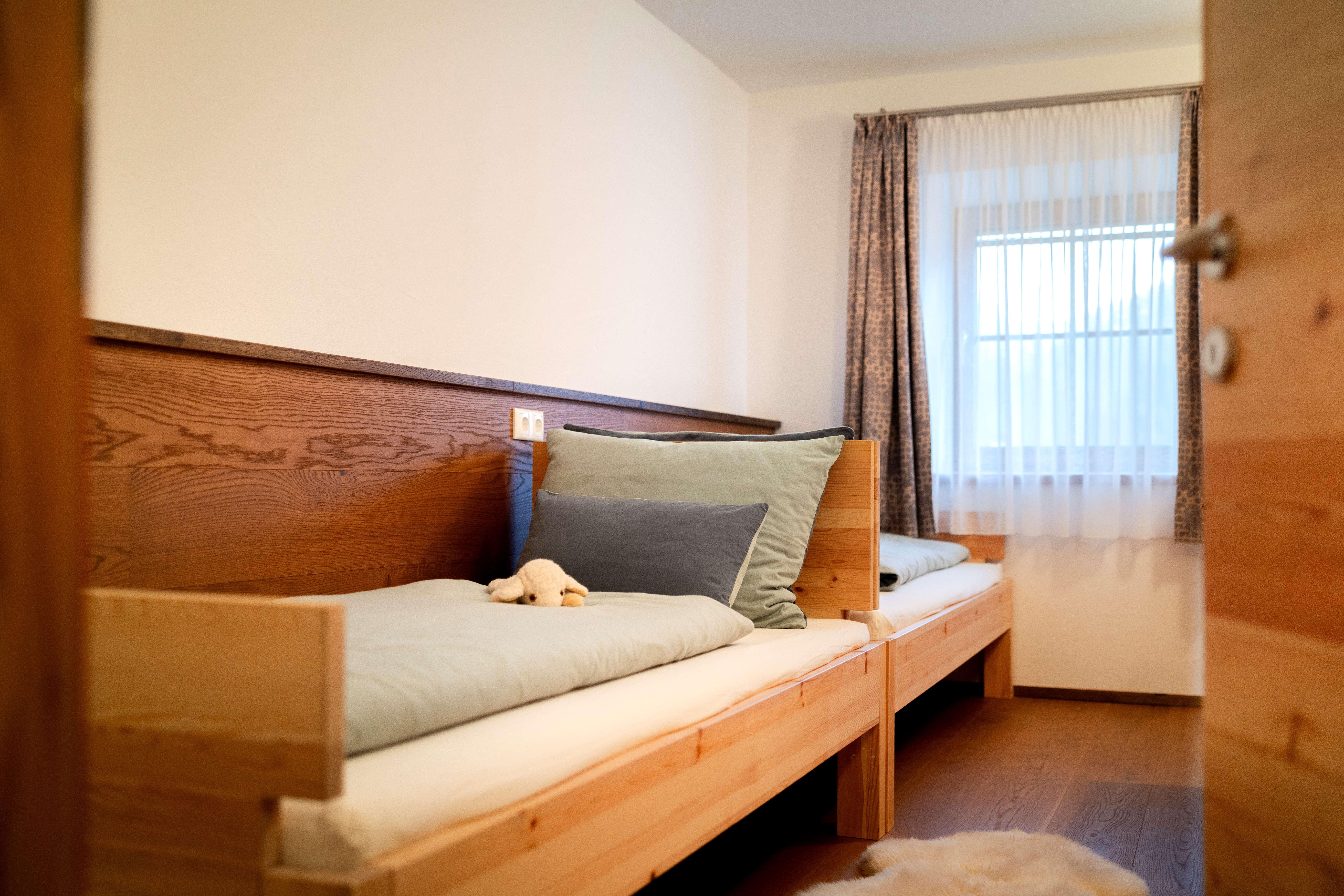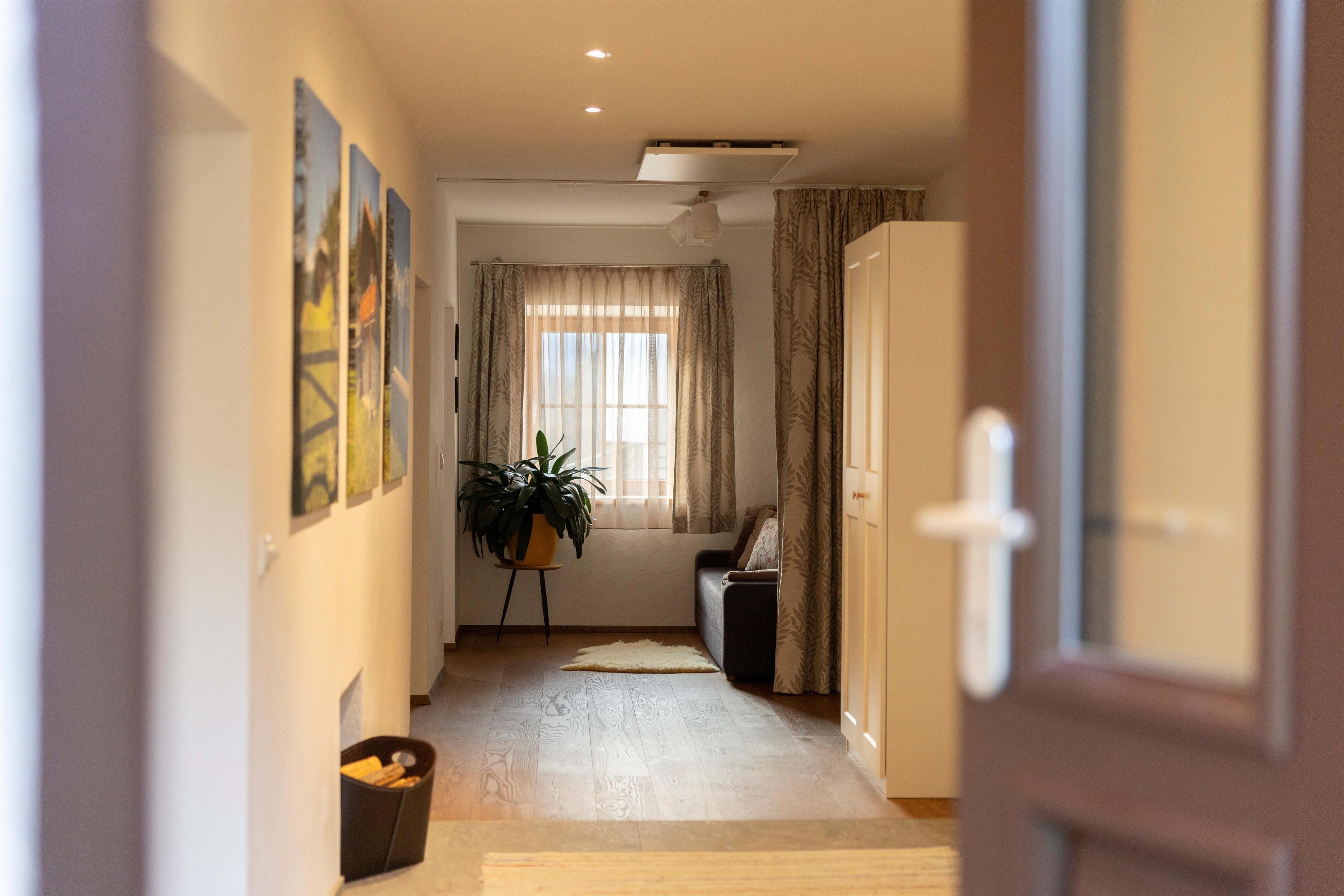 Die Wohnung hat einen eigenen Hauseingang, davor befindet sich eine gemütliche Terrasse, die gerne genutzt werden darf. Bei der Ausstattung der Wohnung wurde großer Wert auf Beständigkeit und Regionalität gelegt. So findet sich in den Zimmern eine massive Eichendiele, die metallfreien Betten und Kommoden wurden von einem Tischler aus der Region gefertigt.