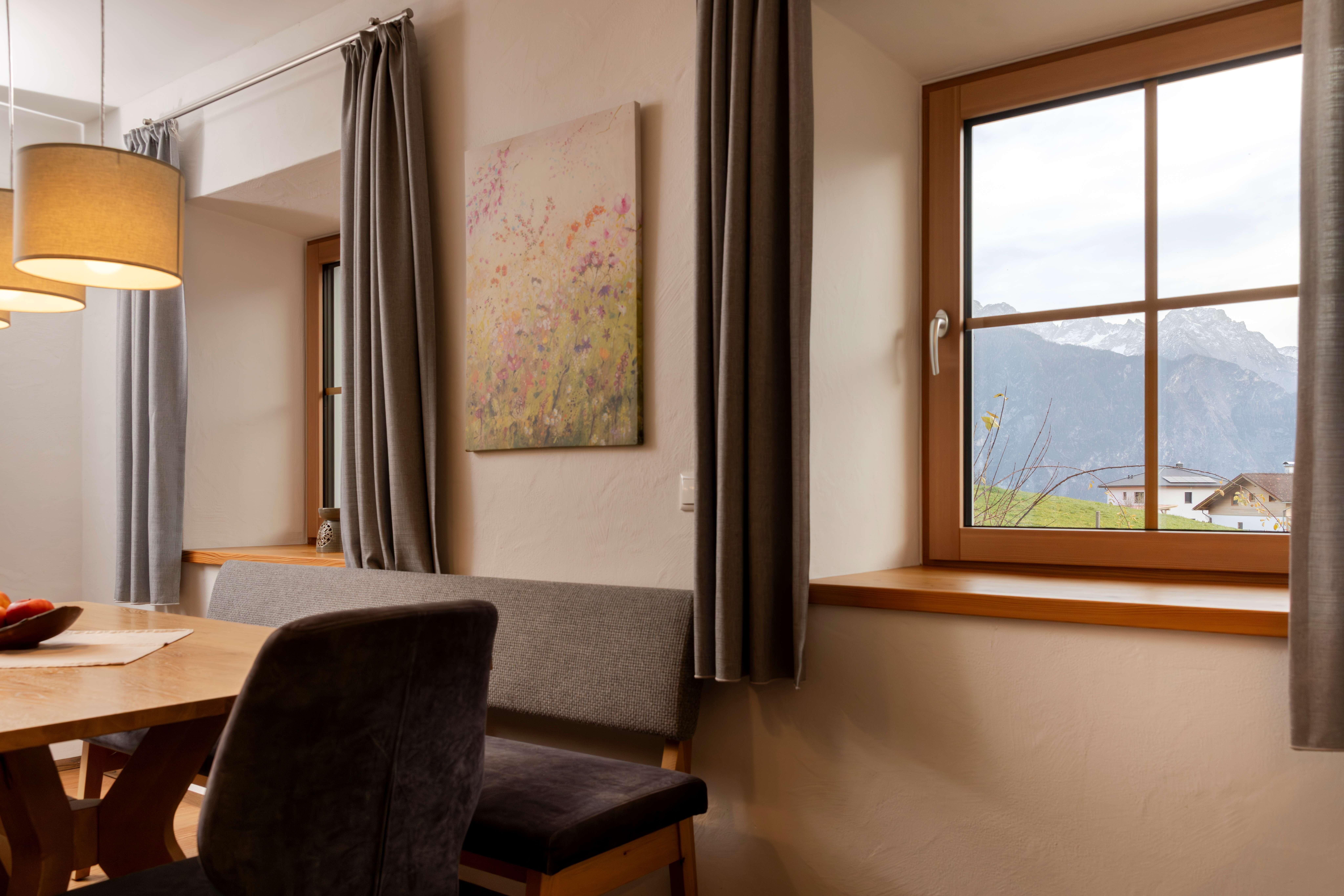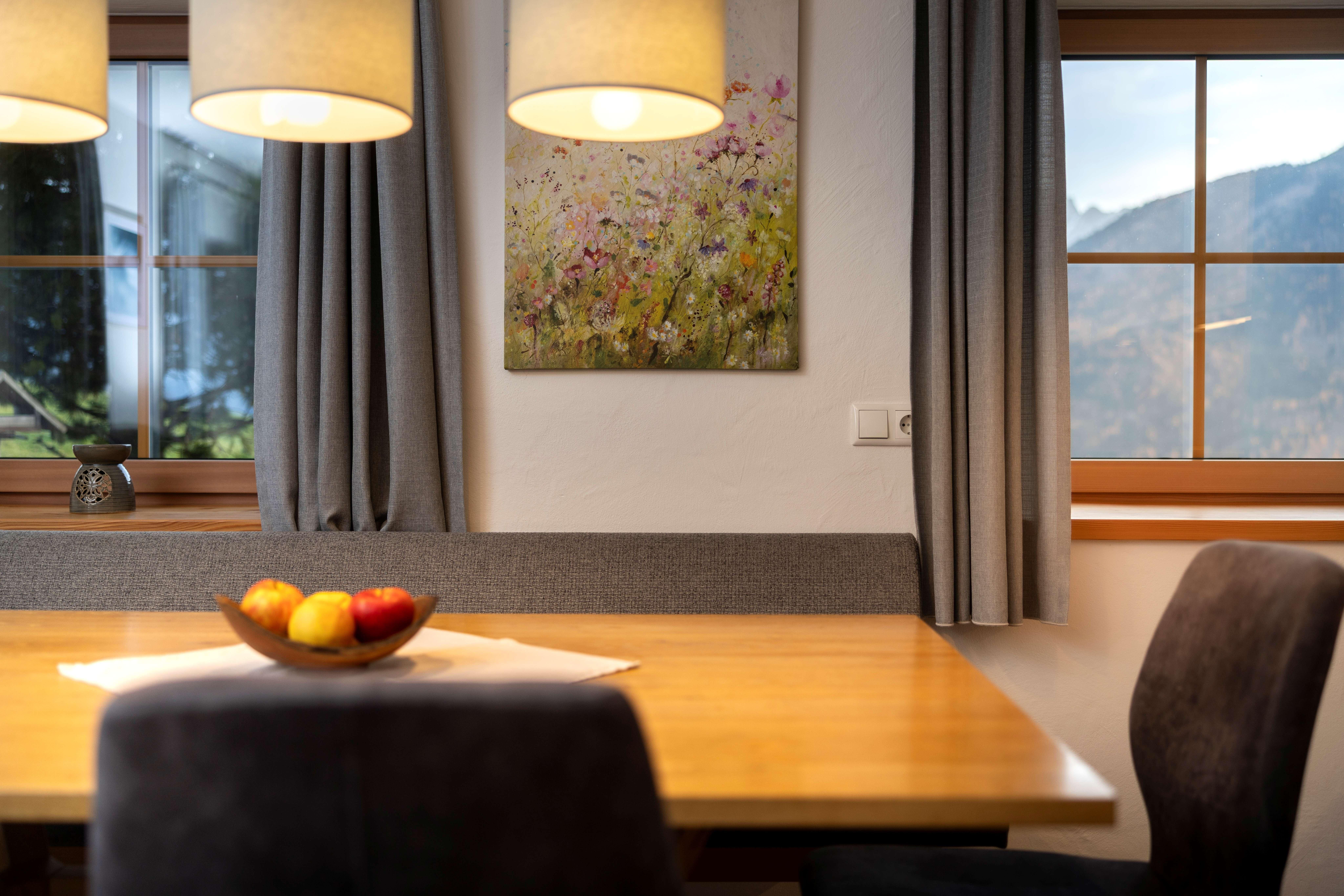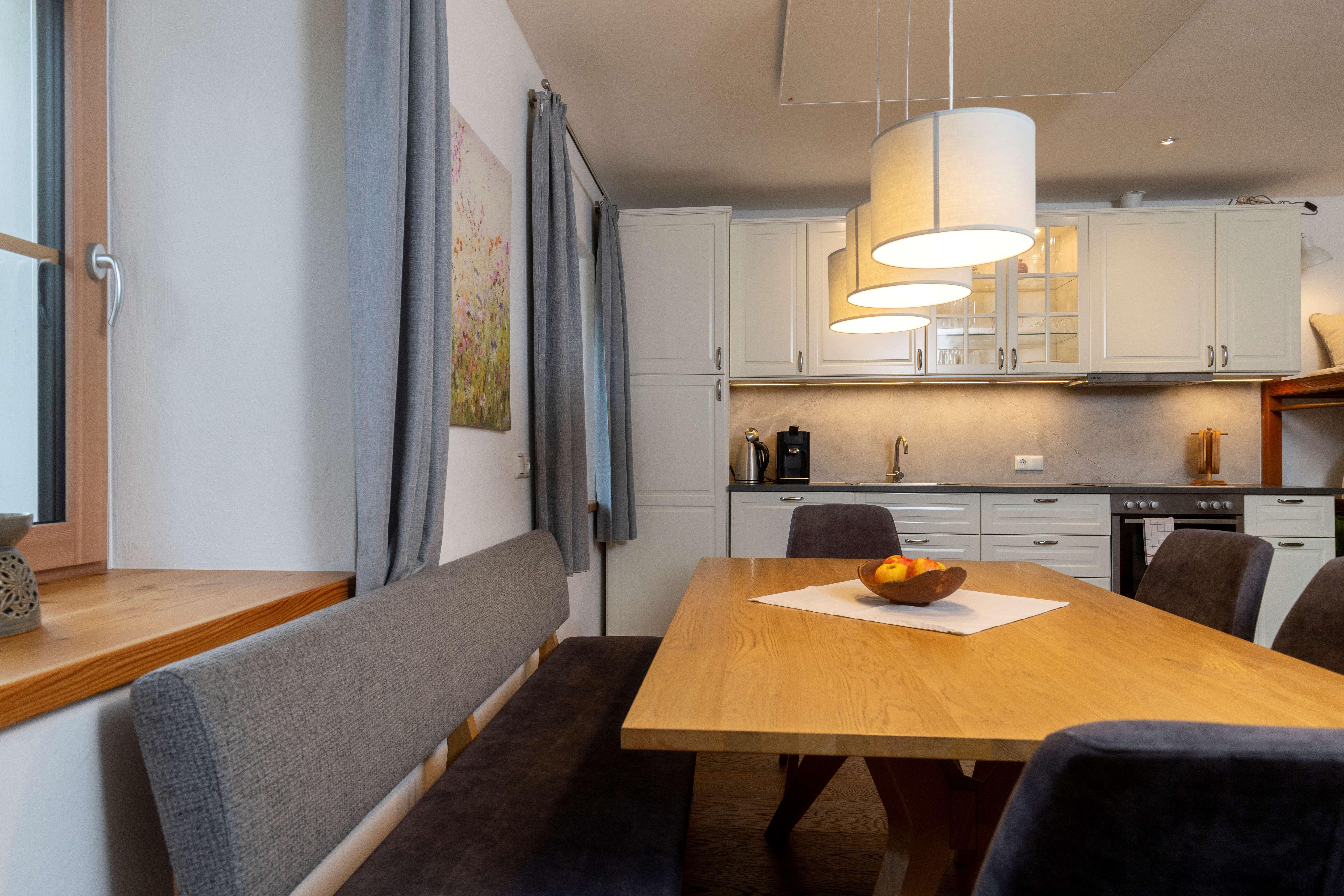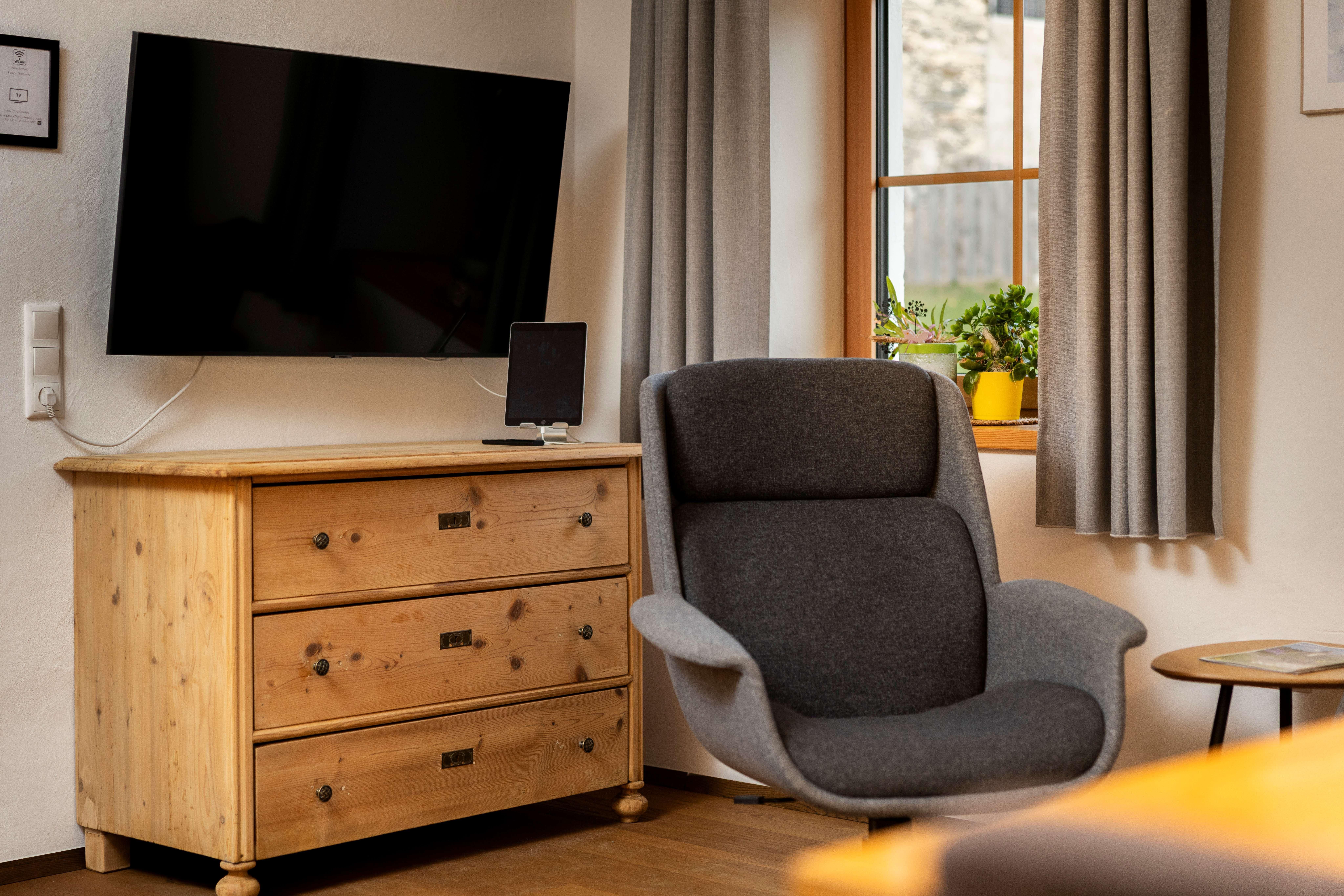 Die Wohnung hat einen eigenen Hauseingang, davor befindet sich eine gemütliche Terrasse, die gerne genutzt werden darf. Bei der Ausstattung der Wohnung wurde großer Wert auf Beständigkeit und Regionalität gelegt. So findet sich in den Zimmern eine massive Eichendiele, die metallfreien Betten und Kommoden wurden von einem Tischler aus der Region gefertigt.