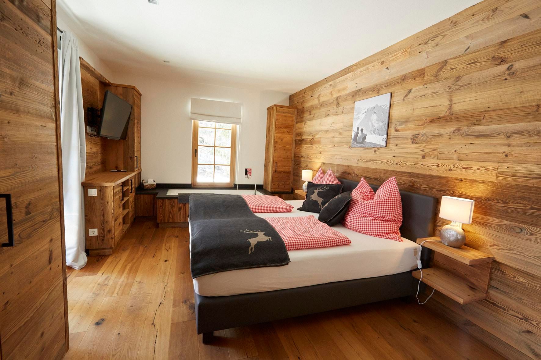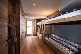 • Erdgeschoss: Ein gemütliches Vierbettzimmer mit zwei Etagenbetten, Schreibtisch und Zugang zum Wellnessbereich.