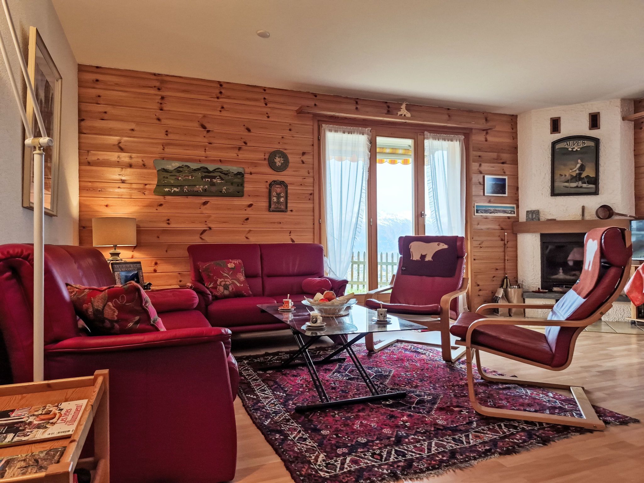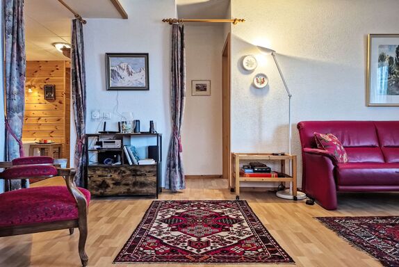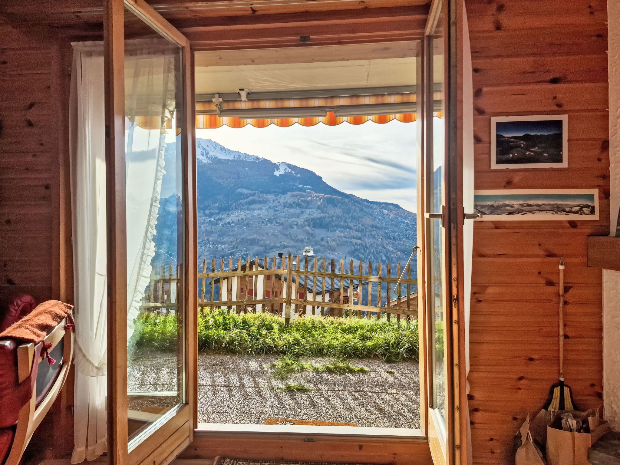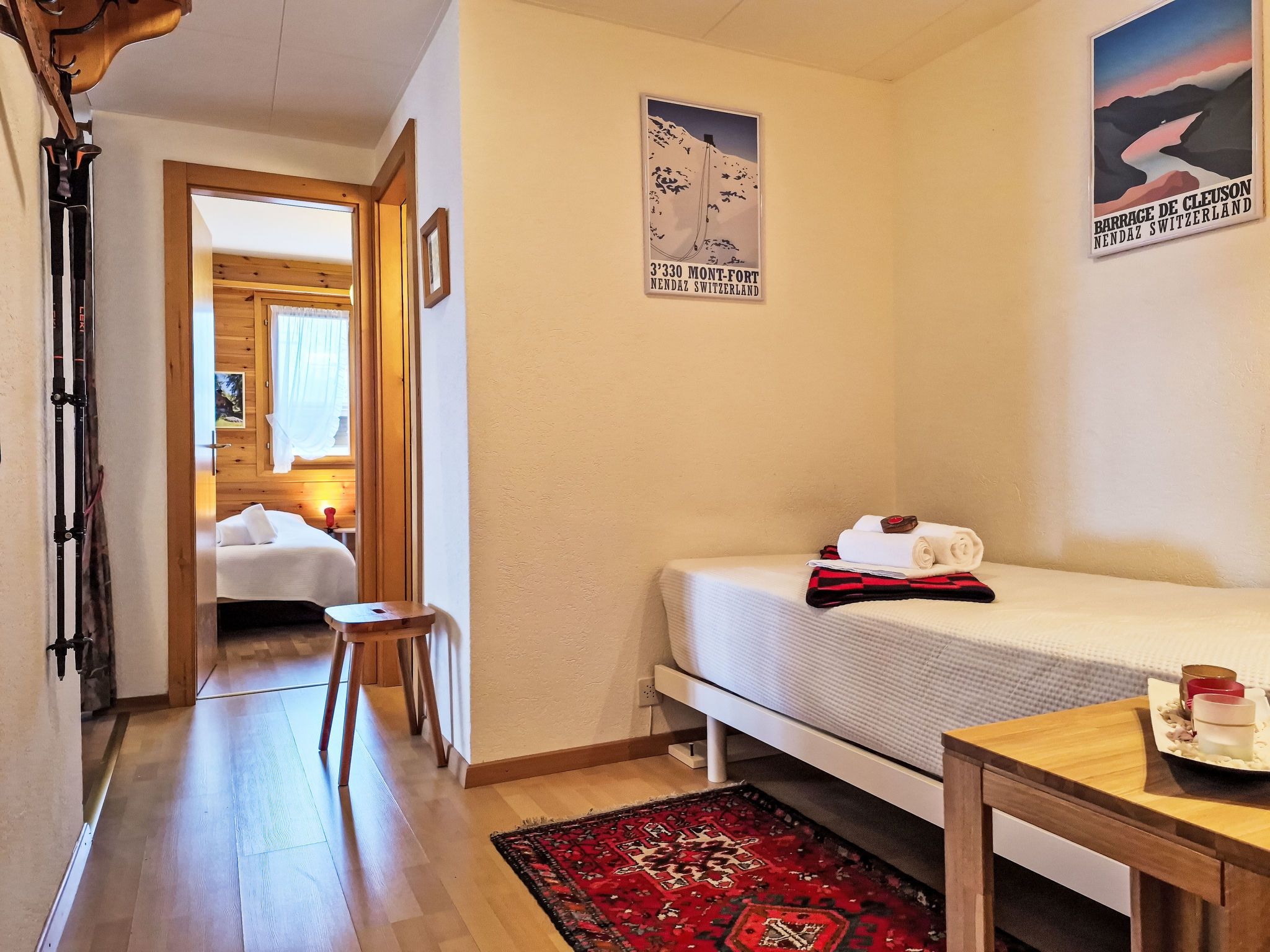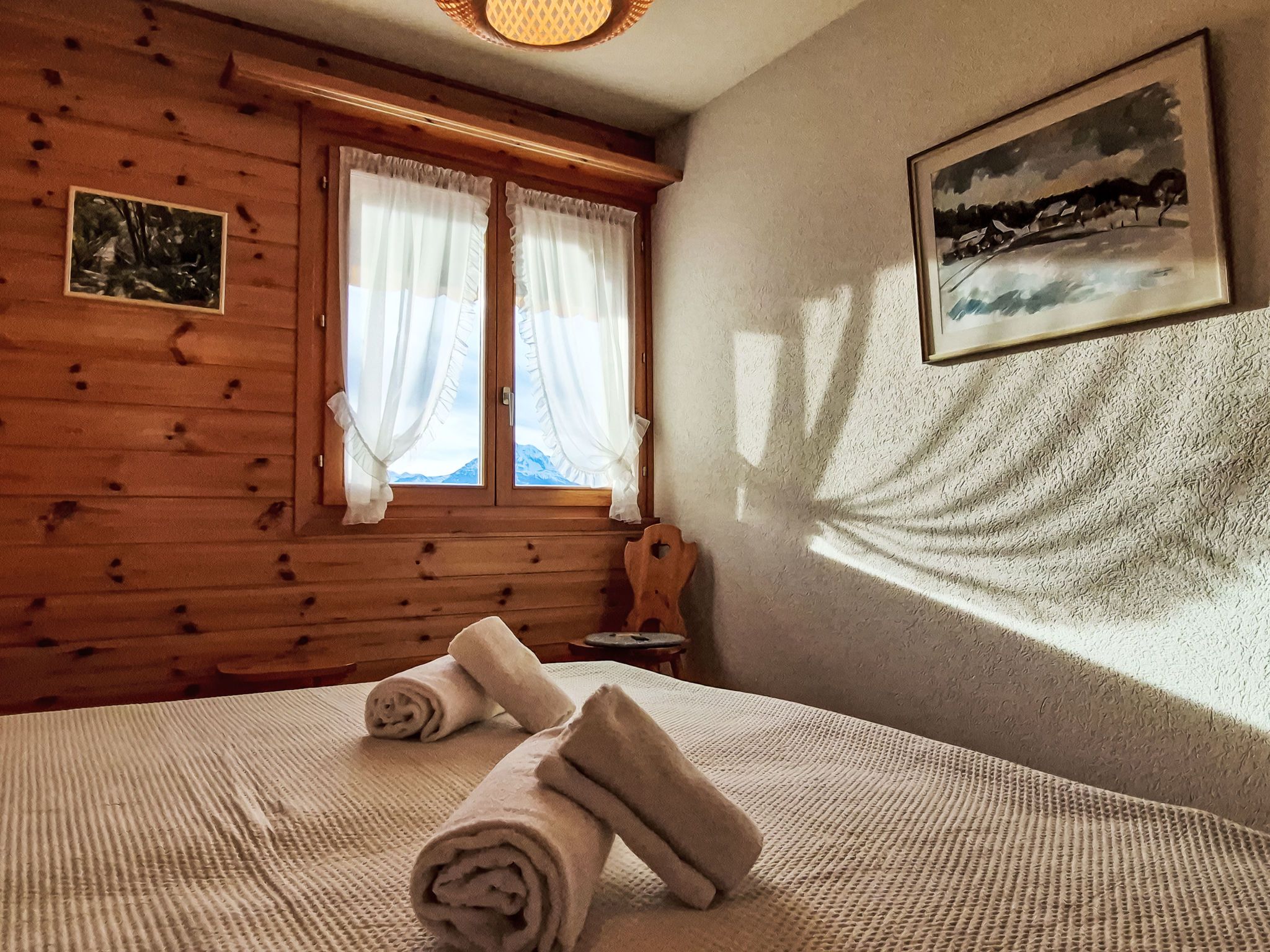 La Meinaz 1, 3-Zimmer-Wohnung 75 m2, im Erdgeschoss. Hell, komfortabel und geschmackvoll eingerichtet: Eingang mit 1 Bett (90 cm, Länge 200 cm). Wohn-/Esszimmer mit offenem Kamin. Ausgang zur Terrasse, Richtung Nordwesten und Richtung Osten. 1 Zimmer mit 1 franz. Bett (2 x 90 cm, Länge 200 cm). 1 Zimmer mit 2 Betten (80 cm, Länge 200 cm). Offene Küche (4 Kochplatten, Backofen, Geschirrspüler, Toaster, Wasserkocher, Mikrowelle, elektrische Kaffeemaschine, Kapseln für die Kaffeemaschine (Nespresso) extra, Racletteofen, Fondue Set (Käse)). Bad/WC, Dusche/WC. Terrasse, Nordlage und Westlage. Terrassenmöbel. Sehr schöne Sicht auf die Berge und das Tal. Zur Verfügung: Internet (WLAN, gratis).