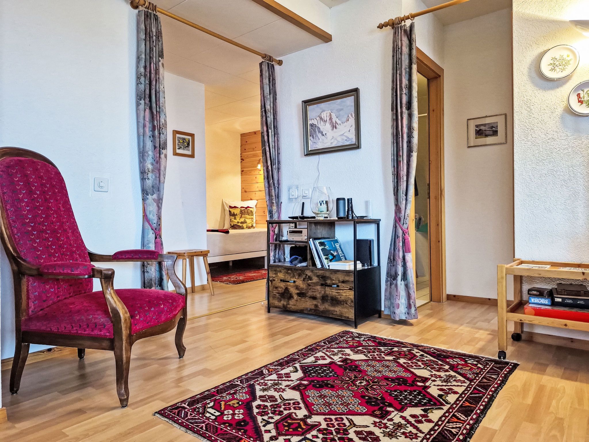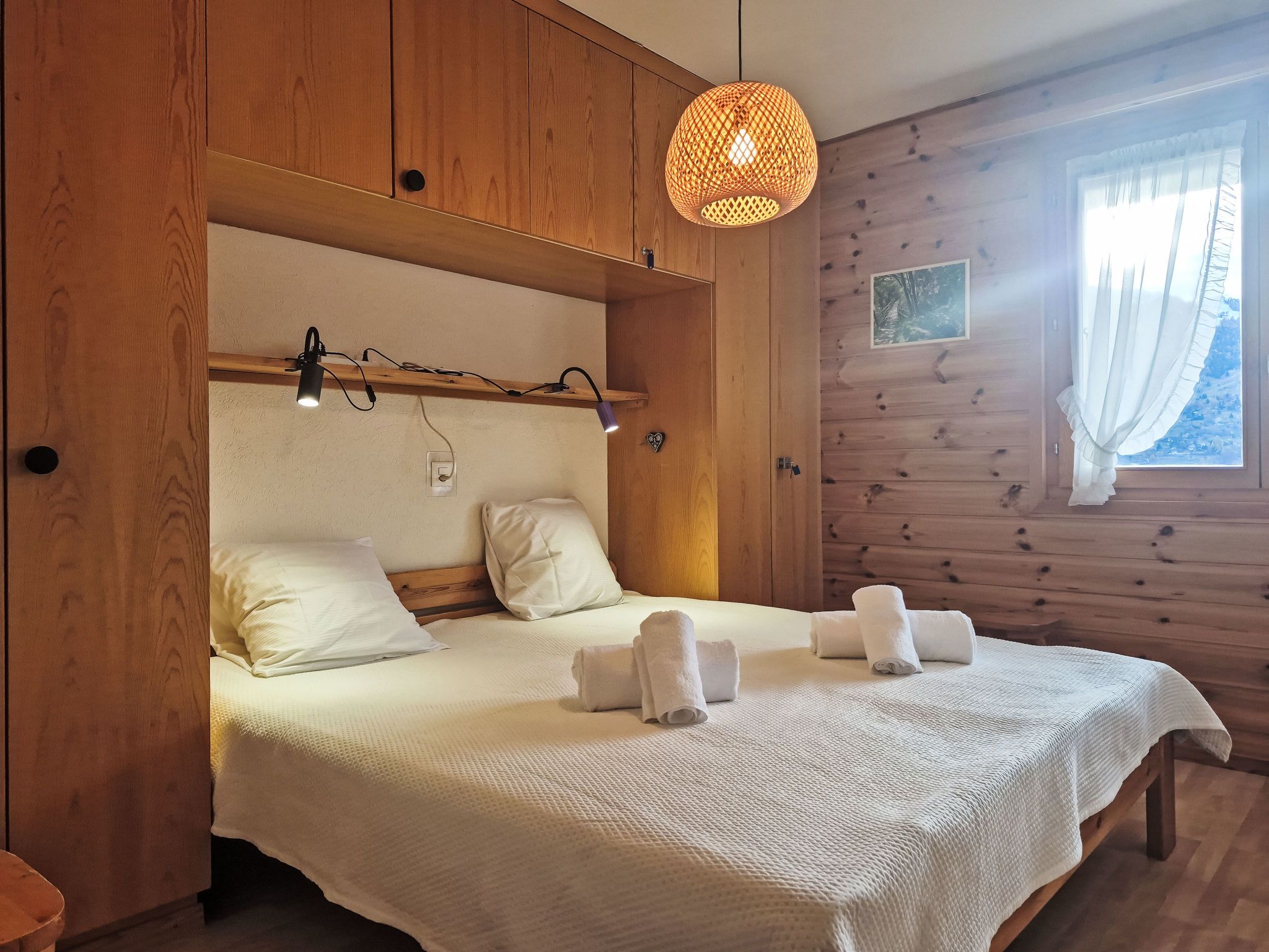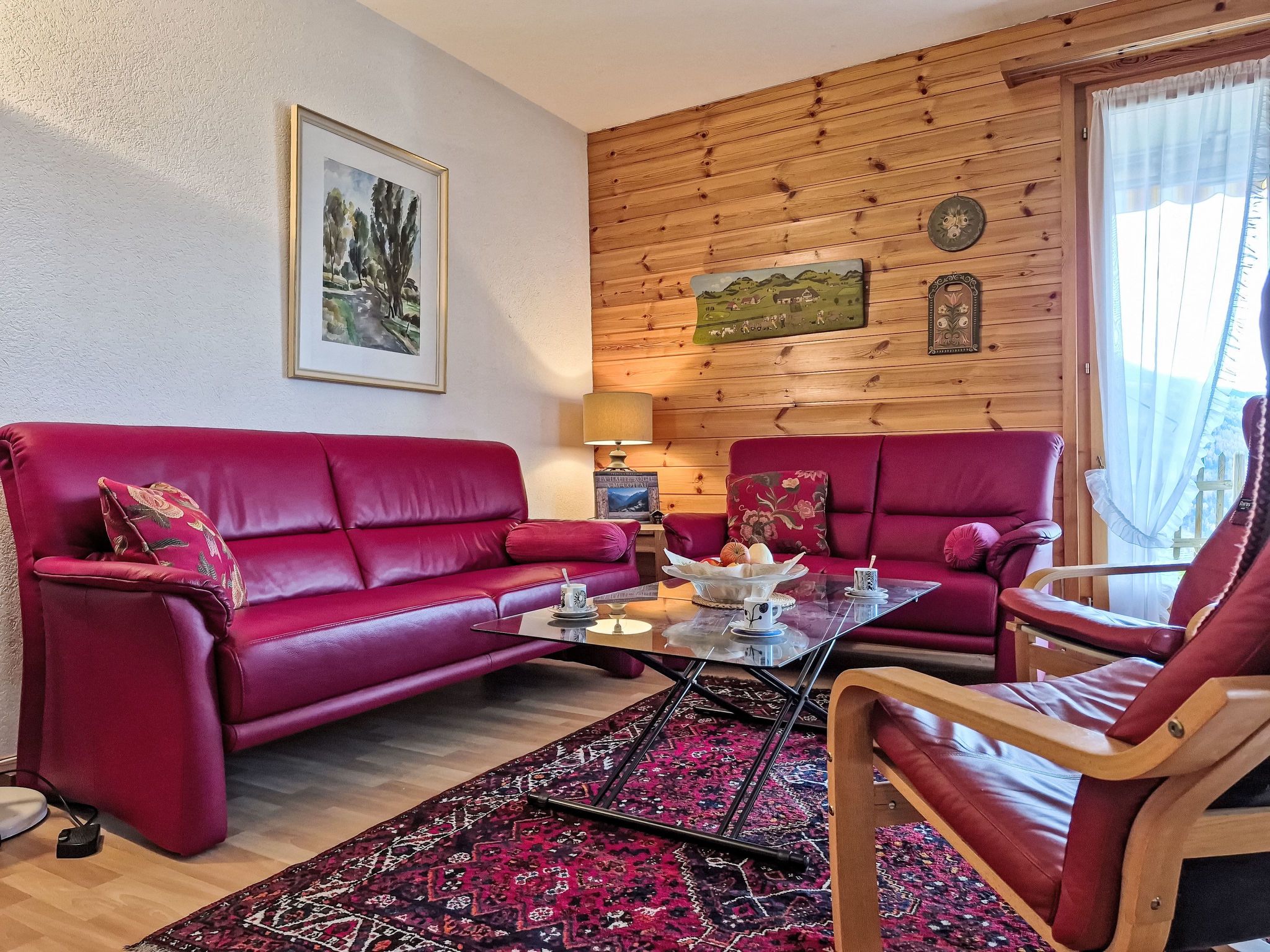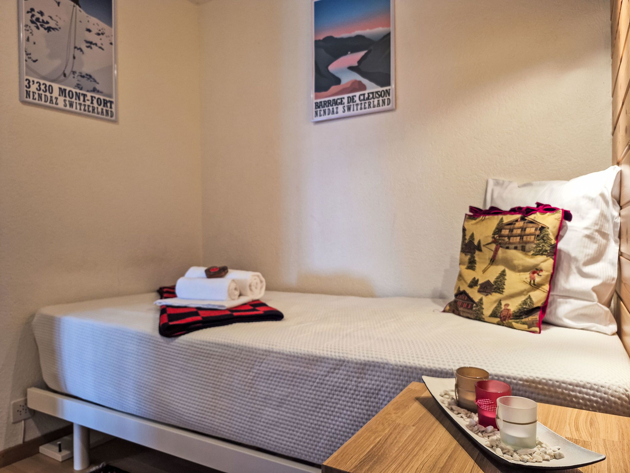 La Meinaz 1, 3-Zimmer-Wohnung 75 m2, im Erdgeschoss. Hell, komfortabel und geschmackvoll eingerichtet: Eingang mit 1 Bett (90 cm, Länge 200 cm). Wohn-/Esszimmer mit offenem Kamin. Ausgang zur Terrasse, Richtung Nordwesten und Richtung Osten. 1 Zimmer mit 1 franz. Bett (2 x 90 cm, Länge 200 cm). 1 Zimmer mit 2 Betten (80 cm, Länge 200 cm). Offene Küche (4 Kochplatten, Backofen, Geschirrspüler, Toaster, Wasserkocher, Mikrowelle, elektrische Kaffeemaschine, Kapseln für die Kaffeemaschine (Nespresso) extra, Racletteofen, Fondue Set (Käse)). Bad/WC, Dusche/WC. Terrasse, Nordlage und Westlage. Terrassenmöbel. Sehr schöne Sicht auf die Berge und das Tal. Zur Verfügung: Internet (WLAN, gratis).