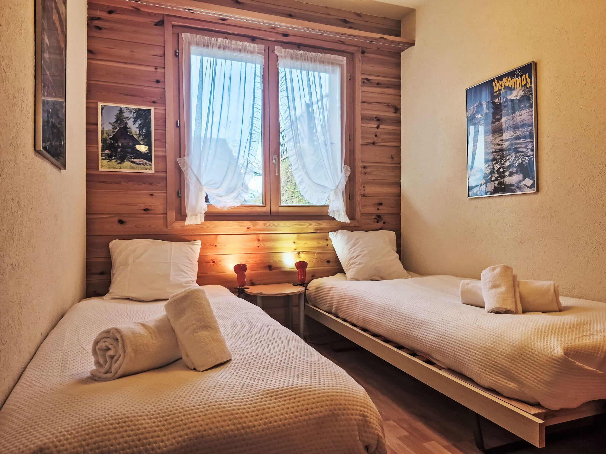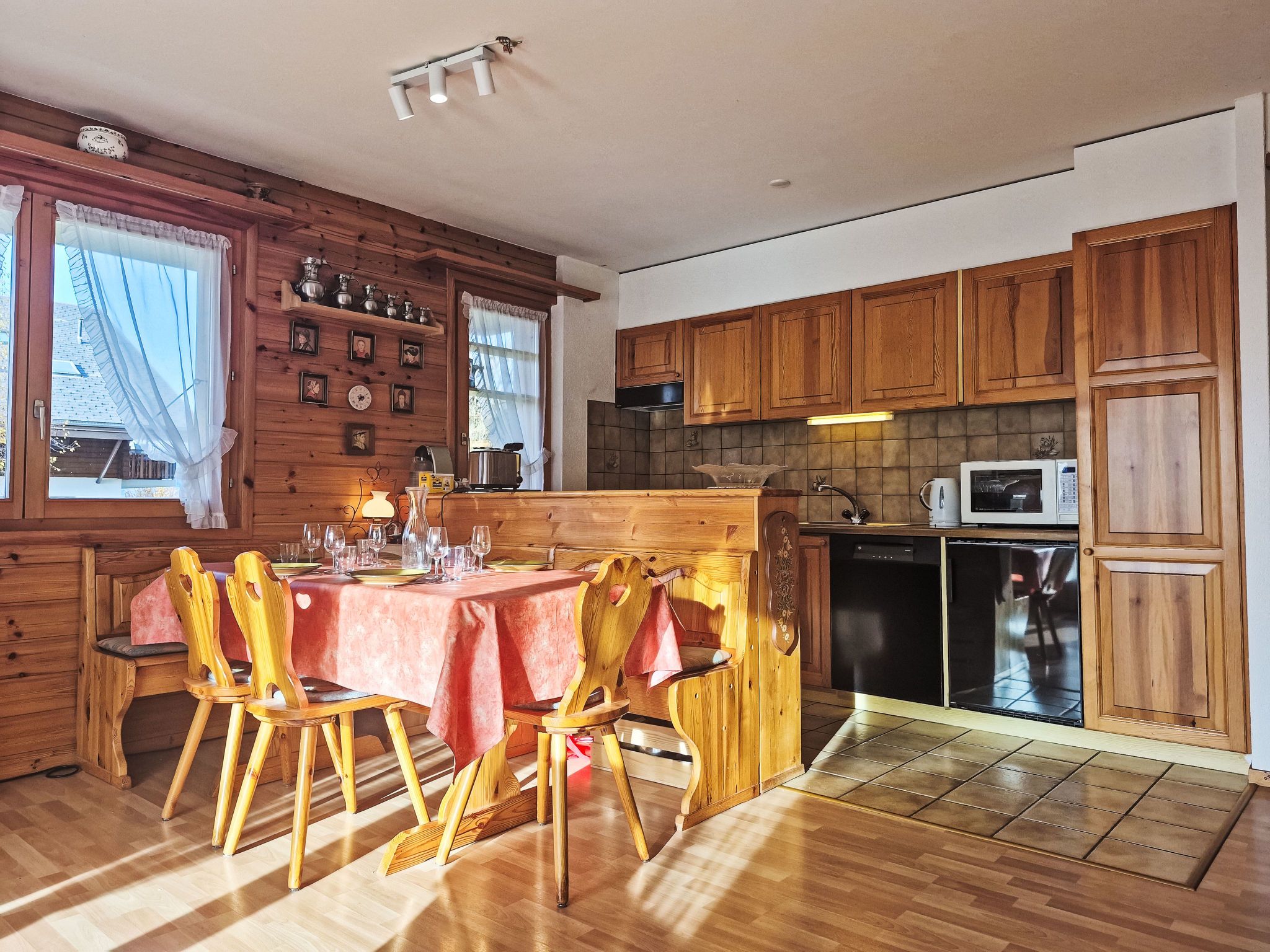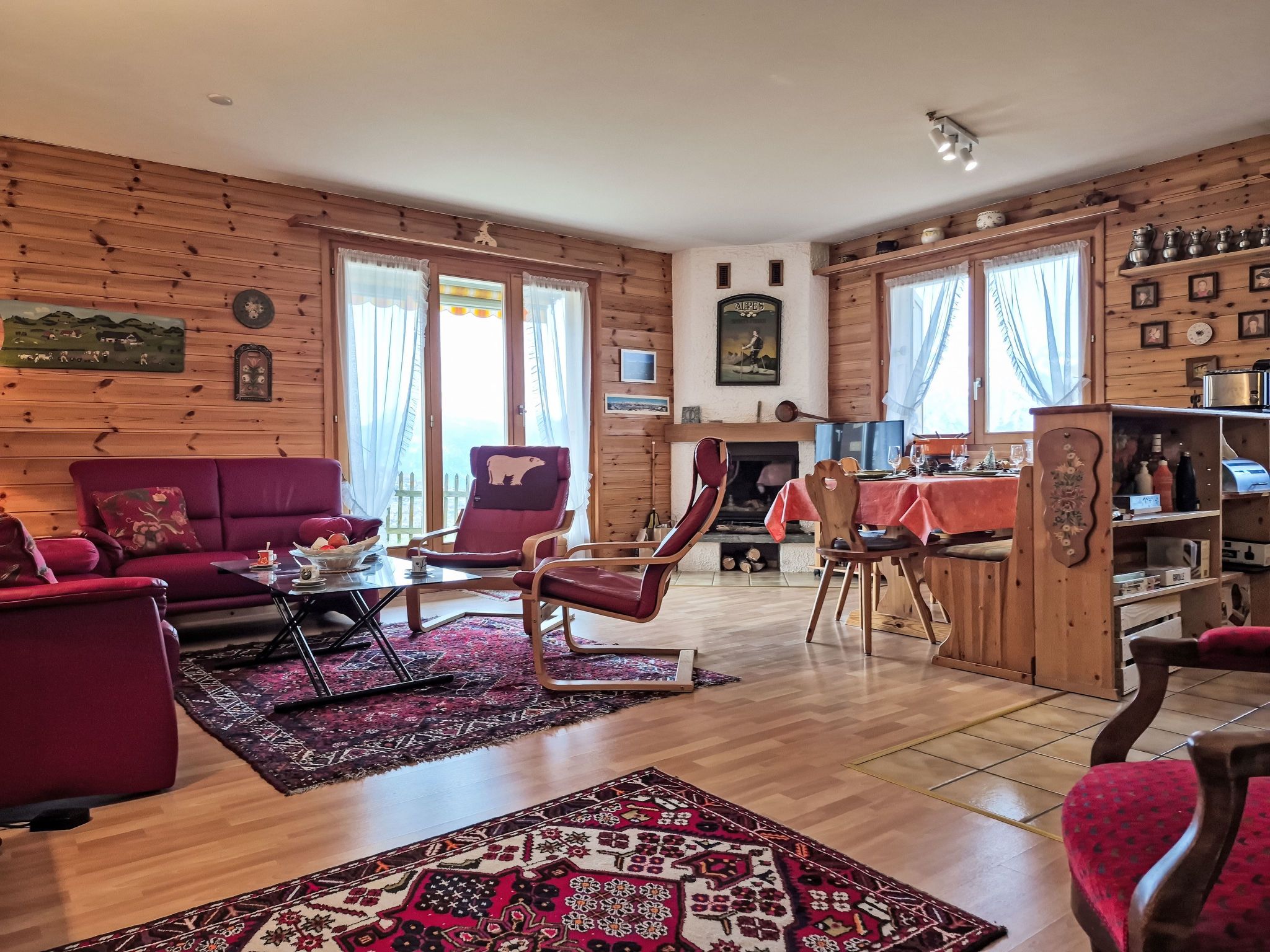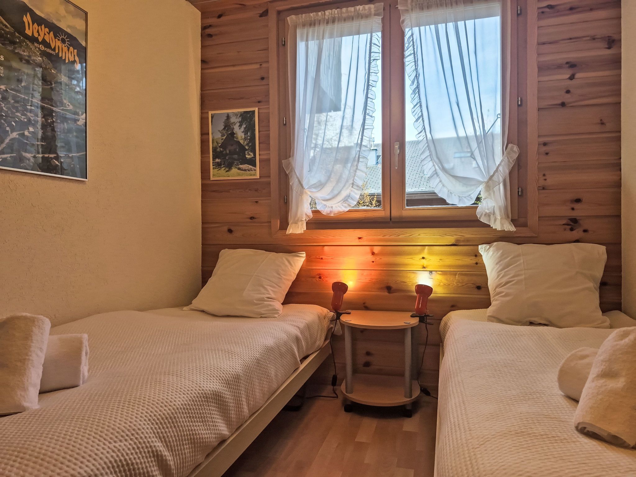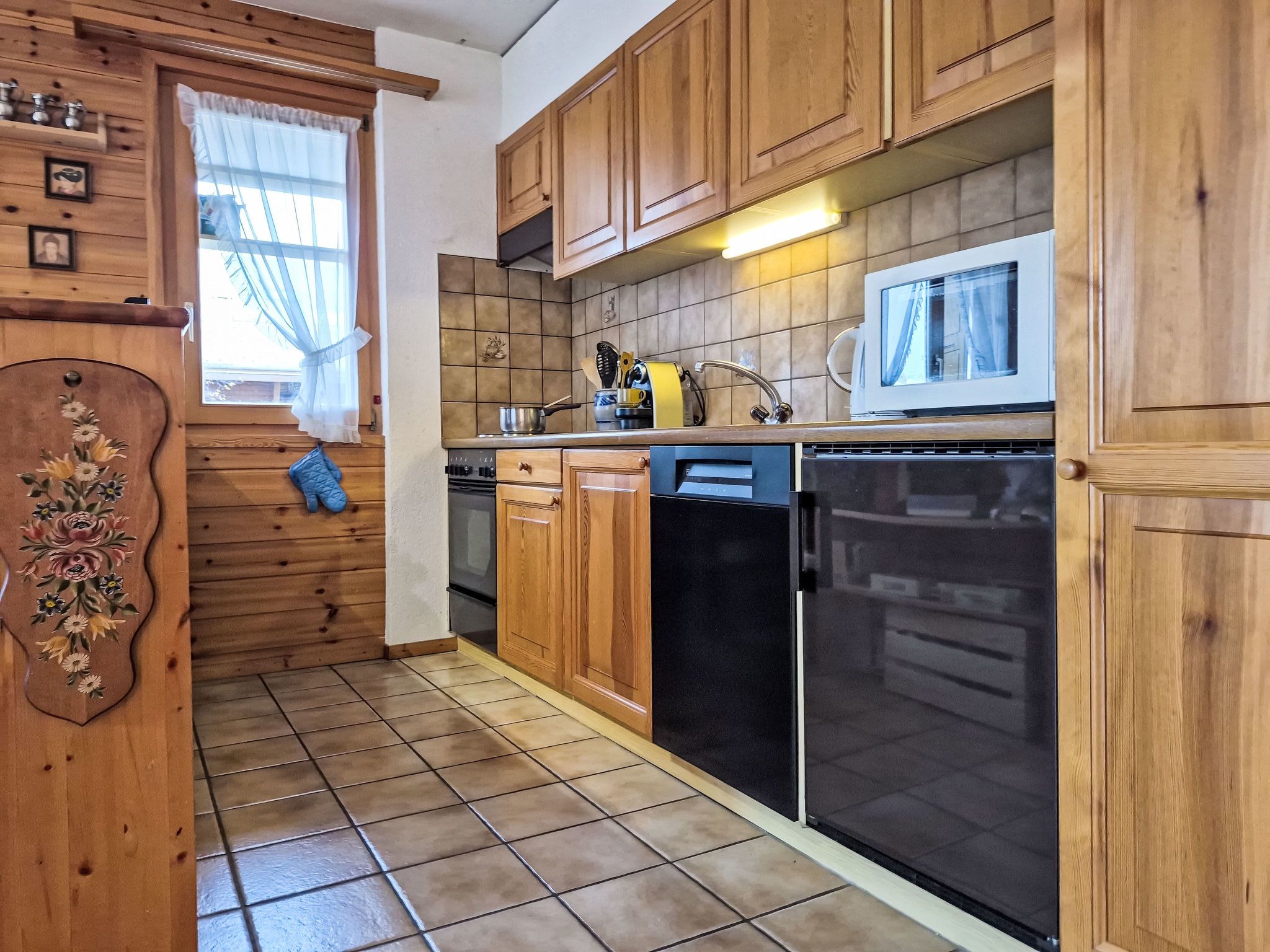 La Meinaz 1, 3-Zimmer-Wohnung 75 m2, im Erdgeschoss. Hell, komfortabel und geschmackvoll eingerichtet: Eingang mit 1 Bett (90 cm, Länge 200 cm). Wohn-/Esszimmer mit offenem Kamin. Ausgang zur Terrasse, Richtung Nordwesten und Richtung Osten. 1 Zimmer mit 1 franz. Bett (2 x 90 cm, Länge 200 cm). 1 Zimmer mit 2 Betten (80 cm, Länge 200 cm). Offene Küche (4 Kochplatten, Backofen, Geschirrspüler, Toaster, Wasserkocher, Mikrowelle, elektrische Kaffeemaschine, Kapseln für die Kaffeemaschine (Nespresso) extra, Racletteofen, Fondue Set (Käse)). Bad/WC, Dusche/WC. Terrasse, Nordlage und Westlage. Terrassenmöbel. Sehr schöne Sicht auf die Berge und das Tal. Zur Verfügung: Internet (WLAN, gratis).