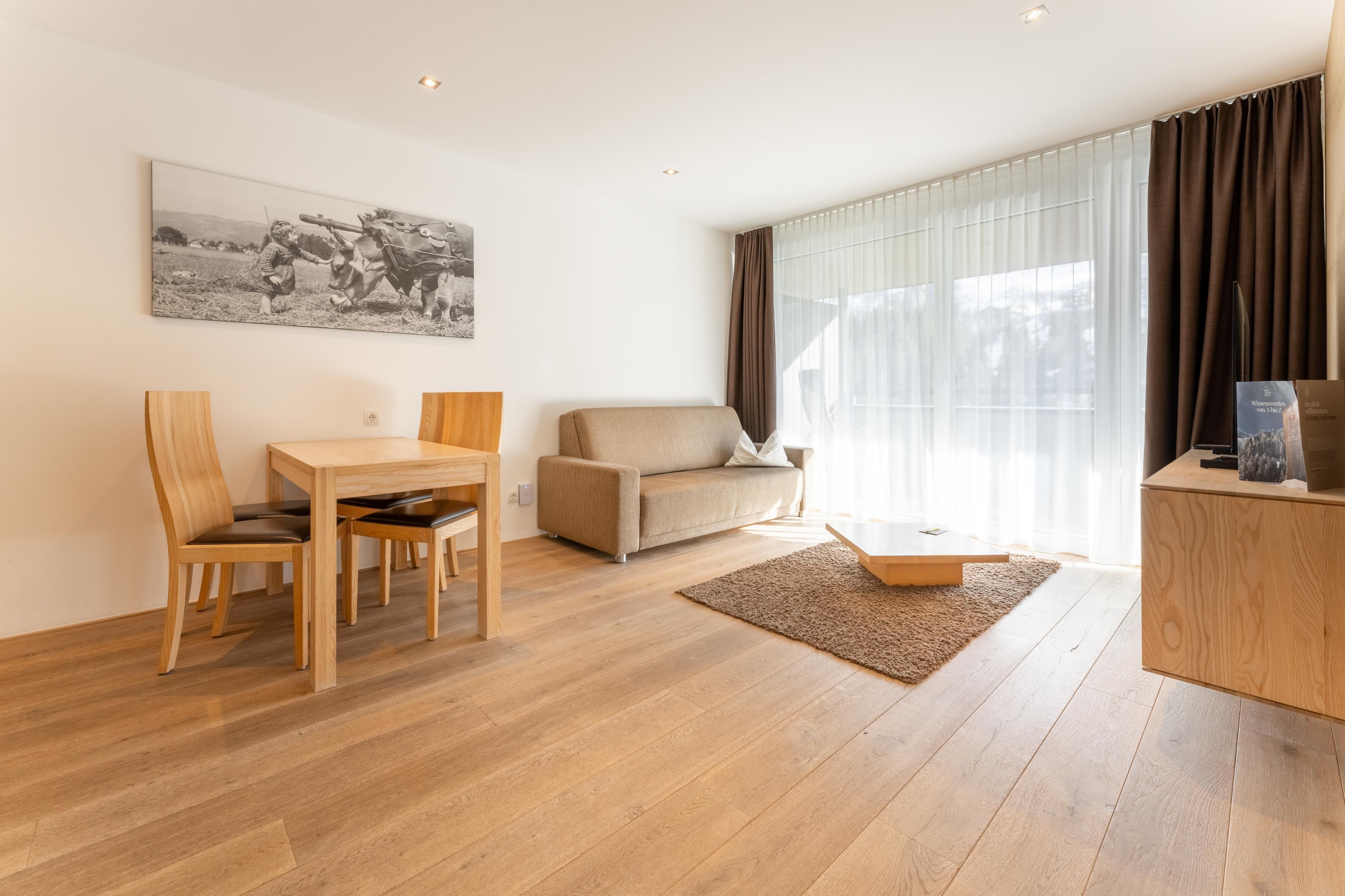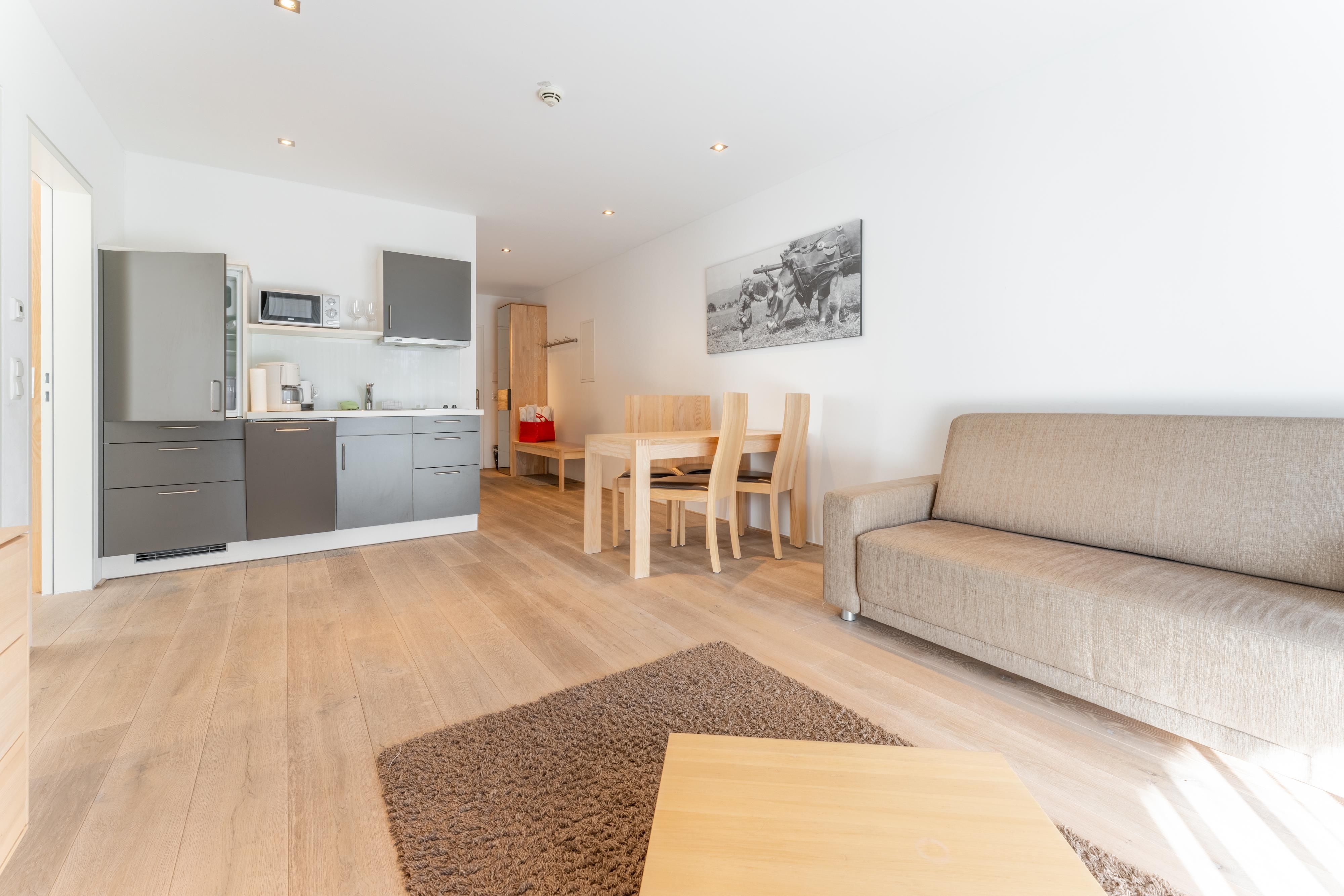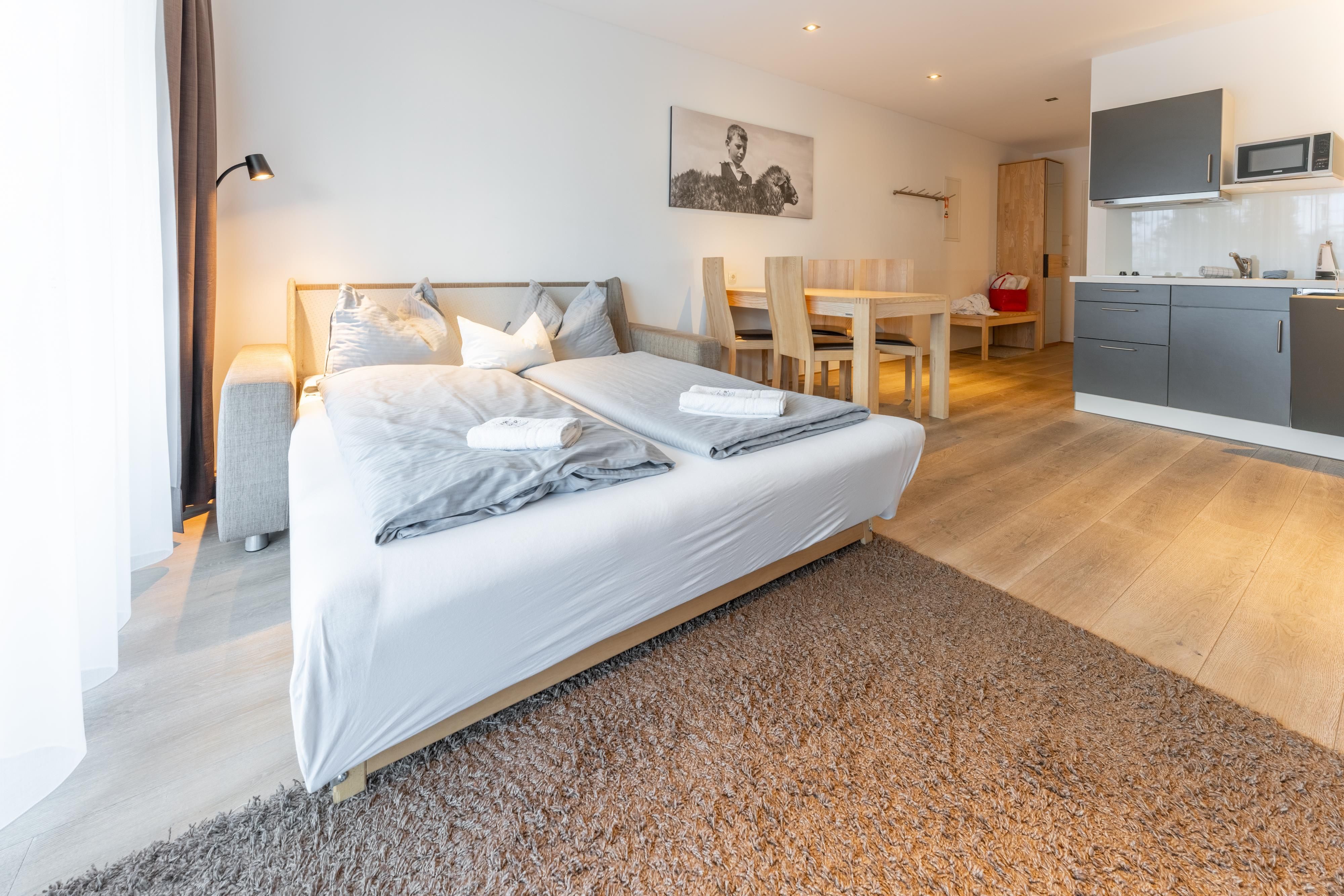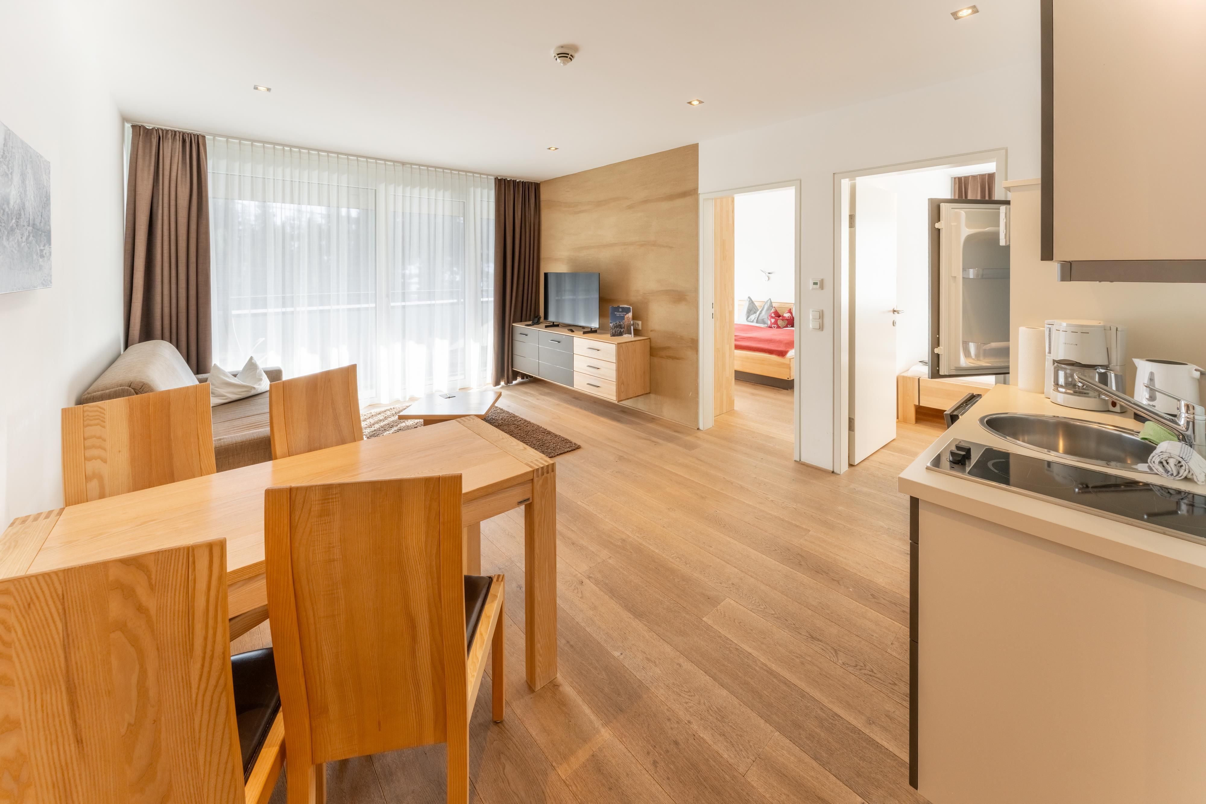 Dieses moderne Apartment verfügt über eine große Terrasse mit Bergblick und zwei Schlaffzimmer. Das Wohnzimmer ist mit komfortablen Sofas und einem Flachbild-Sat-TV ausgestattet. Außerdem bietet das Apartment kostenfreies WLAN sowie eine komplett ausgestattete Küchenzeile und einen Essbereich. Eine tägliche Reinigung und Bademäntel werden auf Anfrage gegen Aufpreis angeboten.Das Appartement steht Ihnen ohne Verpflegung zur Verfügung! Frühstück von unserem reichhaltigen Frühstücksbuffet ist zum Aufpreis von €21,-- buchbar. Die Endreinigungsgebühr von 60,--€ ist im Preis inkludiert und wird vor Ort verrechnet!