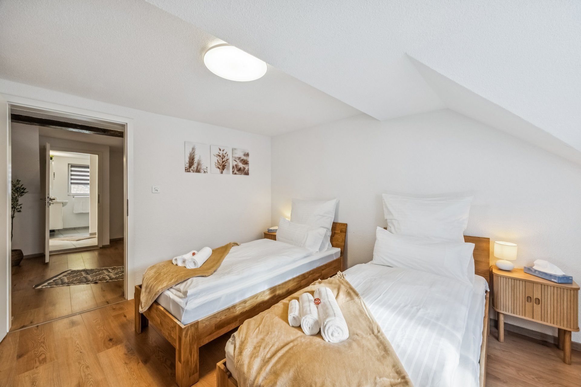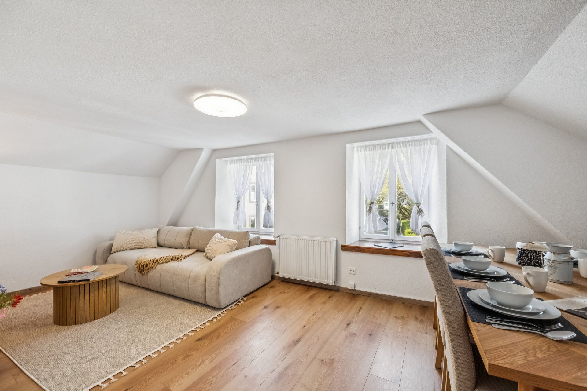 Im Inneren dieser Ferienwohnung finden Sie zwei einladende Schlafzimmer und ein Badezimmer mit Dusche, die Komfort und Bequemlichkeit für alle Gäste garantieren. Zur weiteren Ausstattung gehören eine Kapsel-Kaffeemaschine, Filter-Kaffeemaschine sowie eine Espressokanne, die Morgenkaffee-Liebhaber begeistern wird. Eine voll ausgestattete Küche mit Cerankochfeld, Spülmaschine und Wasserkocher lädt dazu ein, köstliche Mahlzeiten zu zaubern. Außerdem steht Ihnen zur alleinigen Nutzung eine Waschmaschine im Objekt zur Verfügung. Entspannte Abende können Sie vor dem Smart-TV verbringen.