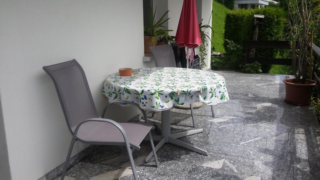 Der große Garten mit seinen schattenspendenden Bäumen und einem eingezäunten Teil, ideal für Hunde, lädt zum Verweilen und Entspannen ein. Die Wohnung bleibt auch ohne Klimaanlage dank der parkähnlichen Anlage im Hochsommer angenehm kühl. Auf der Terrasse mit Tisch, Stühlen und einem Sonnenschirm können Sie entspannte Stunden im Freien genießen. Die riesige Terrasse selbst bietet eine traumhafte Sicht auf die Bergwelt und den See, was besonders am Abend zum Verweilen einlädt.
