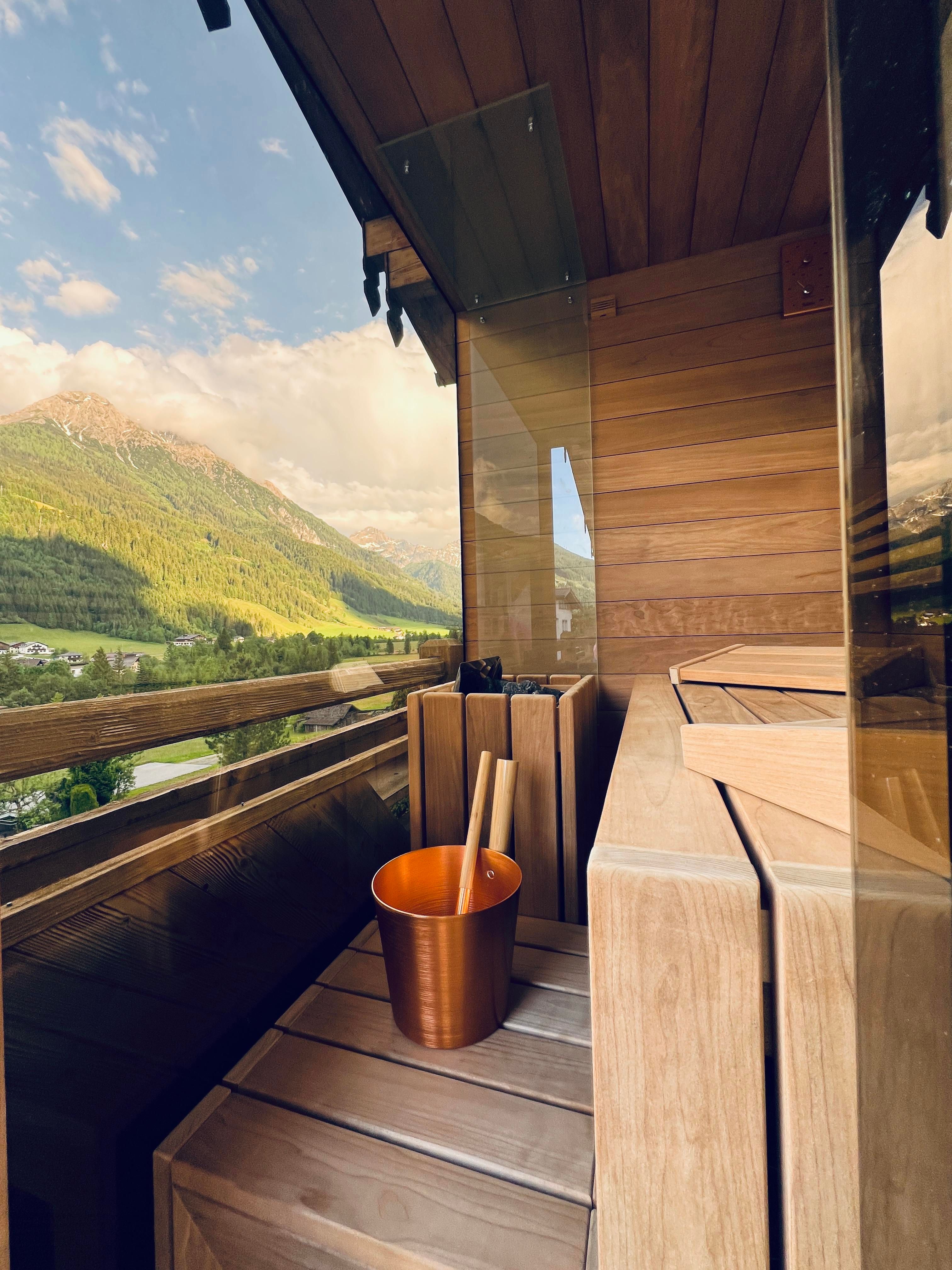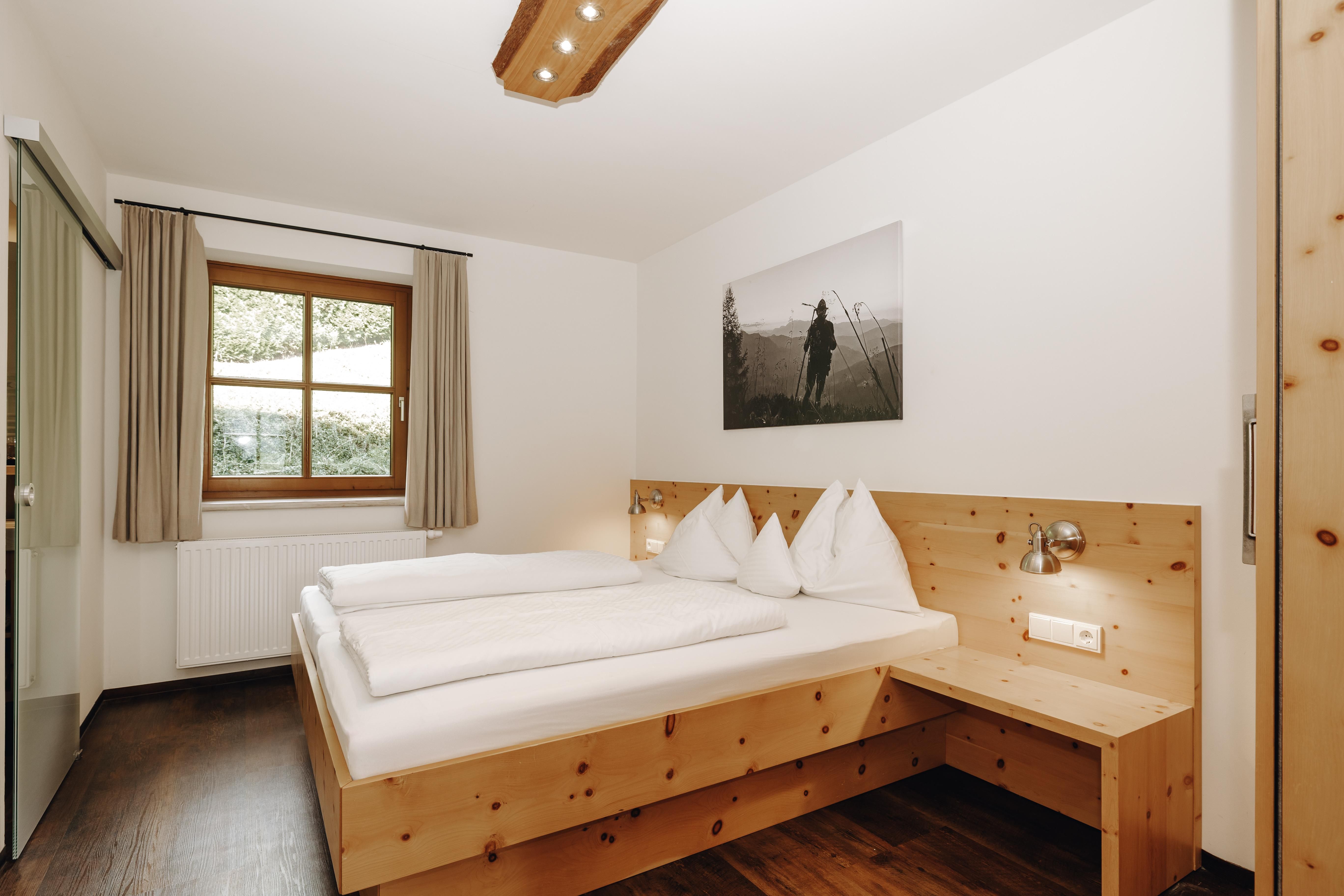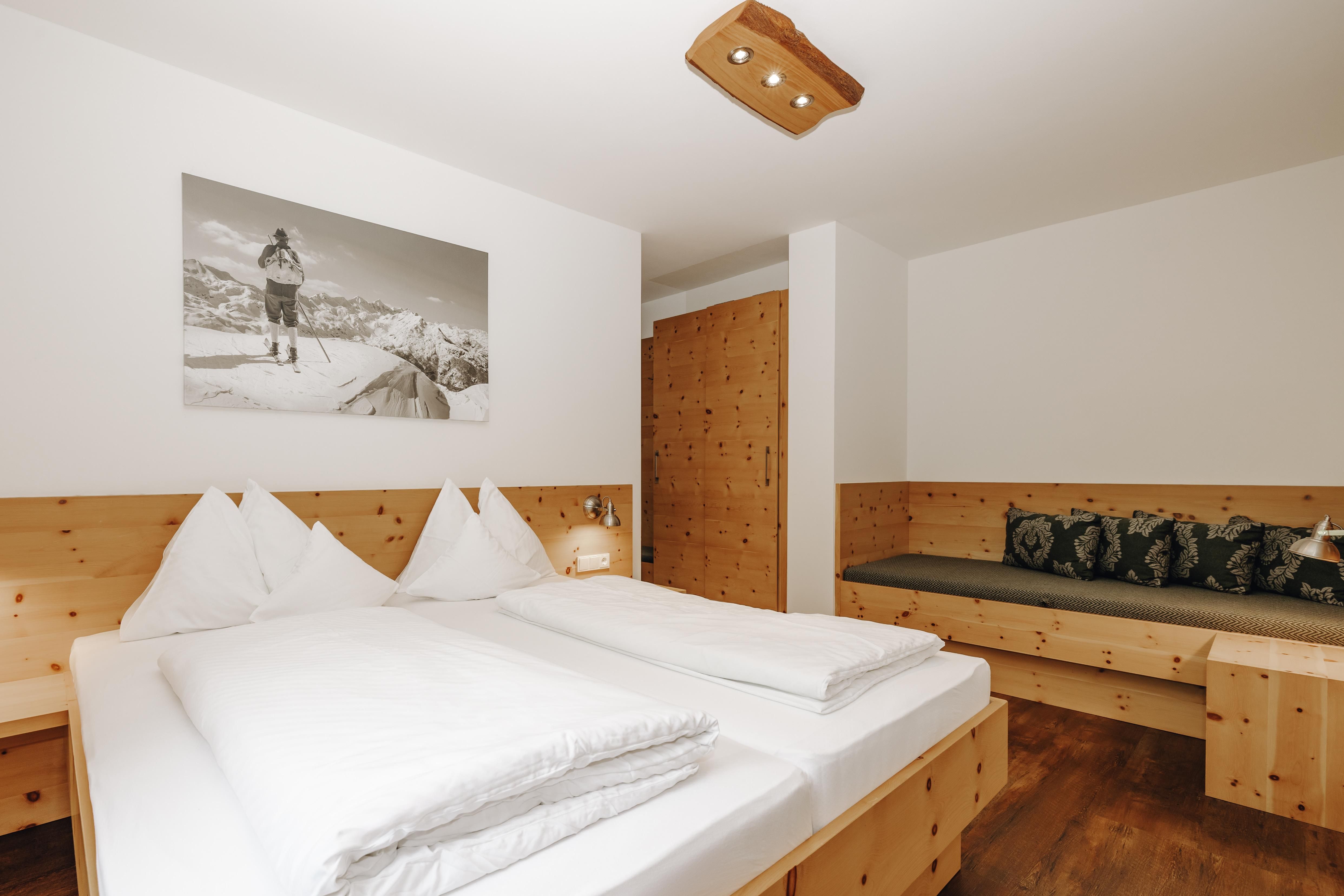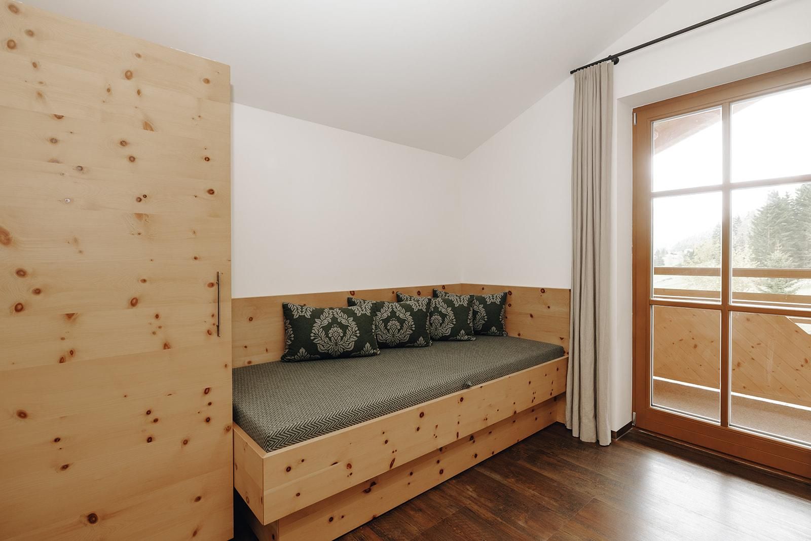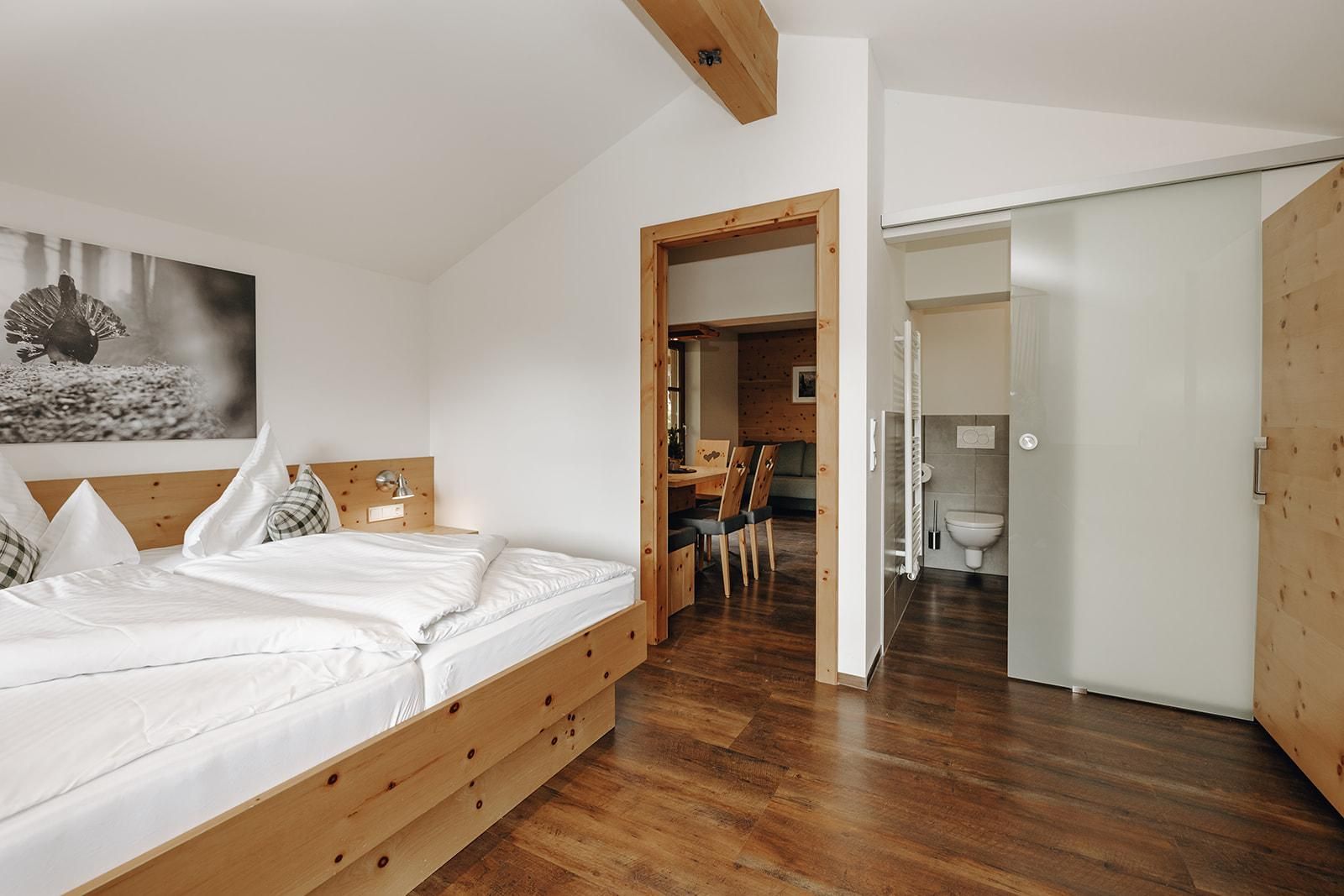 Luxus Komfort-Natur-Appartement in Zirbenholz, sep Wohnraum mit Küche, Sitzecke + Couch,Schlafzimmer (Doppelbett mit Couchliege), Bad mit Walk-In-Dusche/Toilette, Haarfön,Balkon,Flat-Screen mit Kabel-TV und Radio,Safe,private Sauna