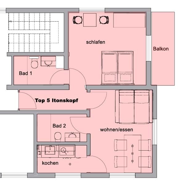 Das Appartement Itonskopf verfügt über ein Schlafzimmer mit Doppelbett, Badezimmer sowie einem Balkonbereich. Das Wohn- Esszimmer ist mit einer Couch mit Doppelbettfunktion ausgestattet und verfügt über ein zusätzliches Badezimmer. Das Appartement befindet sich im 2. Obergeschoss.