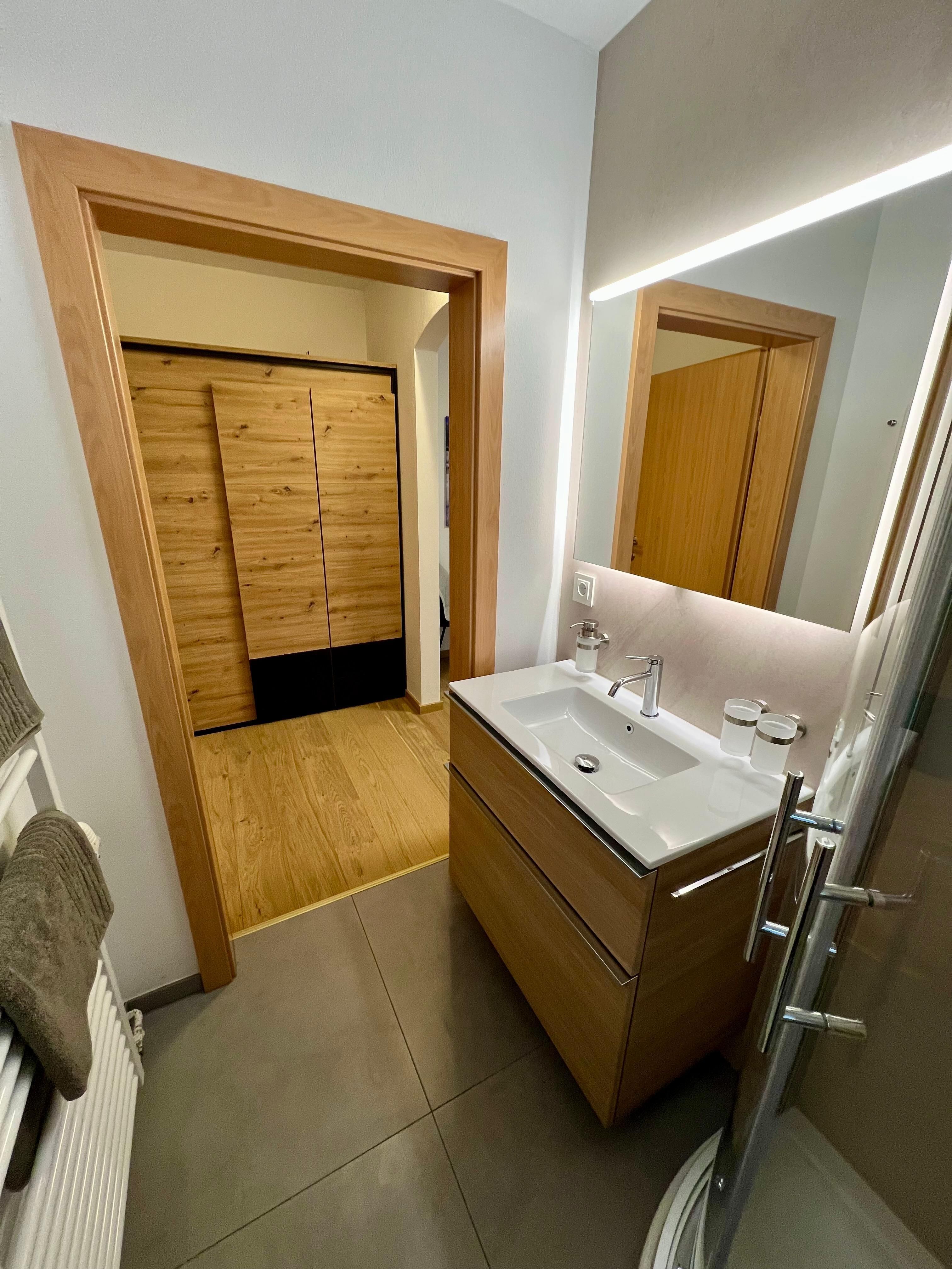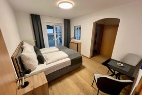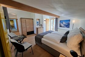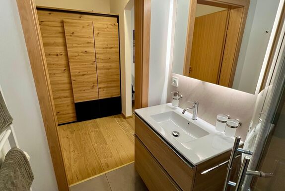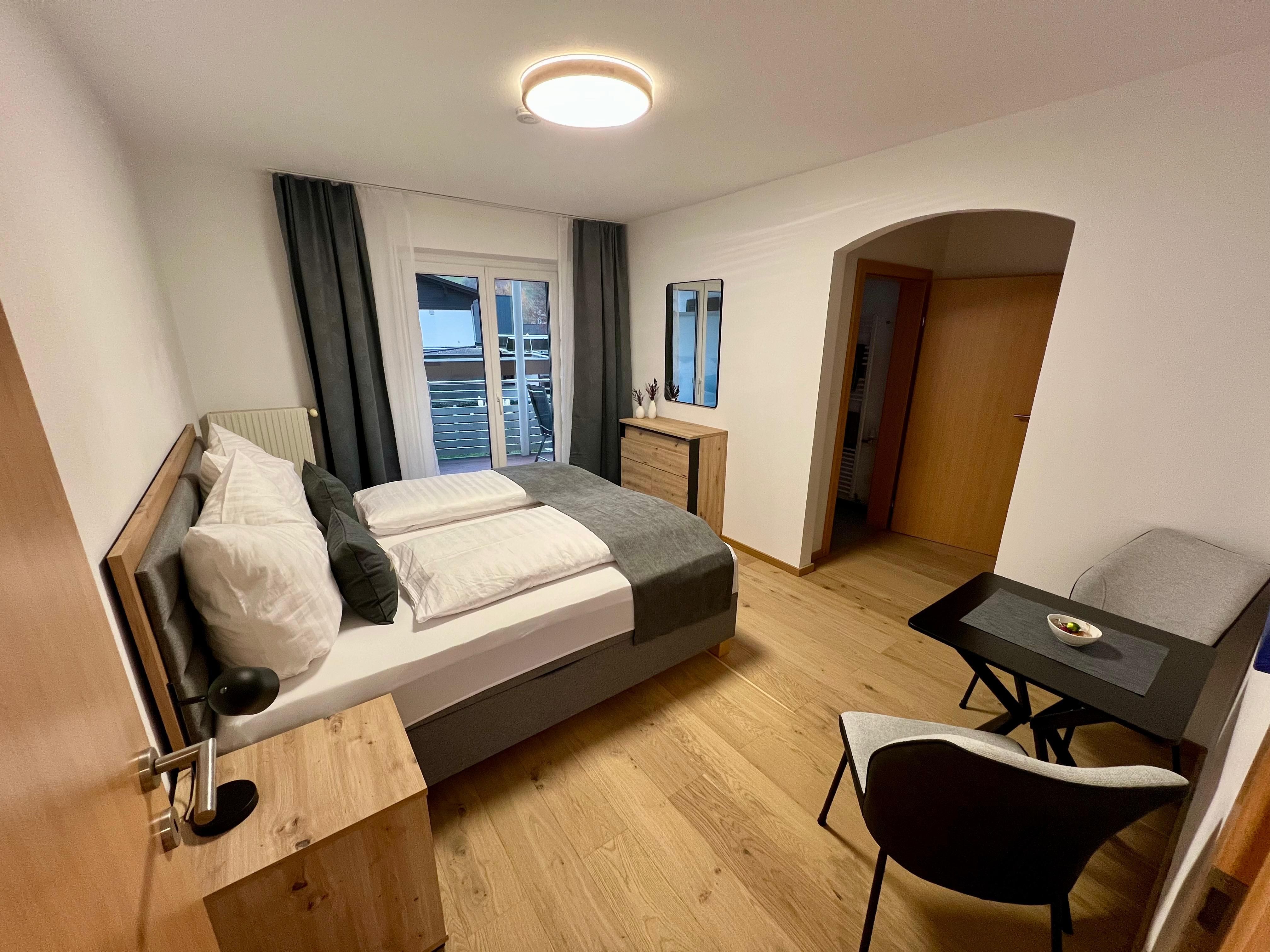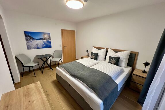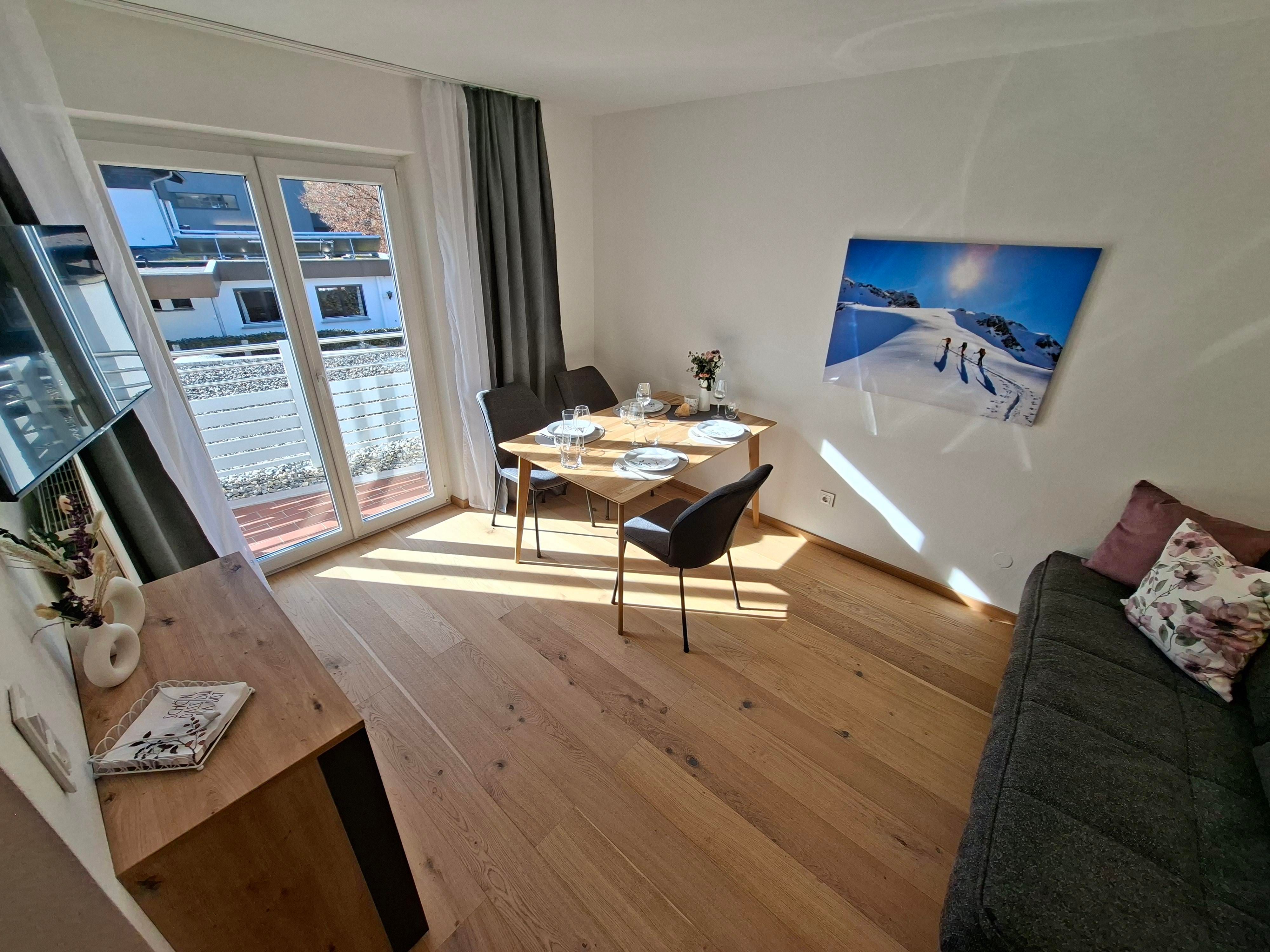 Das Appartement Zimba verfügt über 2 Schlafzimmer mit Boxspringbett und jeweils einem Badezimmer sowie einem eigenen Balkonbereich. Das Wohn- Esszimmer ist mit einer Couch mit Doppelbettfunktion ausgestattet. Das Appartement befindet sich im 1. Obergeschoss.