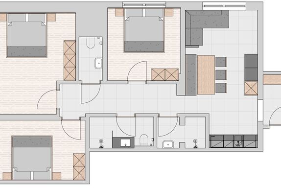 Unser neu renoviertes Appartement Talblick befindet sich im 2. Obergeschoss. Es verfügt über helle Räume die aufgeteilt sind in: 3 Schlafzimmer mit Doppelbetten, einer Wohnküche , einem Badezimmer mit Dusche und Waschbecken, einem Badezimmer mit Dusche, Waschbecken und Toilette und einem extra WC.