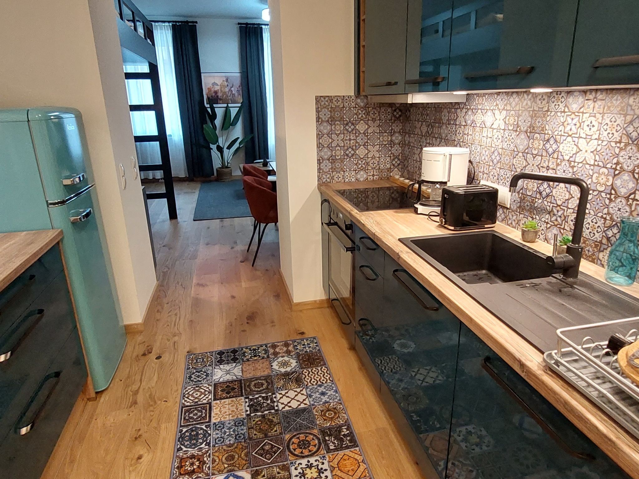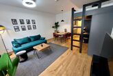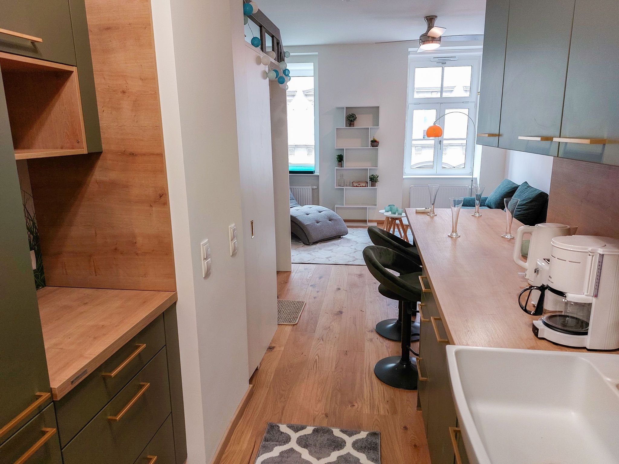 Premium Apartment Maria Hilf 1+2 Double, 2-Zimmer-Wohnung 84 m2 im 2. Stock. Objekt geeignet für 8 Erwachsene. Geräumig und hell, vollständig renoviert im Jahre 2023, sehr modern und geschmackvoll eingerichtet: Eingang. Offenes Wohn-/Schlafzimmer mit 1 x 1 Etagenbetten (180 cm, Länge 190 cm), 1 Ausziehbett (2 Pers.), Kabel-TV und Internationale TV-Sender (Flachbildschirm), Radio, CD und DVD. Offenes Wohn-/Schlafzimmer mit 1 x 1 Etagenbetten (150 cm, Länge 200 cm), 1 Ausziehbett (2 Pers.), Kabel-TV (Flachbildschirm), Radio, CD und Ventilator. Offene Küche im Eingang (8 Kochplatten, Geschirrspüler, Toaster, Wasserkocher, elektrische Kaffeemaschine). 2 Bäder/Duschen/WC. Heizung. Holzdielenboden. Zur Verfügung: Waschmaschine, Bügeleisen, Babybett, Haartrockner. Internet (WLAN, gratis). Bitte beachten: geeignet für Familien Wohnung auf Strassenseite. Nichtraucher-Unterkunft. Achtung: es handelt sich um 2 separate Apartments für je 4 Personen die nebeneinander liegen. Highspeed-Internet.