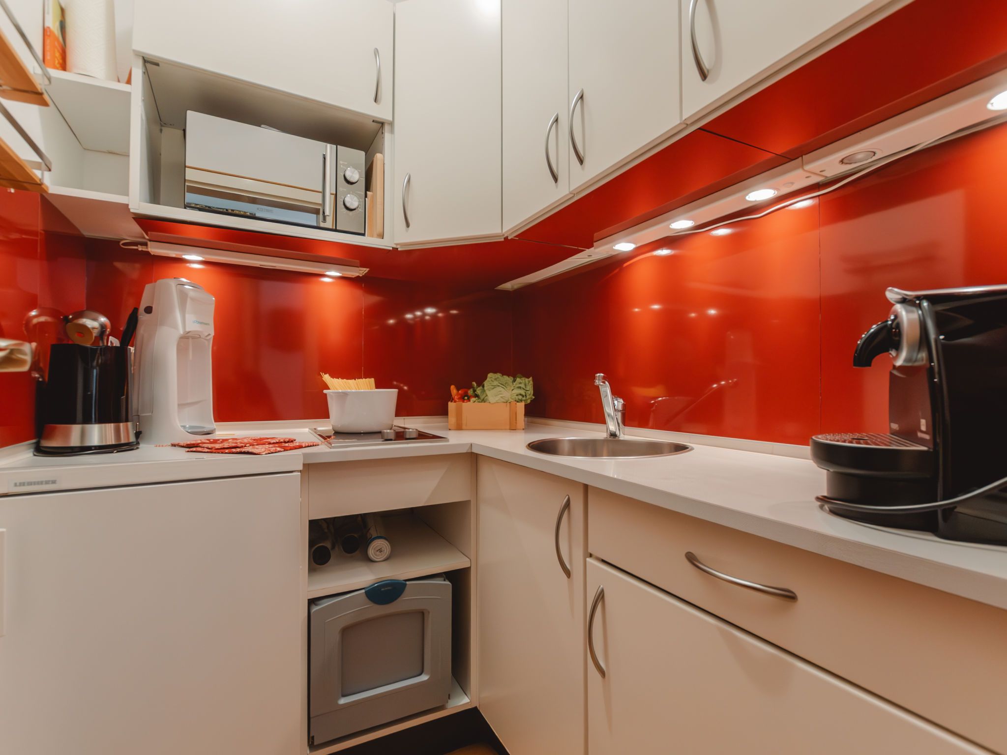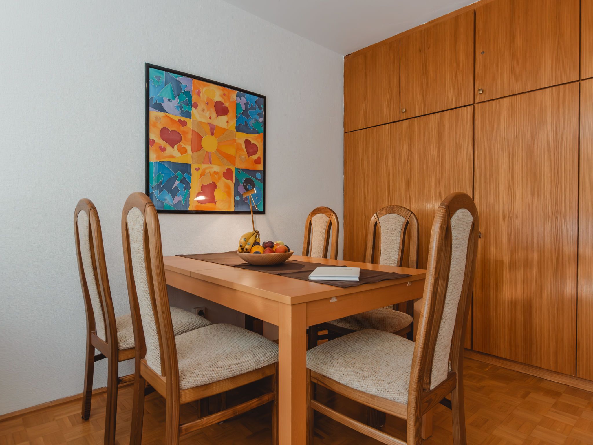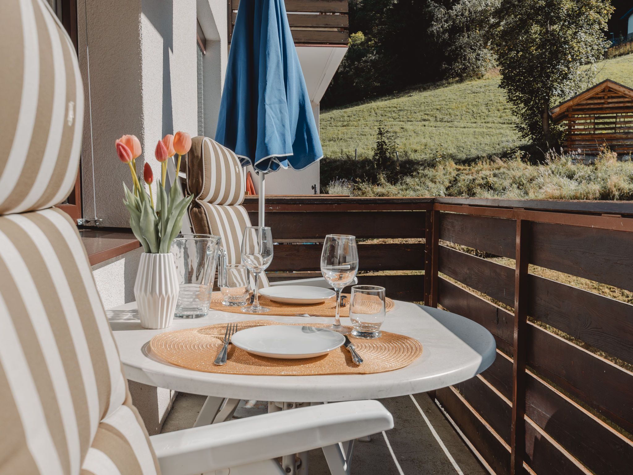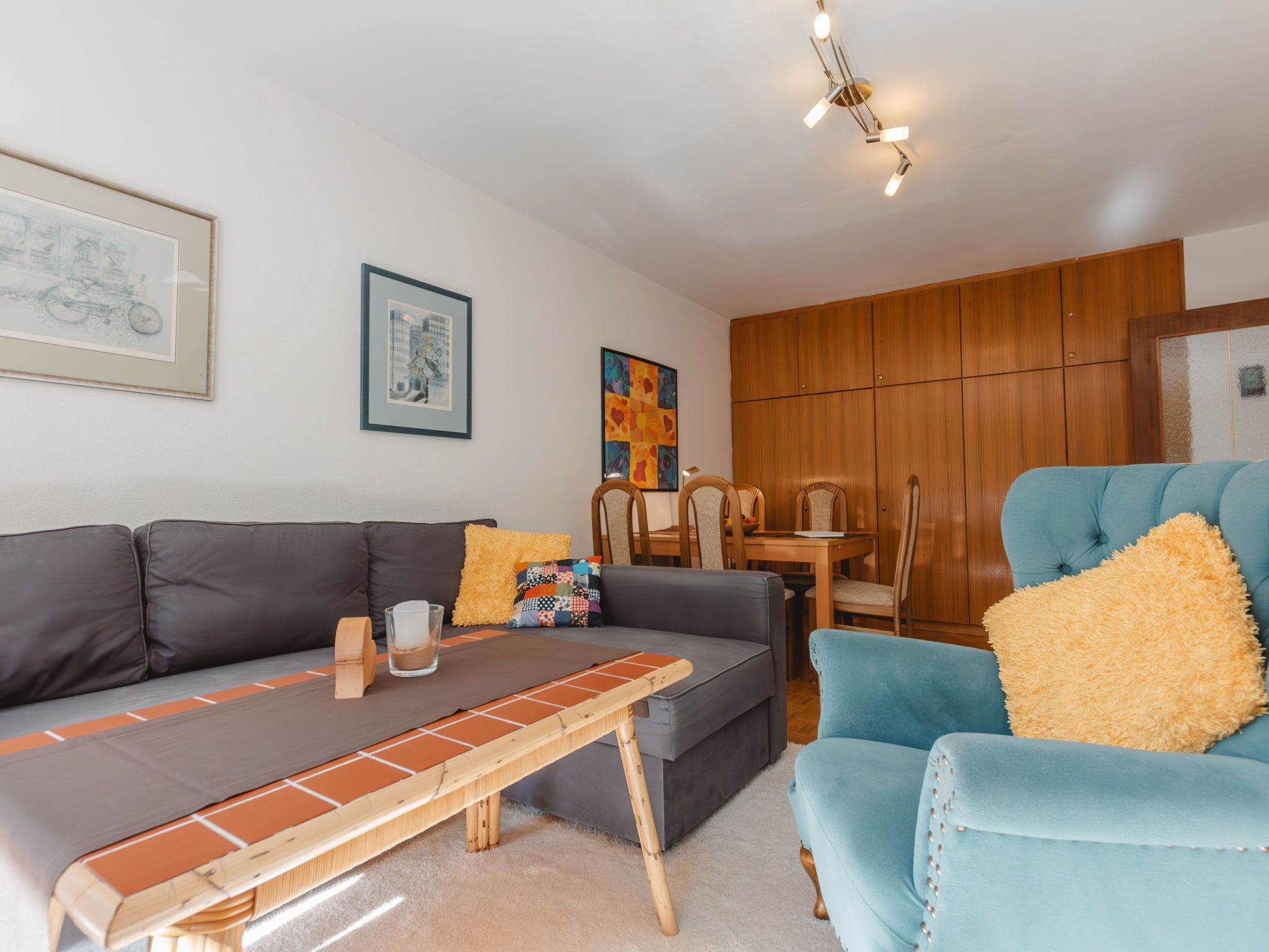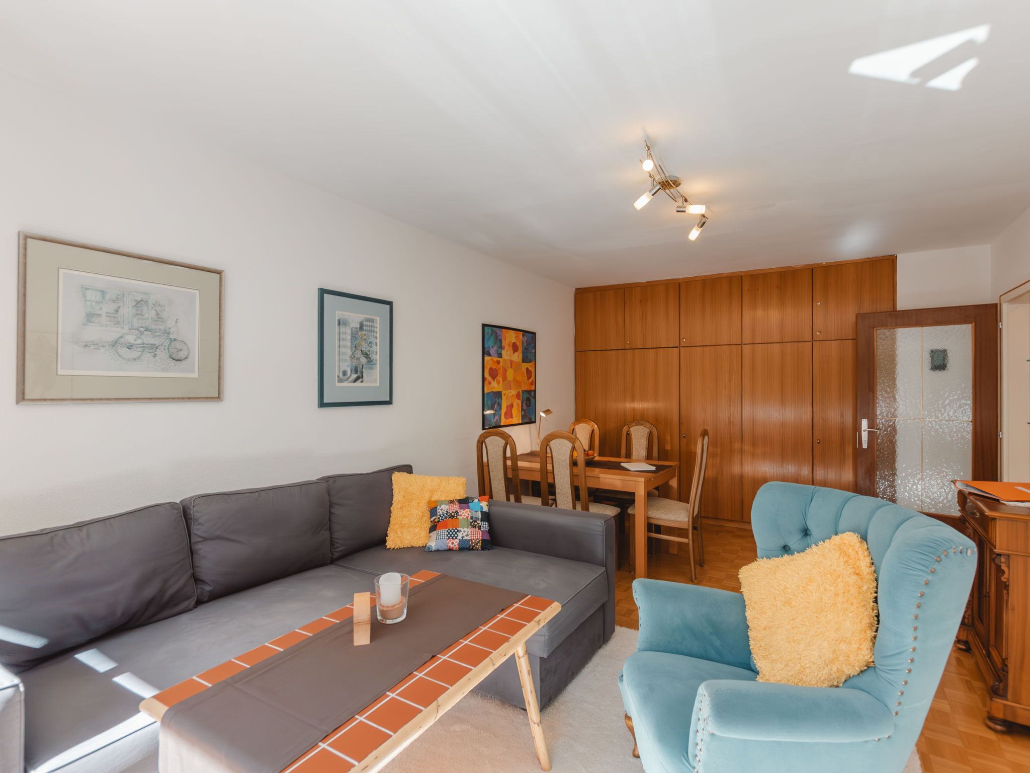 Murmeltier, 2-Zimmer-Wohnung 47 m2 im 2. Stock. Hell, sehr geschmackvoll eingerichtet: Eingang. Wohn-/Schlafzimmer mit 1 Doppeldiwanbett, Esstisch und Kabel-TV (Flachbildschirm). Ausgang zum Balkon. 1 Doppelzimmer mit 1 Doppelbett (160 cm, Länge 200 cm). Kleine Küche (2 Kochplatten, Toaster, Wasserkocher, Mikrowelle, elektrische Kaffeemaschine, Kapseln für die Kaffeemaschine (Nespresso) extra). Bad/WC. Holzdielenboden. Balkon 6 m2. Balkonmöbel. Sehr schöne Sicht auf die Berge. Bitte beachten: geeignet für Familien. Rauchmelder. 50403-000468-2022