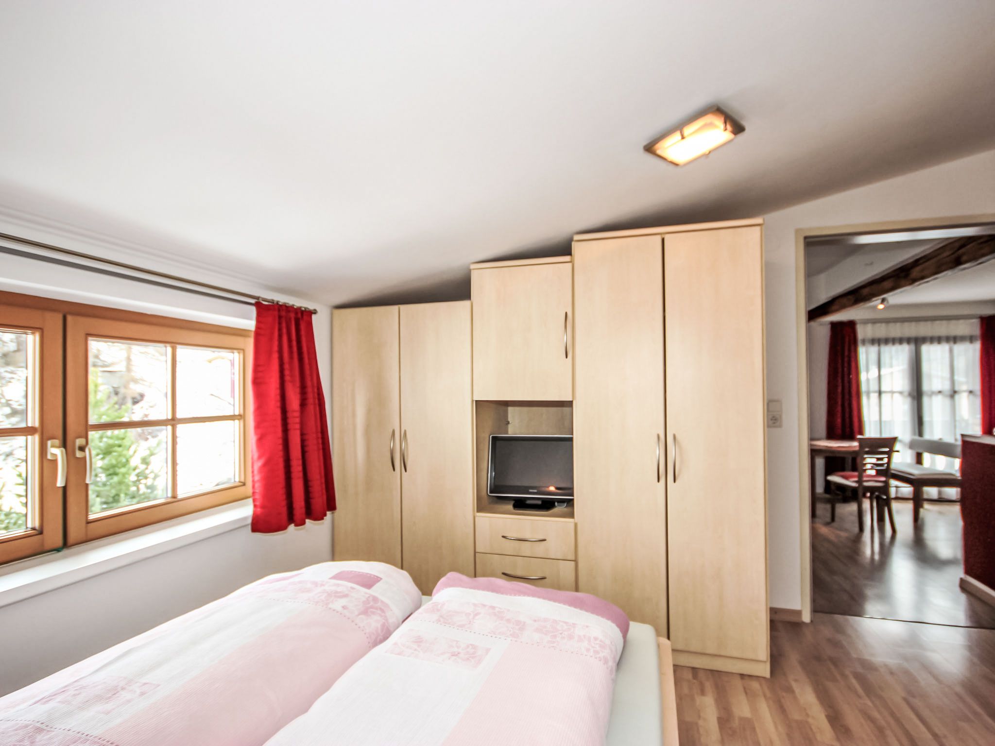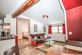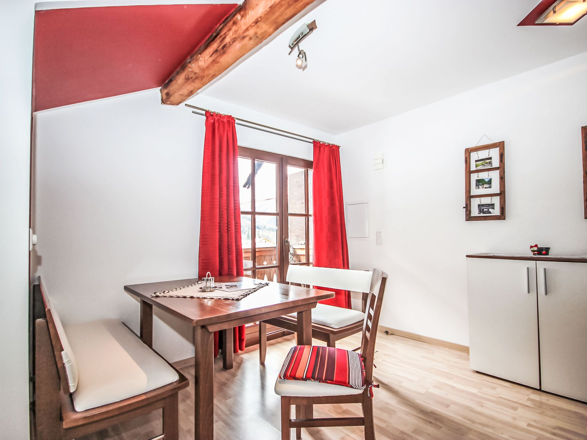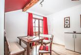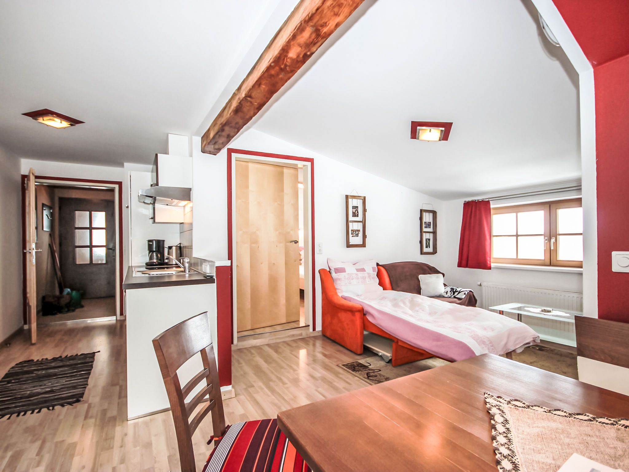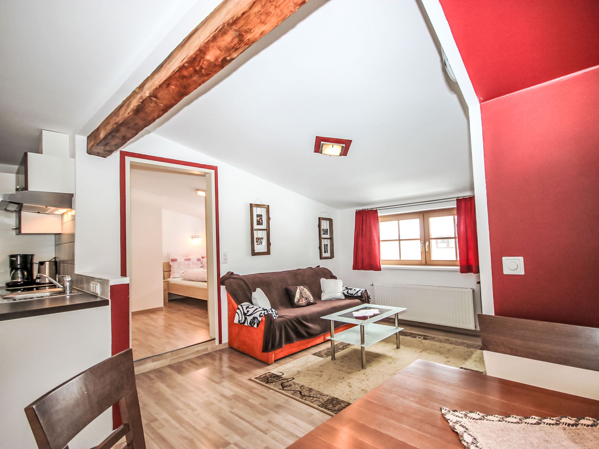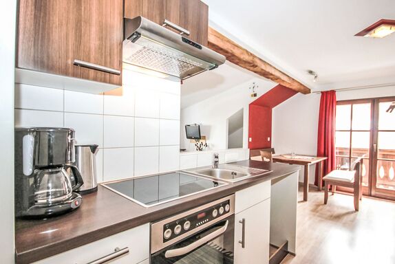 Gamsblick, 2-Zimmer-Wohnung 50 m2, im Dachgeschoss. Objekt geeignet für 2 Erwachsene + 2 Kinder. Teilweise abgeschrägt, schön und gemütlich eingerichtet: Eingang. 1 Zimmer mit 1 franz. Bett (140 cm, Länge 200 cm), Kabel-TV (Flachbildschirm). Wohn-/Schlafzimmer mit 1 Doppeldiwanbett, Esstisch und Kabel-TV (Flachbildschirm). Ausgang zum Balkon. Offene Küche (Backofen, Tiefkühler, elektrische Kaffeemaschine). Dusche/WC. Balkon, Südlage. Abstellkammer. Herrliche Sicht auf die Berge und die Landschaft. Zur Verfügung: Internet (Wireless LAN, gratis). Bitte beachten: eigener Eingang, Rauchmelder, kein Fahrstuhl. Parkplatz hinter dem Haus!