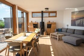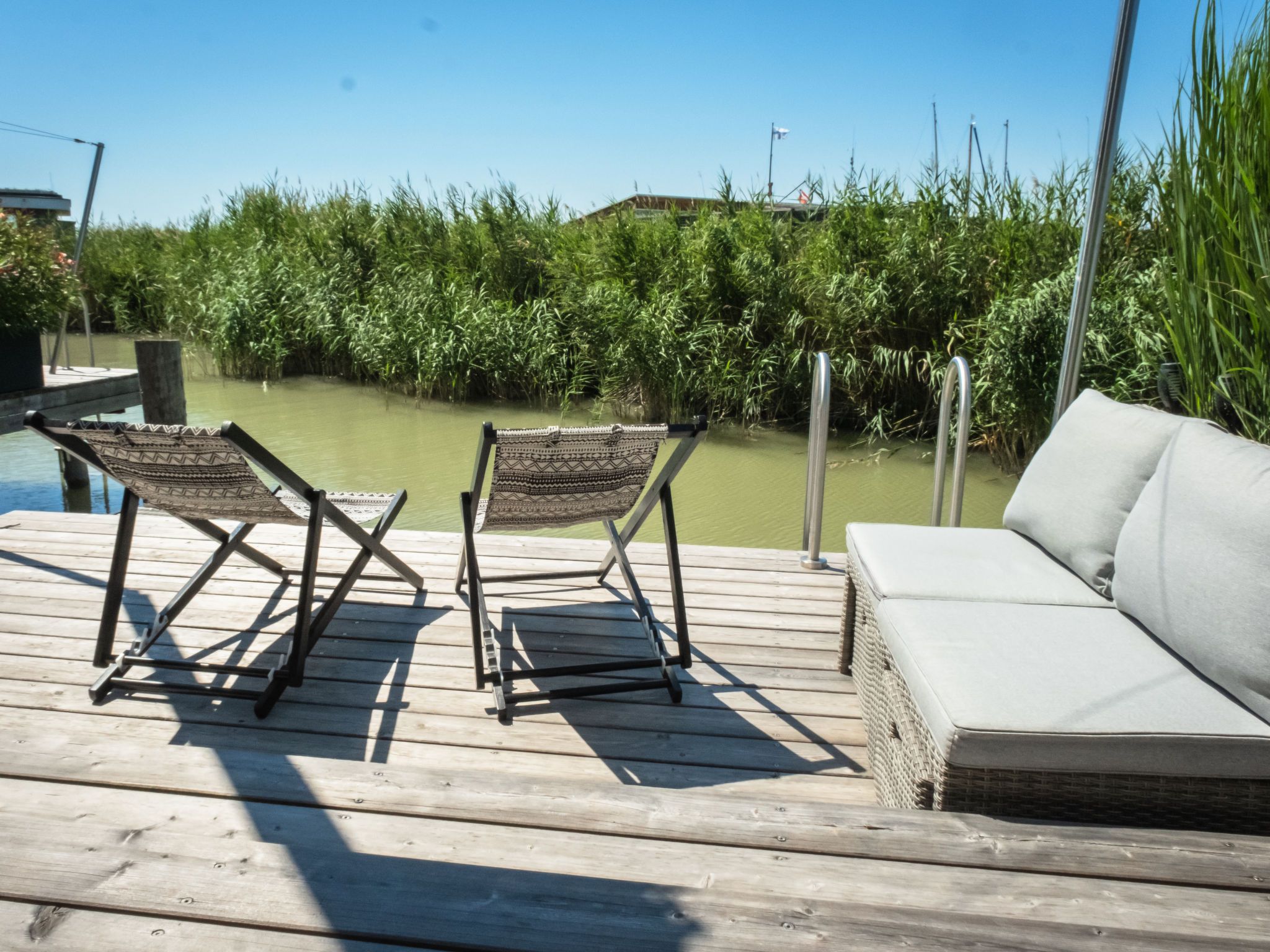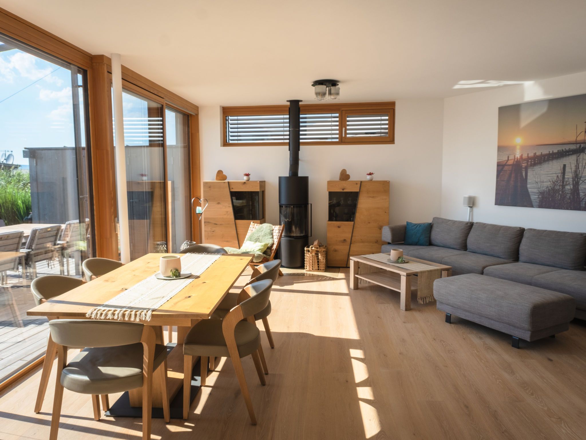 Relax Lodge am See, 4-Zimmer-Reihenhaus 110 m2 auf 2 Stockwerken. Hell, sehr komfortabel und gemütlich eingerichtet: Wohn-/Schlafzimmer mit Schiebetür, Panoramafenster mit 1 Doppeldiwanbett, Schwedenofen und Esstisch. Ausgang zur Terrasse. Abgeschrägte, offene Küche (Backofen, Geschirrspüler, 4 Glaskeramikplatten, Toaster, Wasserkocher, Mikrowelle, Tiefkühler, elektrische Kaffeemaschine). Sep. WC. Obergeschoss: 1 grosses Doppelzimmer mit Panoramafenster. Ausgang zum Balkon. 1 Doppelzimmer mit Sat-TV und Internationale TV-Sender (Flachbildschirm). 1 kleines Zimmer, ohne Schrank mit 1 franz. Bett (1 x 160 cm, Länge 200 cm). Bad/Dusche, sep. WC, Doppelwaschbecken, Whirlbadewanne. Parkettboden. Grosse Terrasse 50 m2. Terrassenmöbel, Liegestühle (4), Abstellkammer. Sehr schöne Sicht auf die Lagune. Zur Verfügung: Waschmaschine, Wäschetrockner, Bügeleisen, Holz (gratis). Internet (Wireless LAN). Parkplatz, Garage Nr. 13 auf dem Grundstück. E-Ladestation. Bitte beachten: Nichtraucher-Unterkunft. Private Bootsanlegestelle. Eigener Eingang, Rauchmelder. Keine Partys und Veranstaltungen erlaubt!