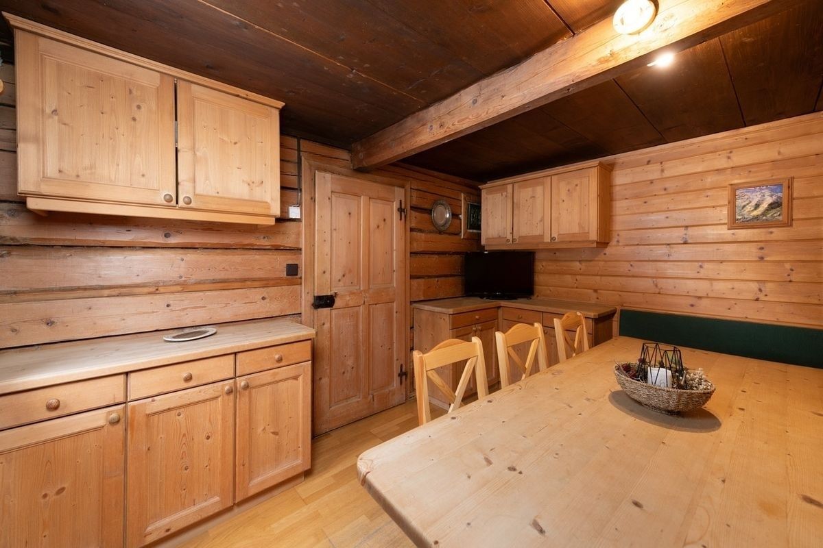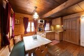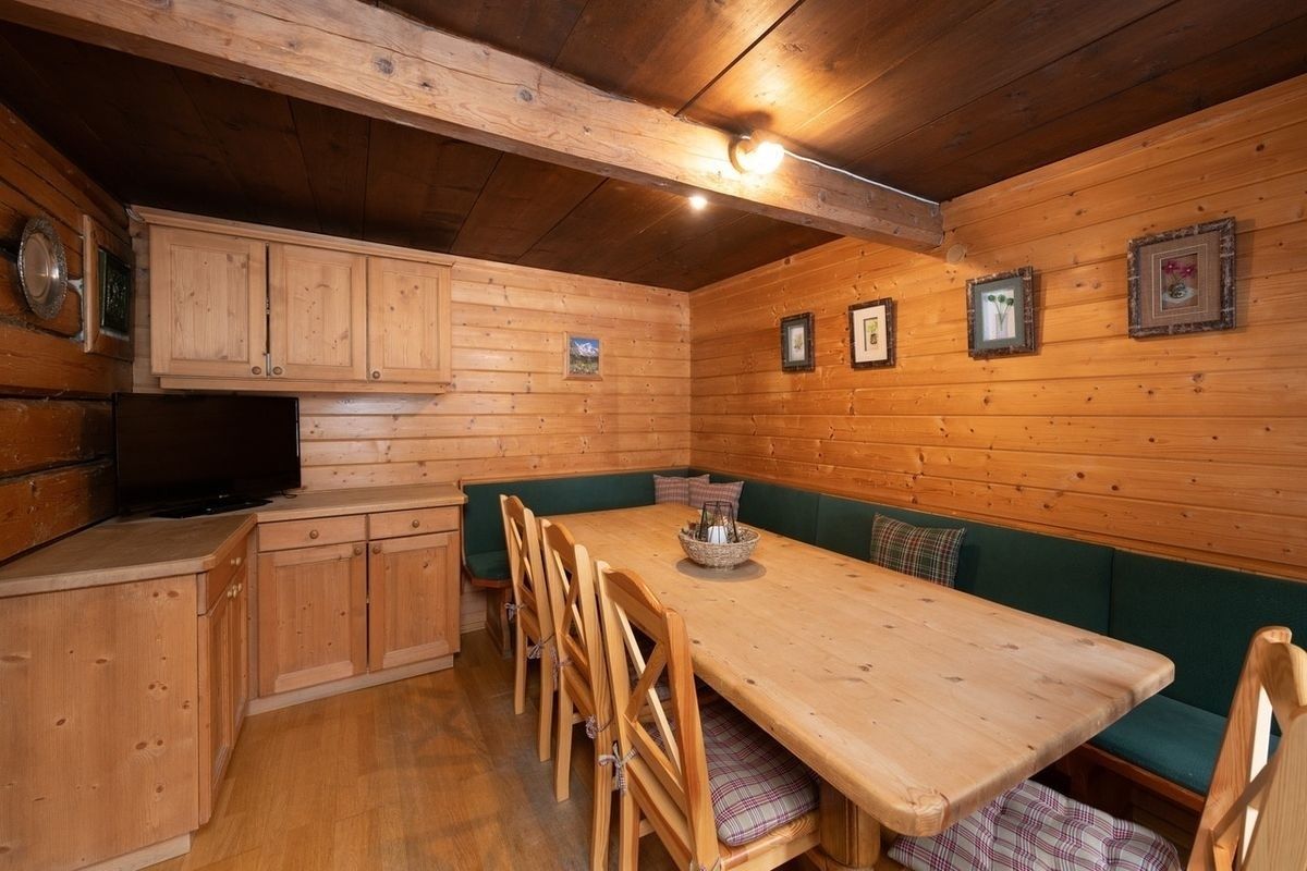 Ein separates Esszimmer mit großem Esstisch, Eckbank und Stühlen bietet ausreichend Platz für gemeinsame Mahlzeiten und lange Hüttenabende.