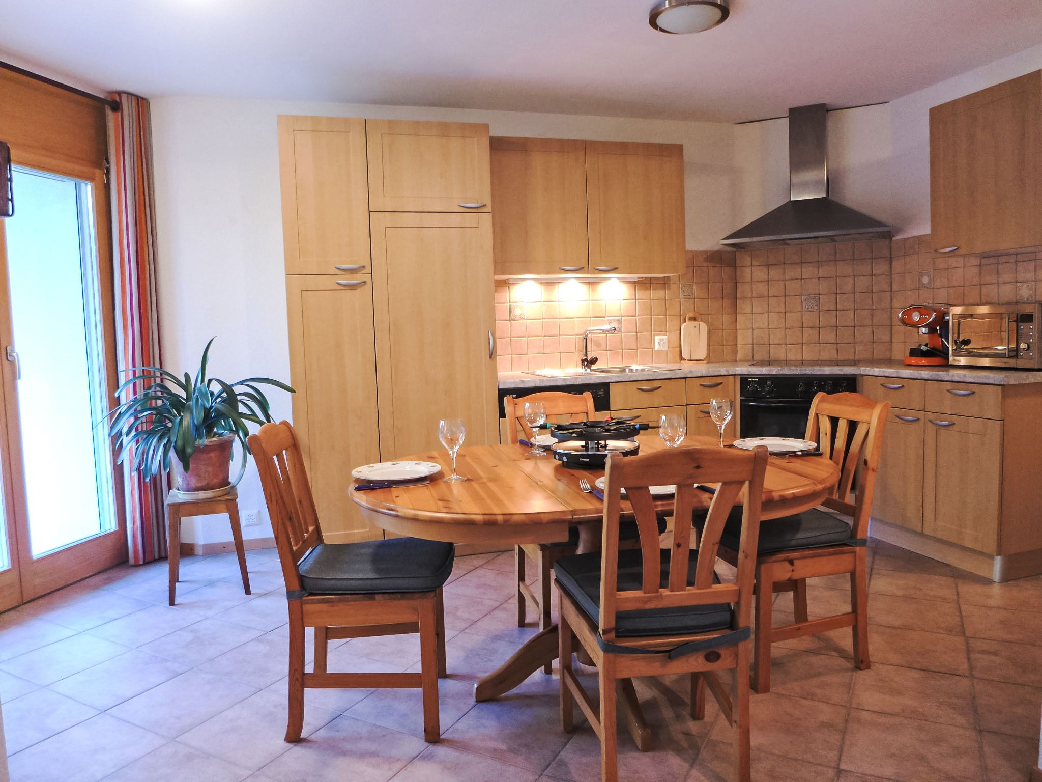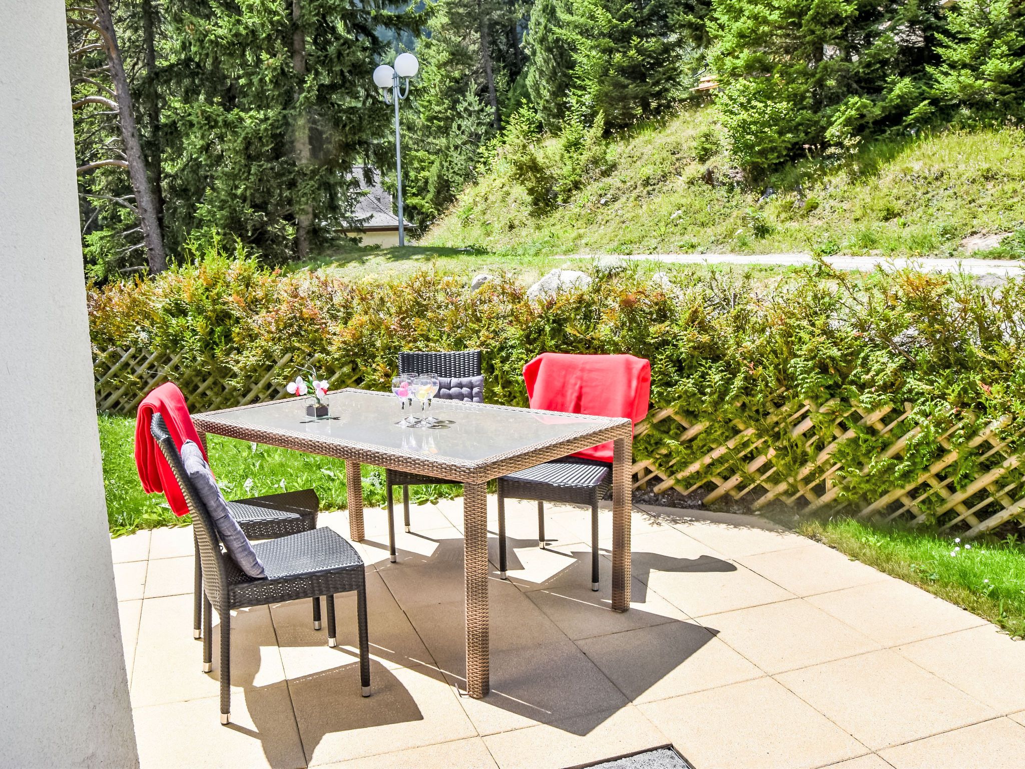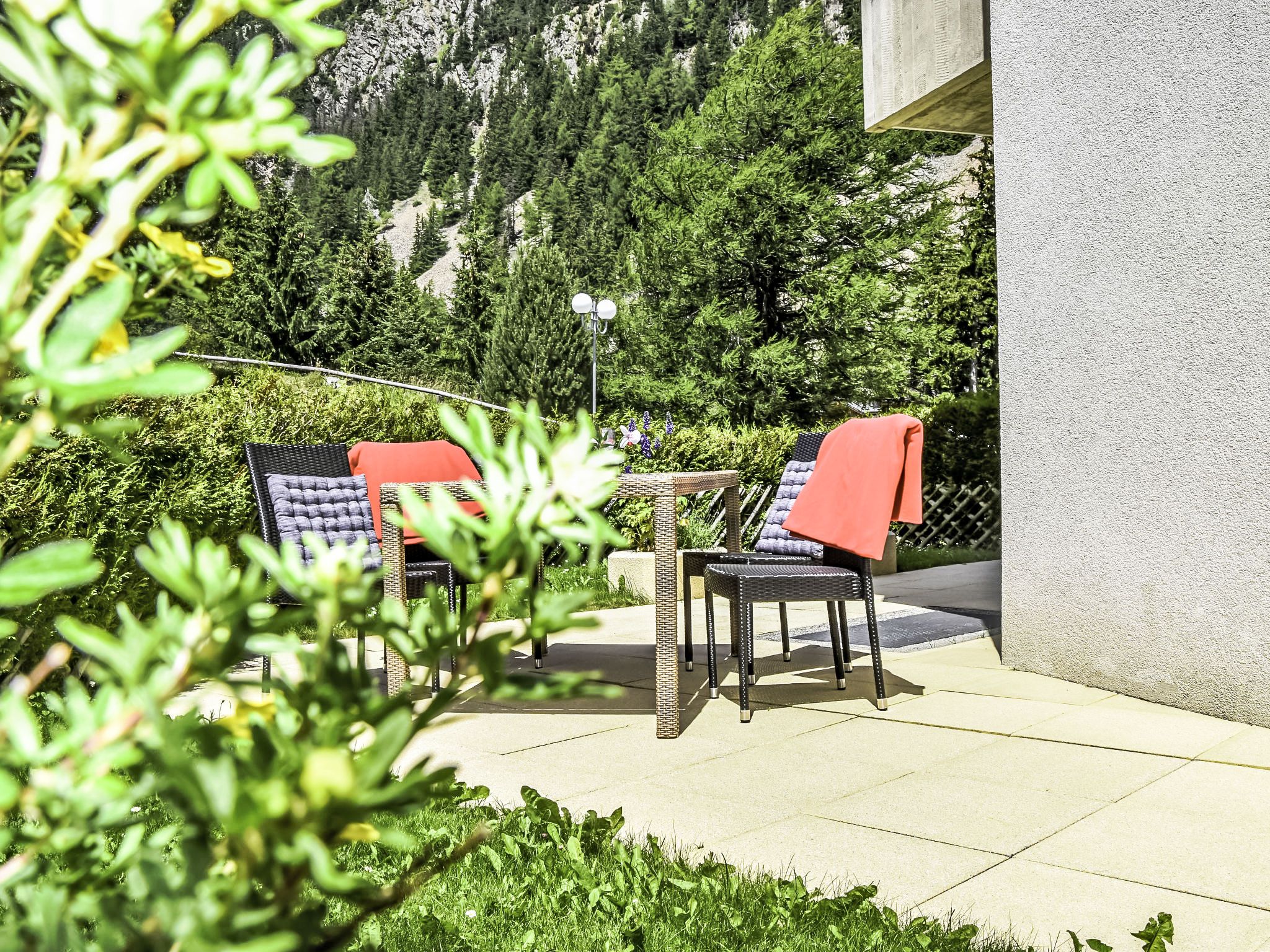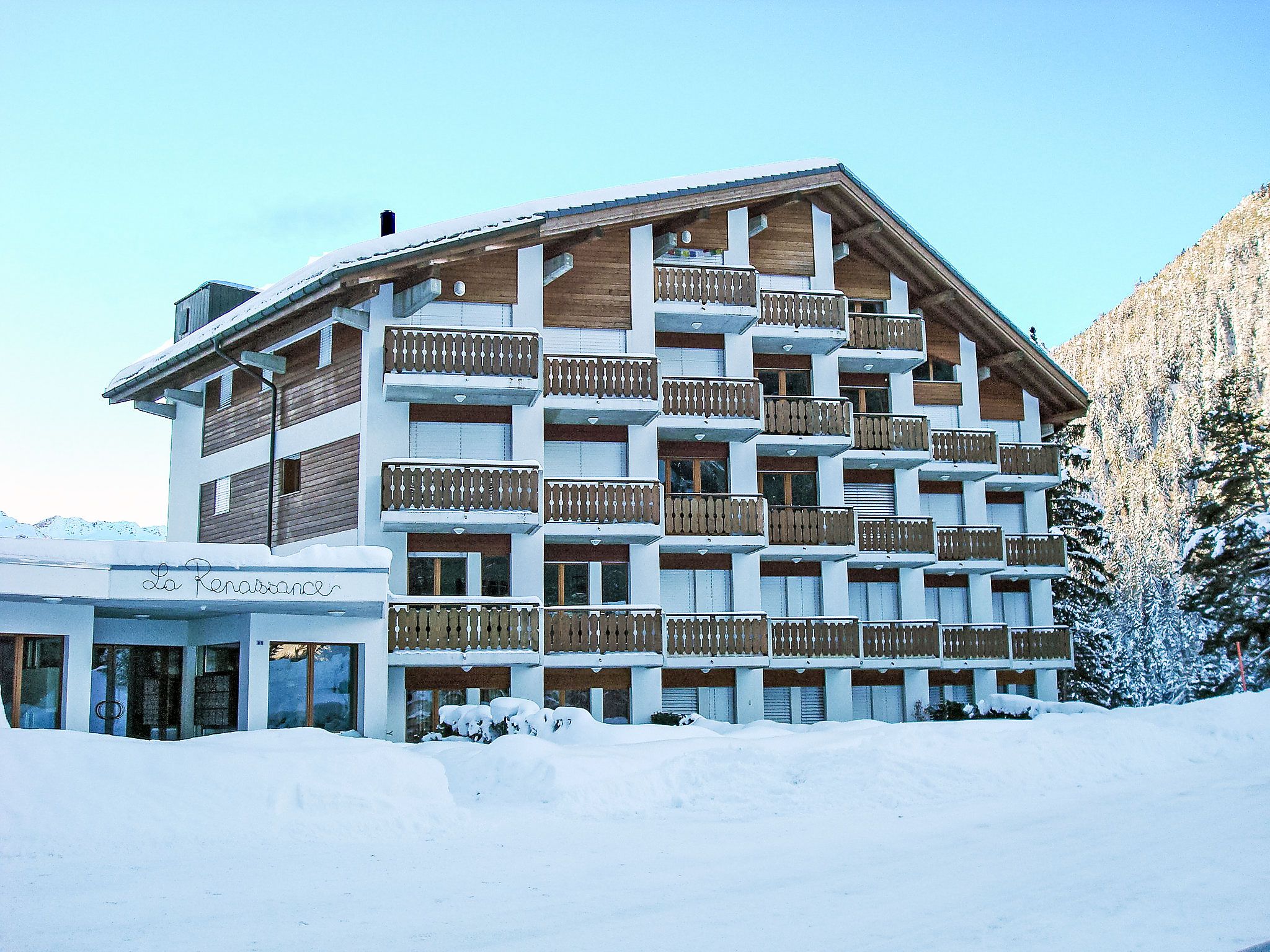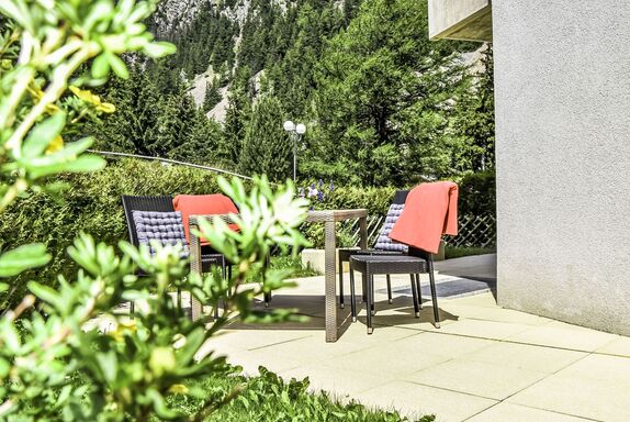 Renaissance 5, 3-Zimmer-Wohnung 75 m2, im Erdgeschoss. Komfortabel und schön eingerichtet: Wohn-/Esszimmer mit Kabel-TV. Ausgang zur Terrasse, zum Gartensitzplatz. 1 Zimmer mit 1 franz. Bett (160 cm, Länge 200 cm). 1 Zimmer mit 2 Betten (90 cm, Länge 200 cm). Kochnische (Backofen, Geschirrspüler, 4 Glaskeramikplatten, Fondue Set (Käse)) mit Esstisch. Ausgang zur Terrasse, zum Gartensitzplatz. Bad/WC, Dusche/WC. Kleine Terrasse, Gartensitzplatz. Terrassenmöbel, Liegestühle (2). Schöne, auf die Berge. Zur Verfügung: Internet (WLAN). Parkplatz Nr. 10, Garage Nr. i. Bitte beachten: Nichtraucher-Unterkunft. Maximal 1 Haustier/Hund erlaubt.