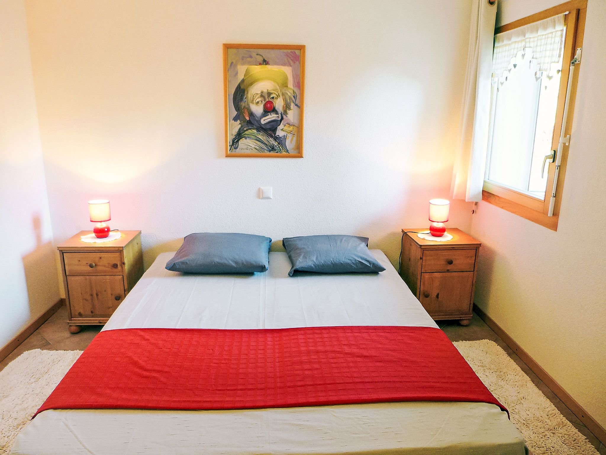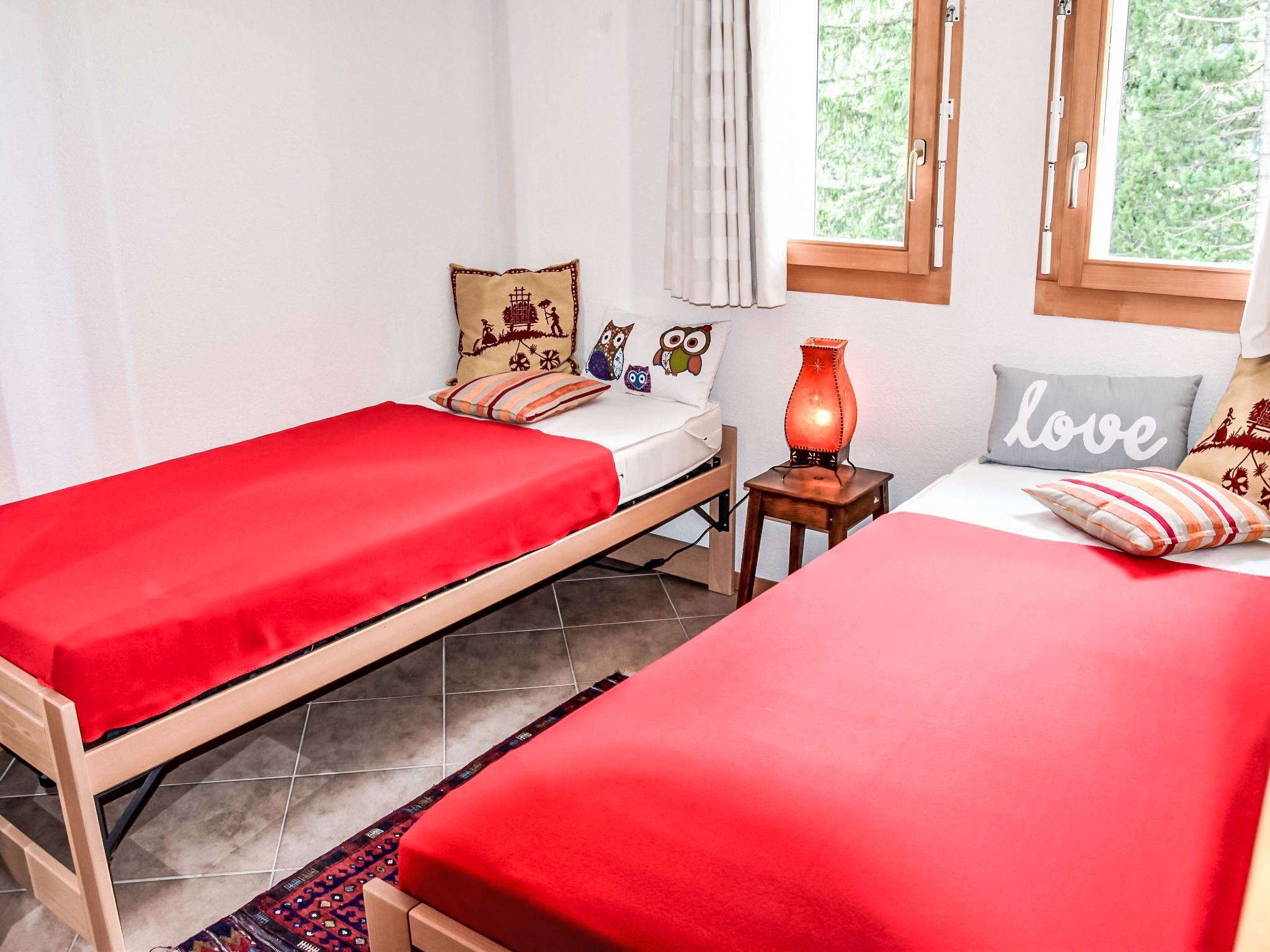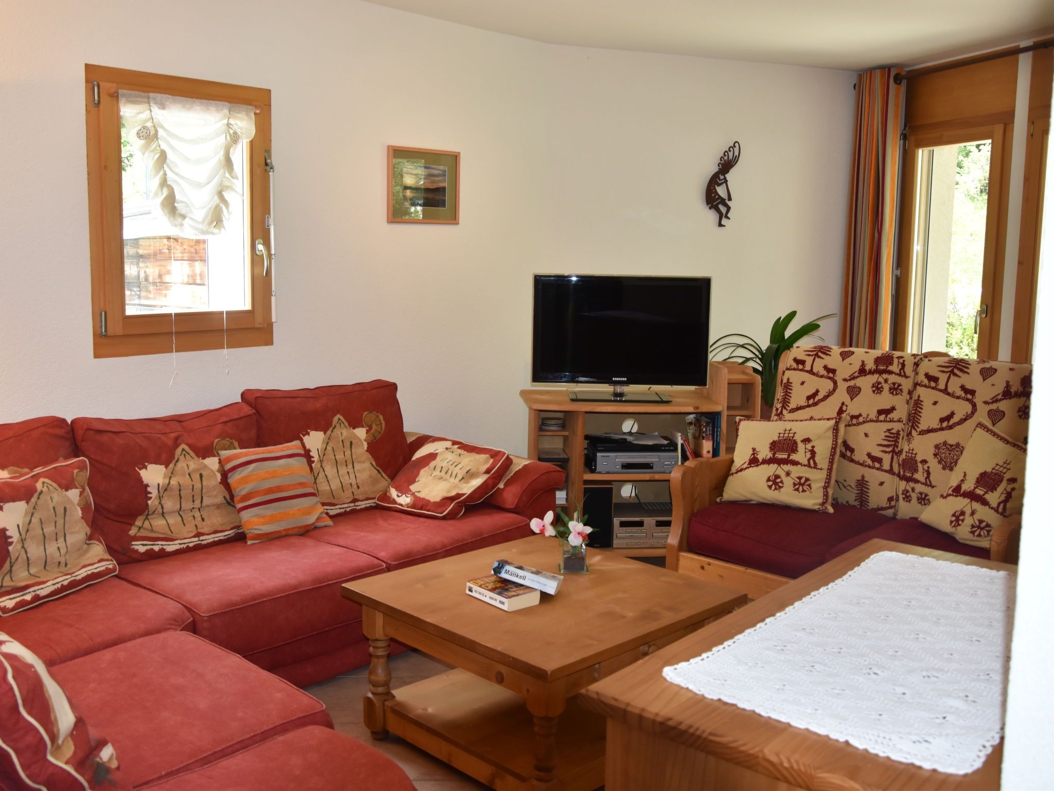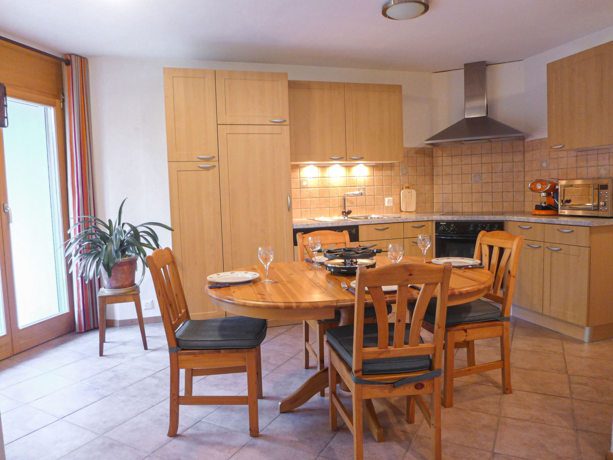 Renaissance 5, 3-Zimmer-Wohnung 75 m2, im Erdgeschoss. Komfortabel und schön eingerichtet: Wohn-/Esszimmer mit Kabel-TV. Ausgang zur Terrasse, zum Gartensitzplatz. 1 Zimmer mit 1 franz. Bett (160 cm, Länge 200 cm). 1 Zimmer mit 2 Betten (90 cm, Länge 200 cm). Kochnische (Backofen, Geschirrspüler, 4 Glaskeramikplatten, Fondue Set (Käse)) mit Esstisch. Ausgang zur Terrasse, zum Gartensitzplatz. Bad/WC, Dusche/WC. Kleine Terrasse, Gartensitzplatz. Terrassenmöbel, Liegestühle (2). Schöne, auf die Berge. Zur Verfügung: Internet (WLAN). Parkplatz Nr. 10, Garage Nr. i. Bitte beachten: Nichtraucher-Unterkunft. Maximal 1 Haustier/Hund erlaubt.
