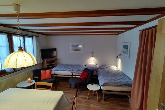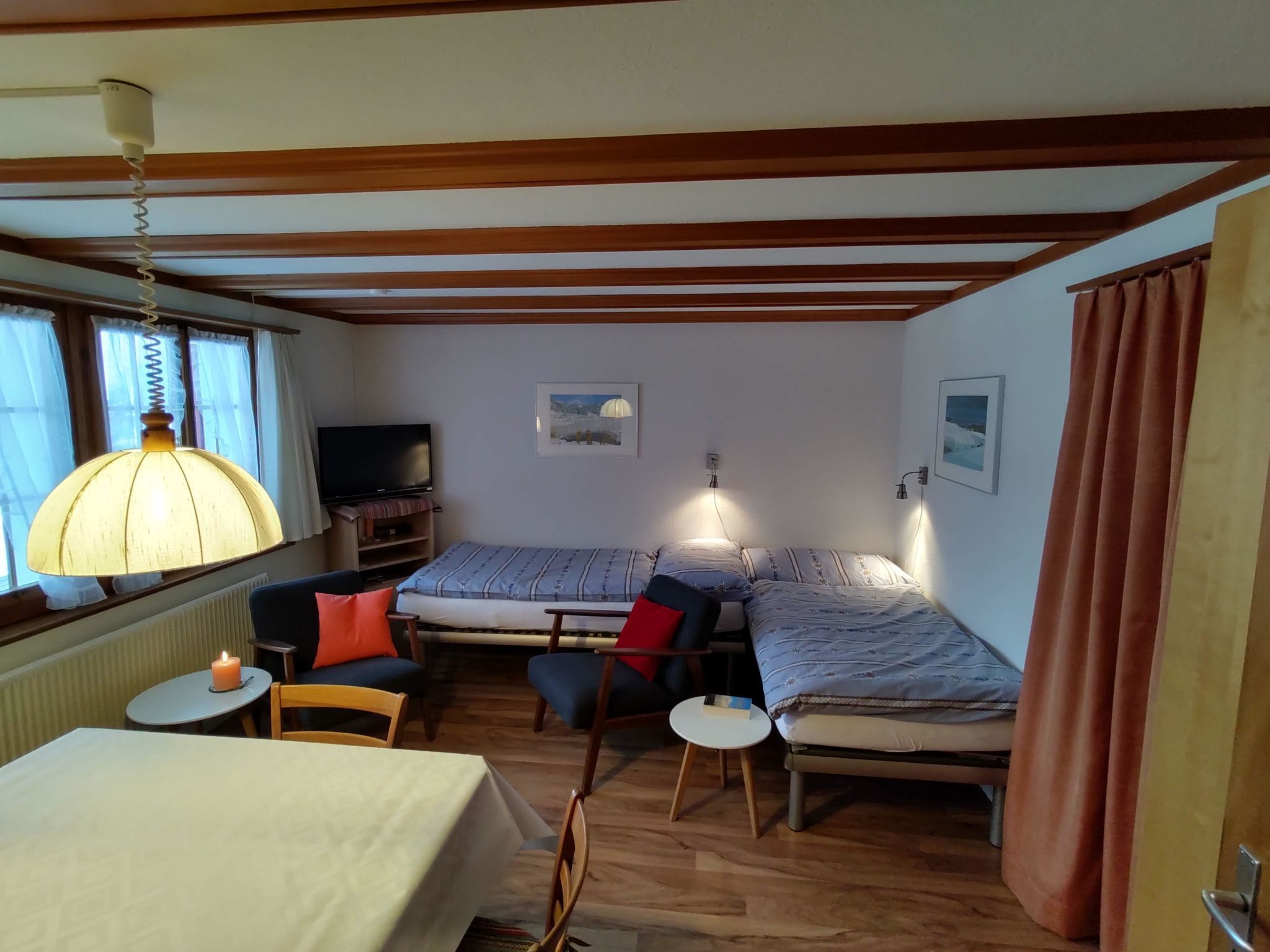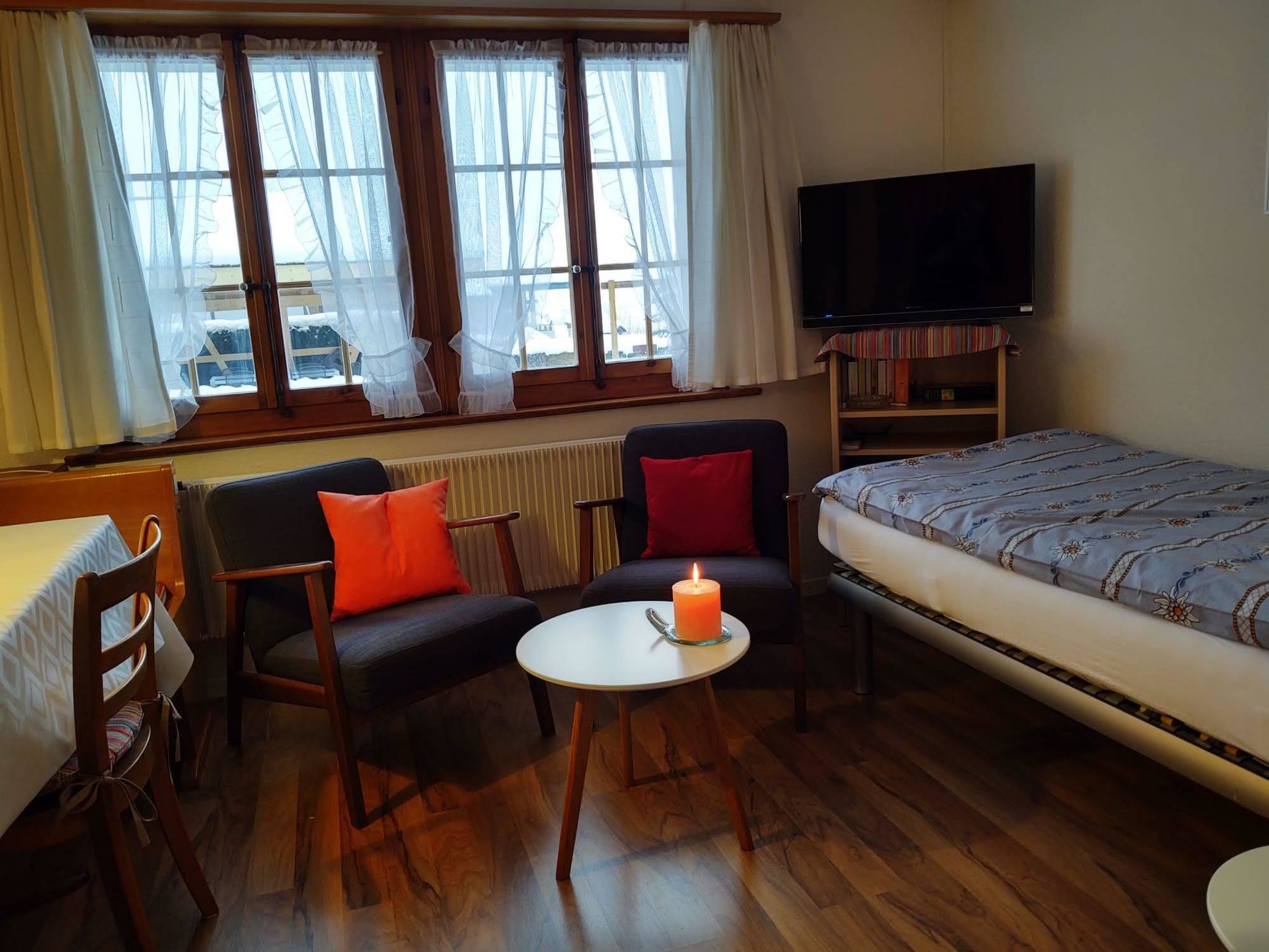 25 m2. Weitere Angaben des Anbieters: Ortstypisches Mehrfahmilienhaus mit vier Wohnungen an ruhiger, sonniger Lage in der Nähe des Dorfes Lenk. Eigener Parkplatz beim Haus vorhanden. Ein kurzer fünfminütiger Fussweg führt Sie ins Dorf. 25m2 grosse Wohnung im Parterre mit einem Schlaf- / Wohnraum mit zwei Einzelbetten. Badezimmer mit WC / Dusche und kleiner Kochgelegenheit. ÖV inklusive im Simmental und Saanenland mit der SIMMENTAL CARD: Übernachtungsgäste in der Ferienregion Lenk-Simmental fahren mit einer gültigen Gästekarte kostenlos mit dem öffentlichen Verkehr für Ausflüge. Inkl. Strom, Parkplatz, Wasser, Küchen- und Badezimmerwäsche, Bettwäsche, Endreinigung.