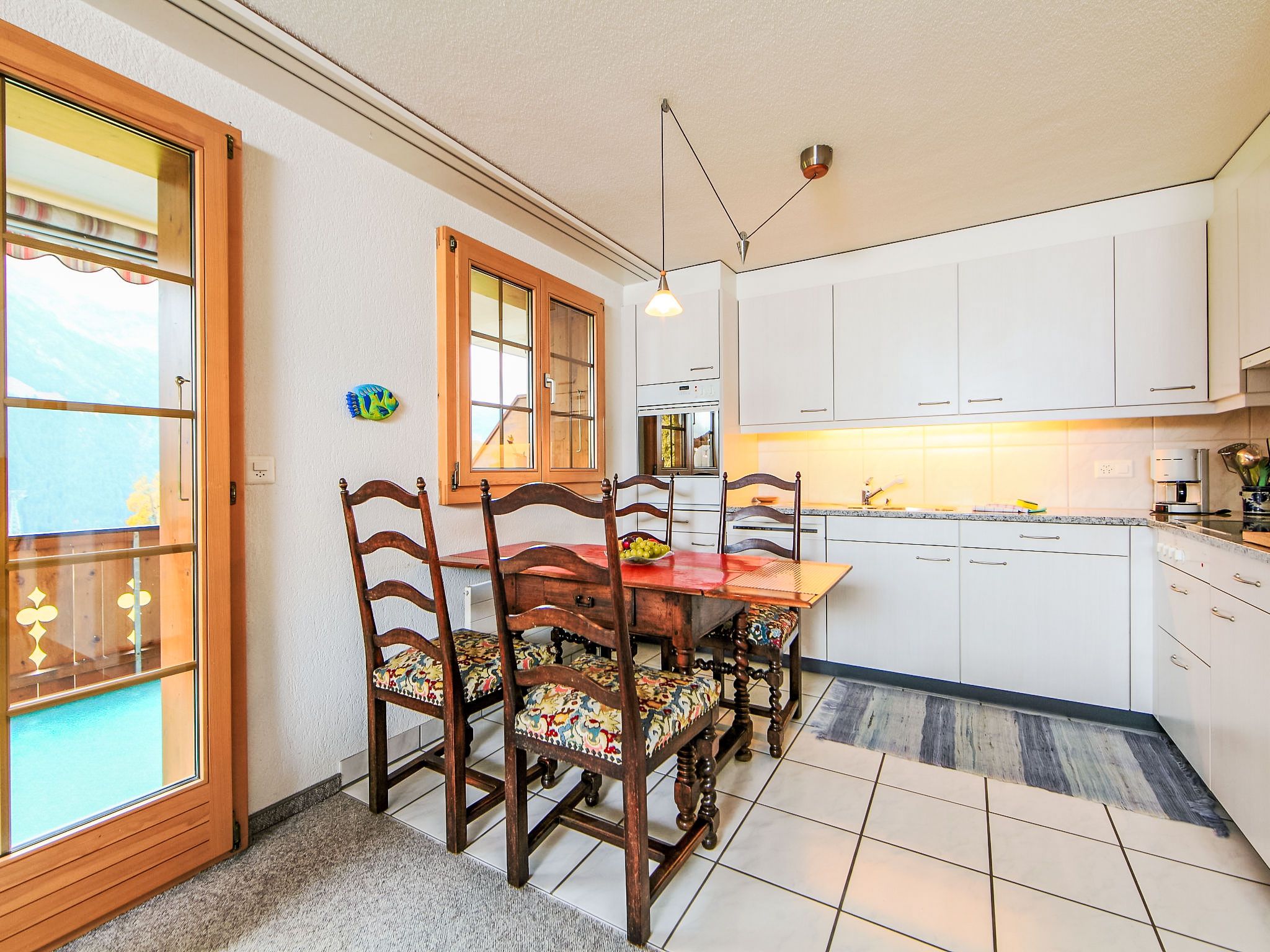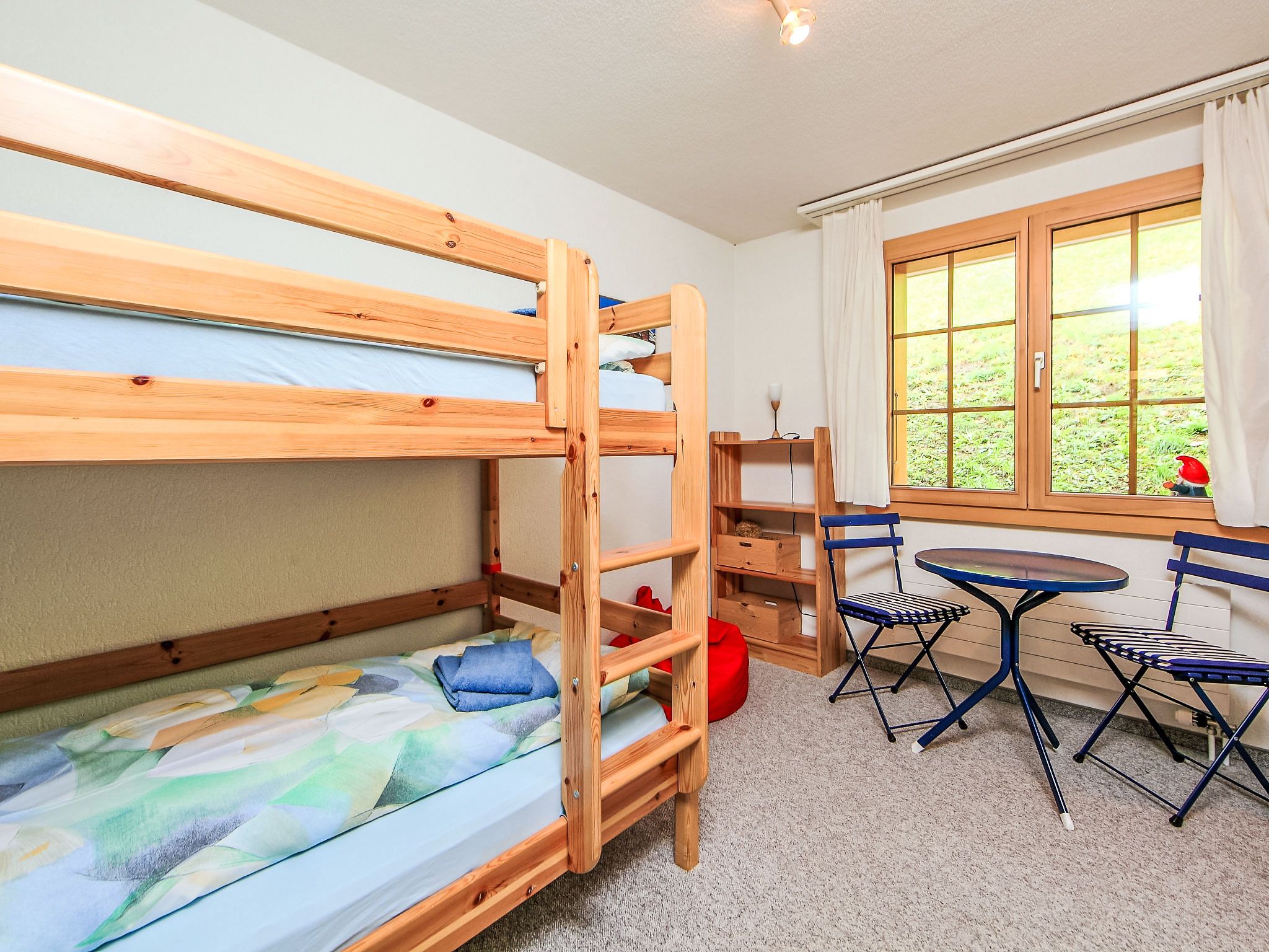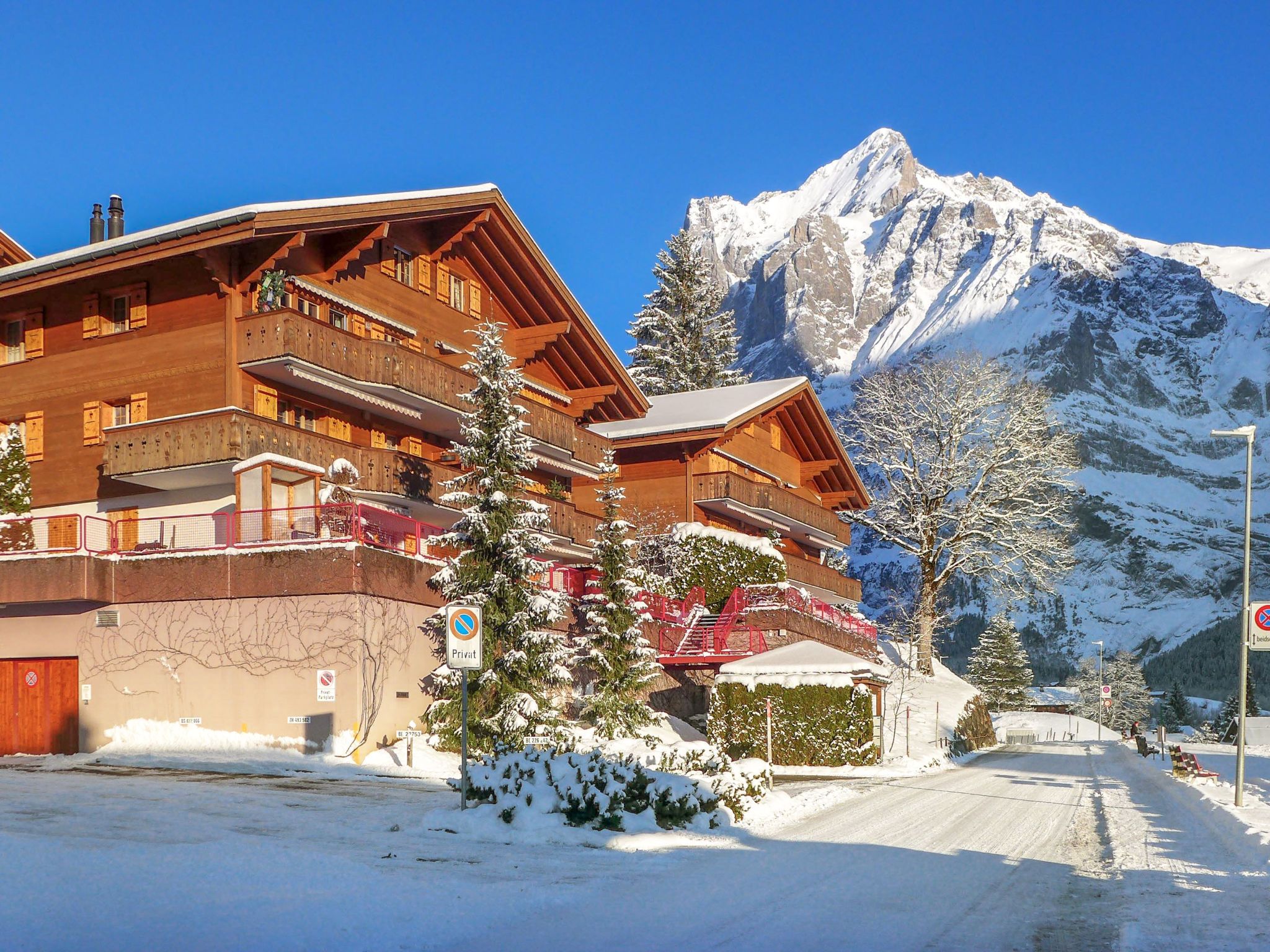 3-Zimmer-Wohnung 70 m2, Südlage. Schön und gemütlich eingerichtet: Wohn-/Esszimmer mit Schwedenofen und Kabel-TV (Flachbildschirm), Radio. Ausgang zum Balkon, Richtung Süden und Richtung Westen. 1 Zimmer mit 1 Bett (160 cm, Länge 200 cm). 1 Zimmer mit 1 x 2 Etagenbetten (90 cm, Länge 200 cm). Offene Küche (Backofen, Geschirrspüler, 4 Glaskeramikplatten, Toaster, Wasserkocher, elektrische Kaffeemaschine, Fondue Set (Käse)). Bad/WC. Balkon 20 m2, Südlage und Westlage. Balkonmöbel. Herrliche Sicht auf die Berge und Eigernordwand. Zur Verfügung: Holz (extra). Internet (Wireless LAN, gratis). Garage Nr. 21, Höhe 200 cm. Bitte beachten: Nichtraucher-Unterkunft. Feuerlöscher.
