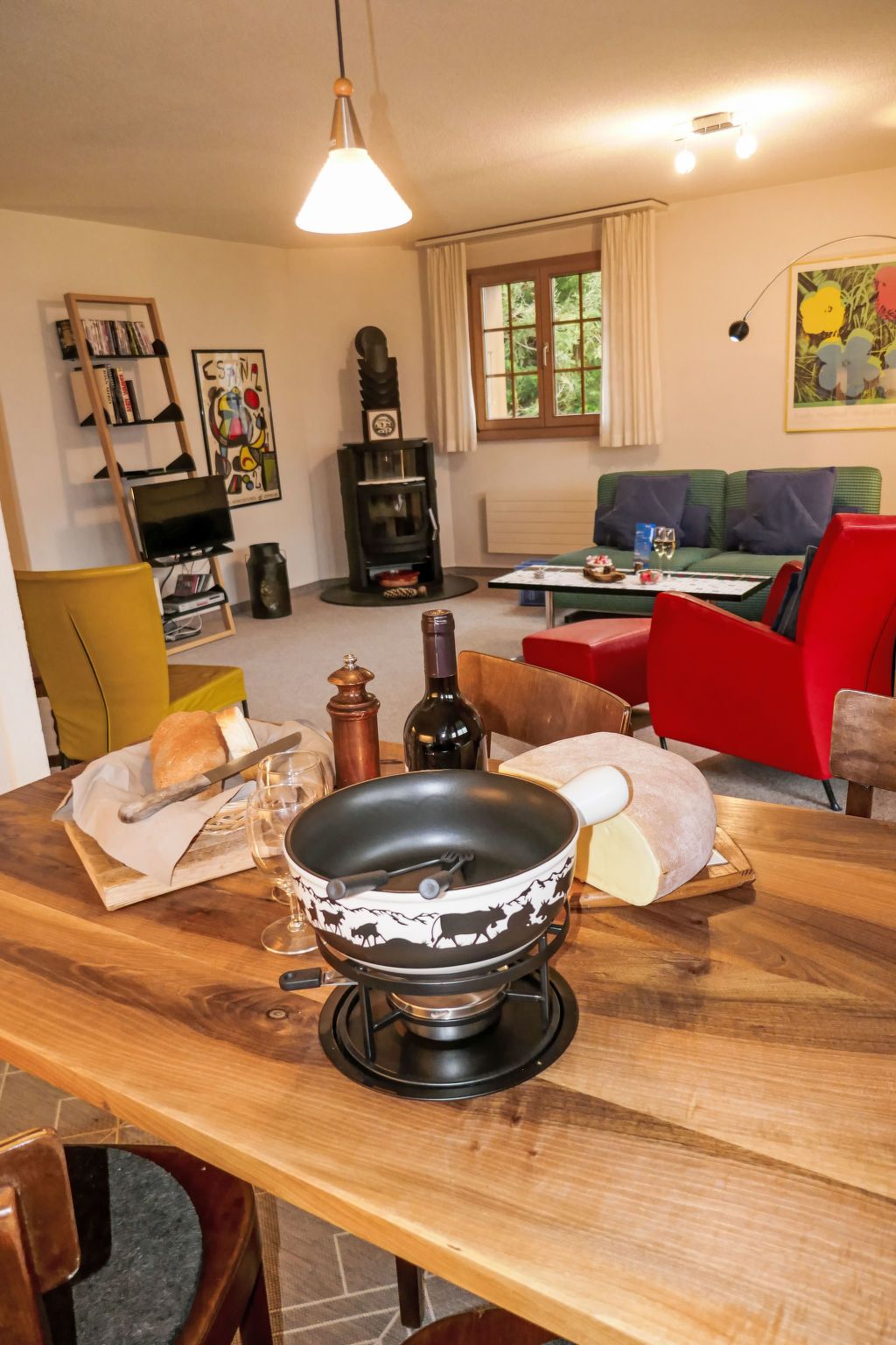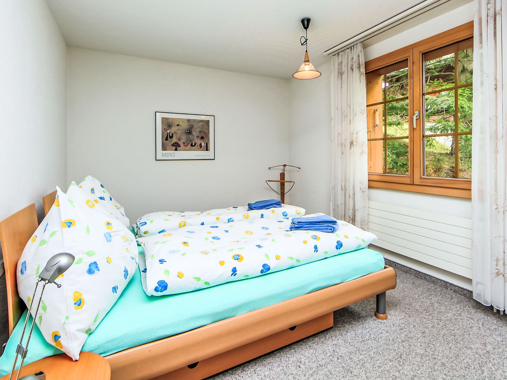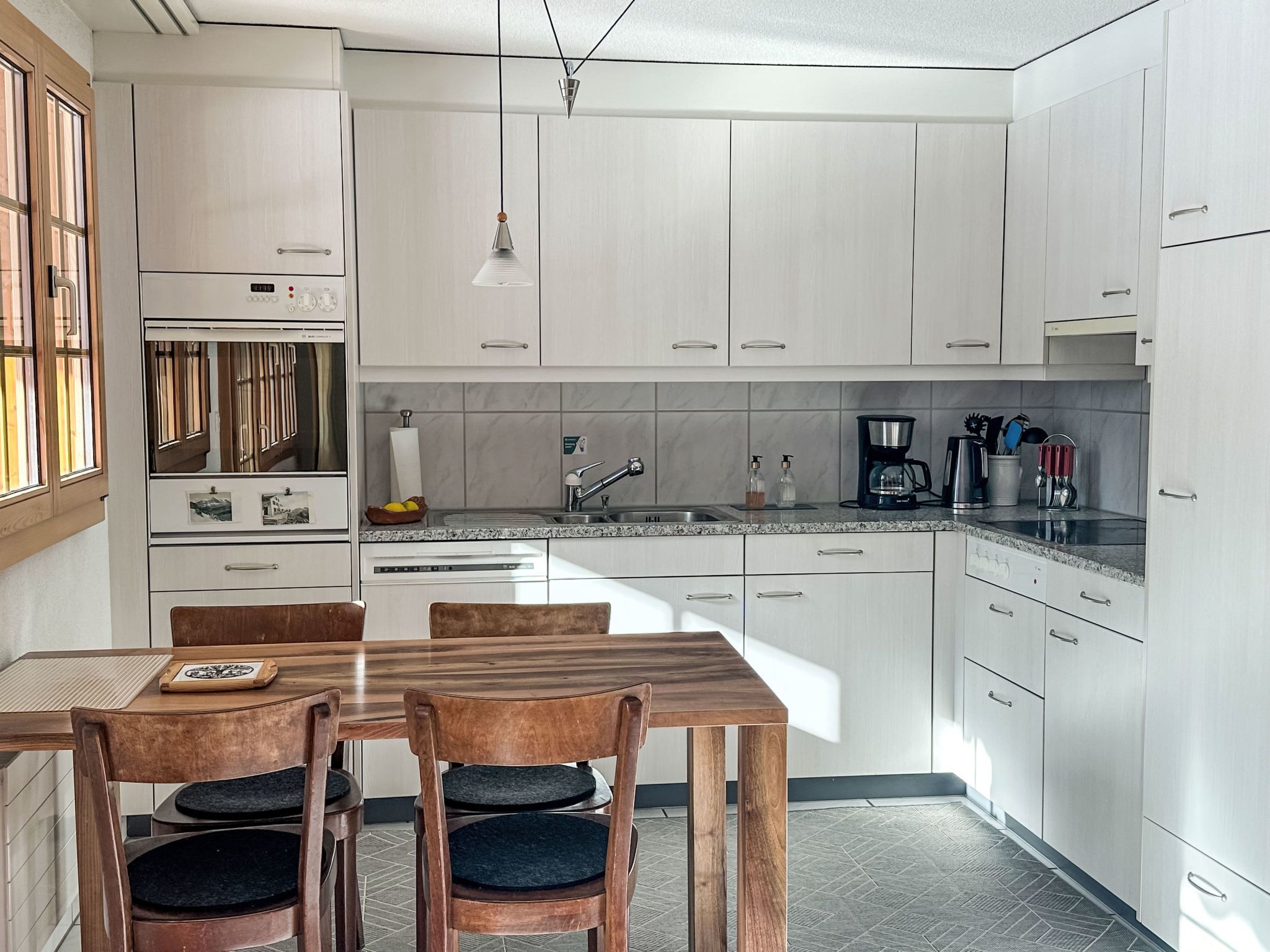 3-Zimmer-Wohnung 70 m2, Südlage. Schön und gemütlich eingerichtet: Wohn-/Esszimmer mit Schwedenofen und Kabel-TV (Flachbildschirm), Radio. Ausgang zum Balkon, Richtung Süden und Richtung Westen. 1 Zimmer mit 1 Bett (160 cm, Länge 200 cm). 1 Zimmer mit 1 x 2 Etagenbetten (90 cm, Länge 200 cm). Offene Küche (Backofen, Geschirrspüler, 4 Glaskeramikplatten, Toaster, Wasserkocher, elektrische Kaffeemaschine, Fondue Set (Käse)). Bad/WC. Balkon 20 m2, Südlage und Westlage. Balkonmöbel. Herrliche Sicht auf die Berge und Eigernordwand. Zur Verfügung: Holz (extra). Internet (Wireless LAN, gratis). Garage Nr. 21, Höhe 200 cm. Bitte beachten: Nichtraucher-Unterkunft. Feuerlöscher.