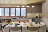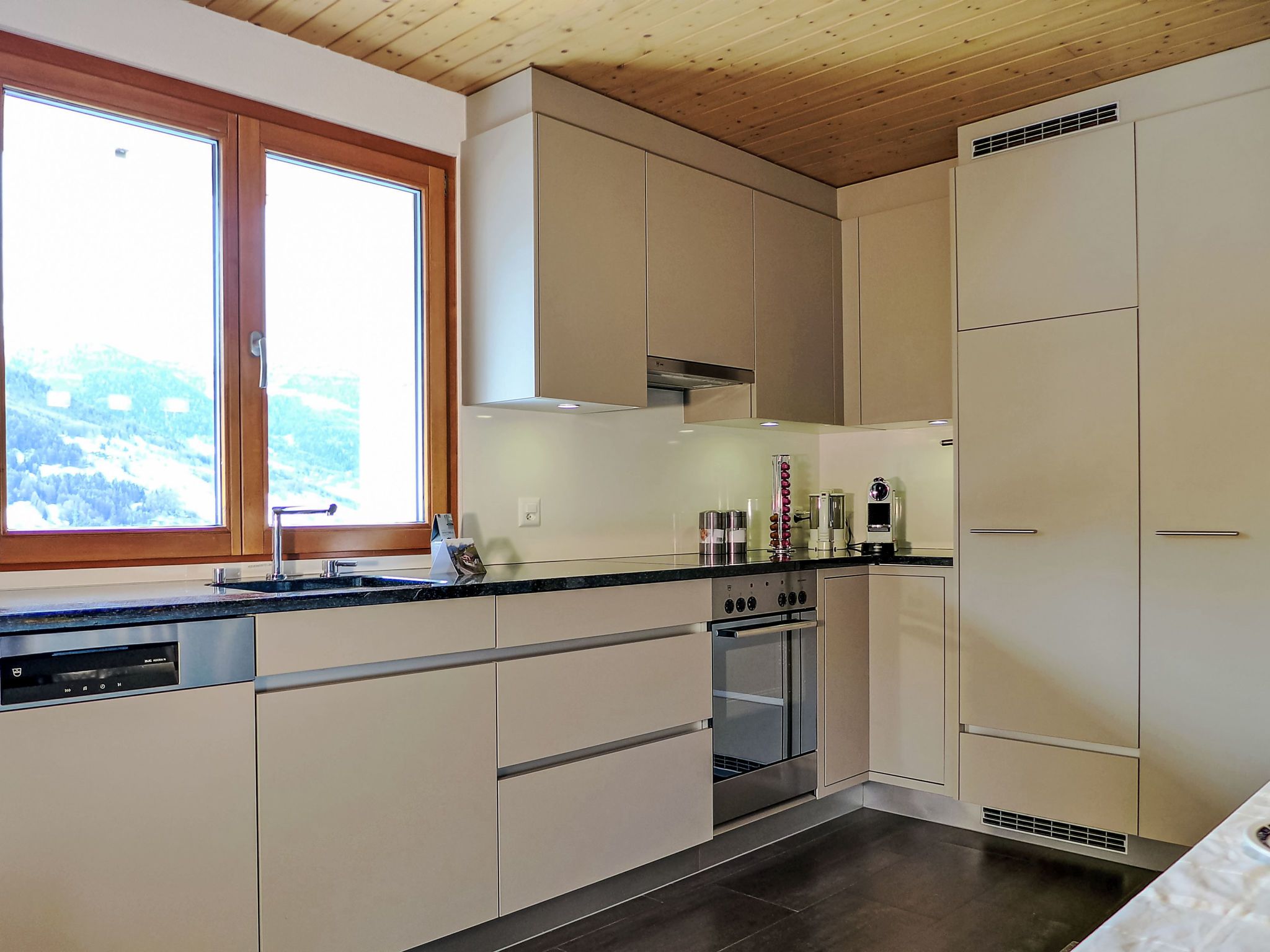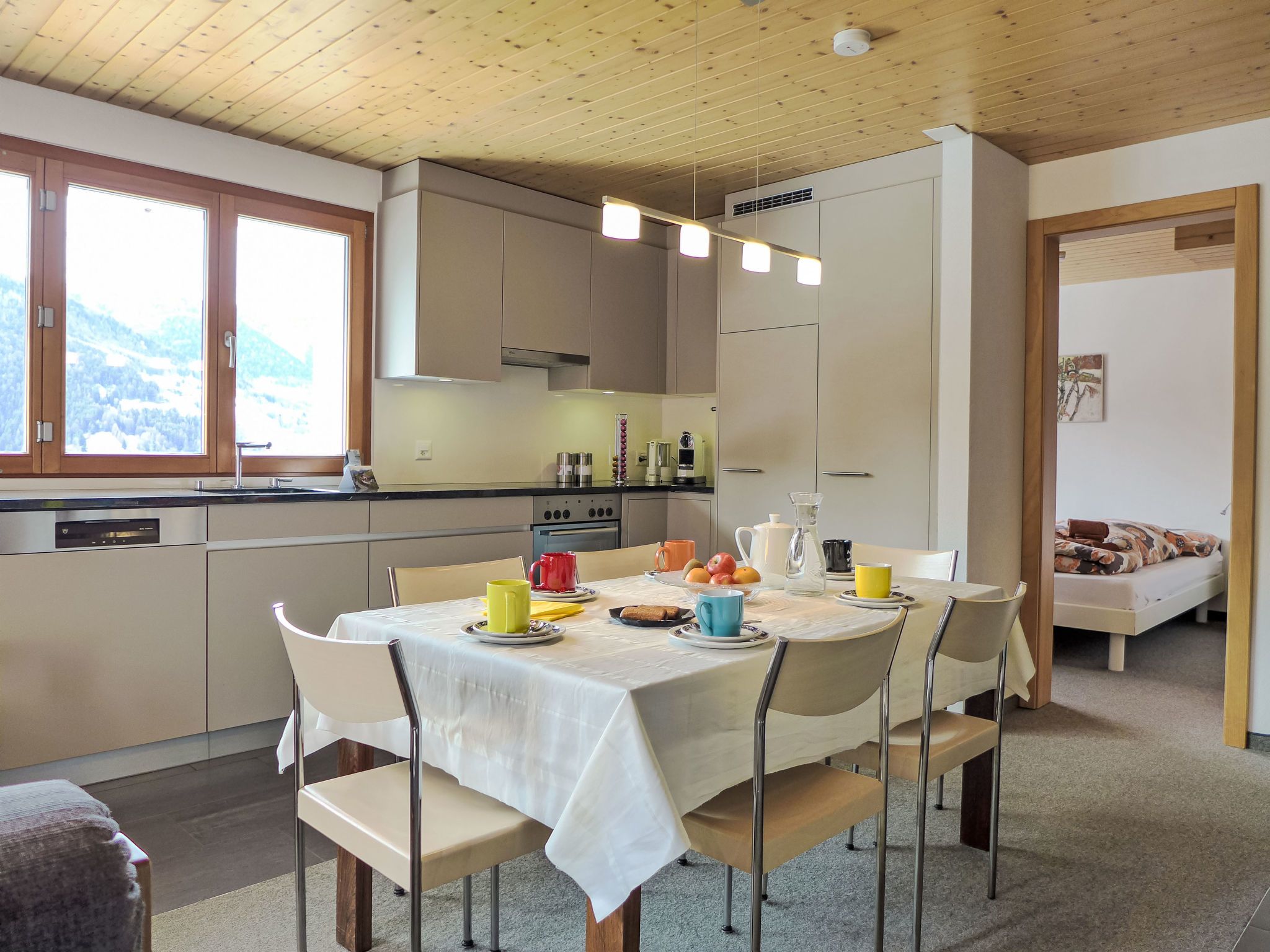 Chalet Gredetsch 4B, 3-Zimmer-Wohnung im Erdgeschoss. Geräumig und hell, modern und gemütlich eingerichtet: offenes Wohn-/Esszimmer mit Schwedenofen, Kabel-TV und Flachbildschirm. Ausgang zur Terrasse. 1 Zimmer mit 1 Doppelbett (2 x 80 cm, Länge 200 cm). 1 Kinderzimmer mit 1 x 2 Etagenbetten (90 cm, Länge 200 cm). Offene Küche (Backofen, Geschirrspüler, 4 Glaskeramikplatten, Toaster, Wasserkocher, elektrische Kaffeemaschine, Kapseln für die Kaffeemaschine (Nespresso) extra, Racletteofen, Fondue Set (Käse)) mit Esstisch. Dusche/WC. Holzheizung. Teppichboden. Grosse Terrasse. Terrassenmöbel, Liegestühle. Herrliche Panoramasicht auf die Berge, das Tal und die Landschaft. Zur Verfügung: Waschmaschine, Wäschetrockner, Kinderhochstuhl, Babybett (extra), Haartrockner, Holz (gratis). Internet (Wireless LAN, gratis). Parkplatz (1 Auto) beim Haus. Bitte beachten: geeignet für Familien. Nichtraucher-Unterkunft. Rauchmelder, Feuerlöscher.