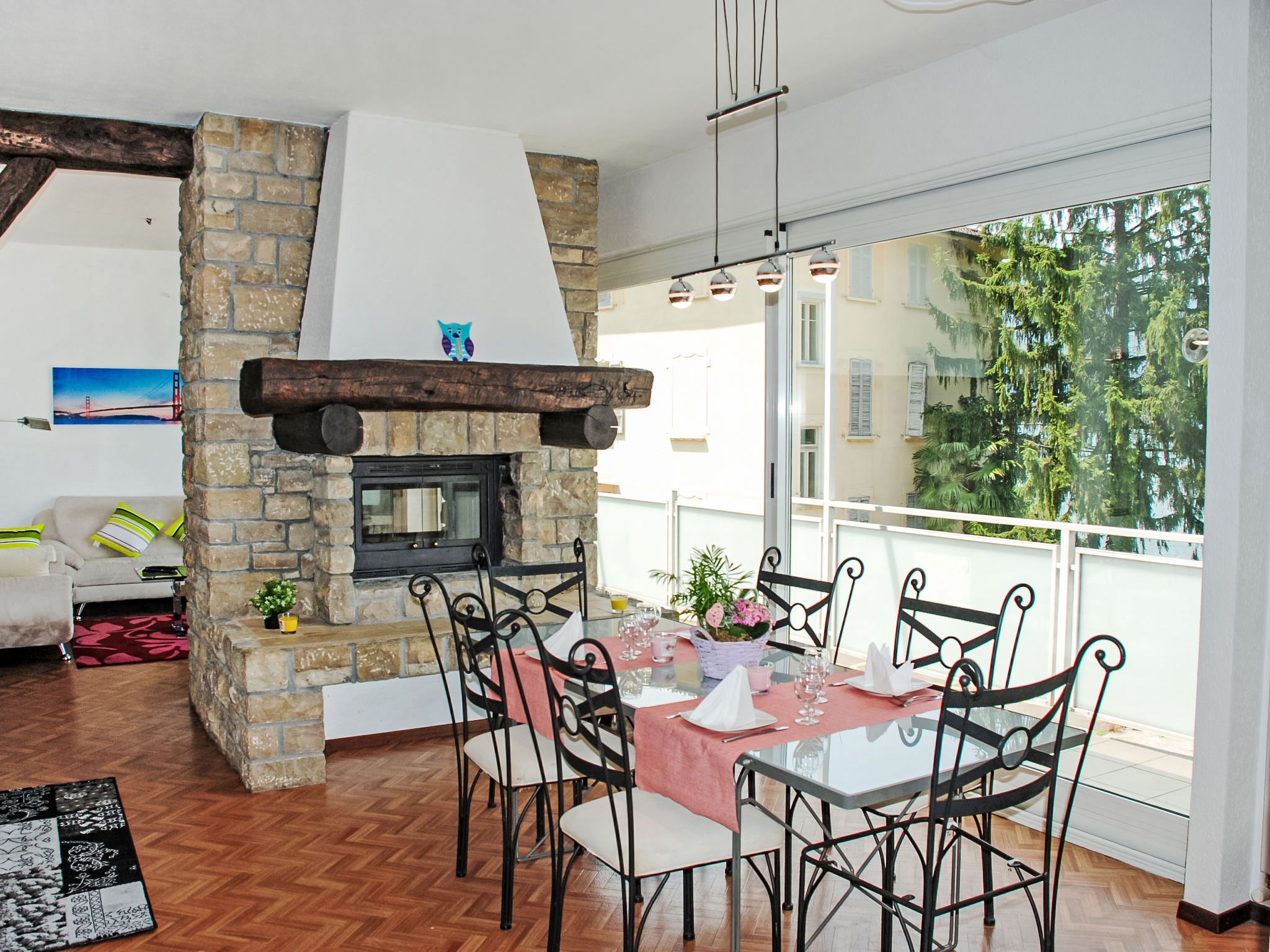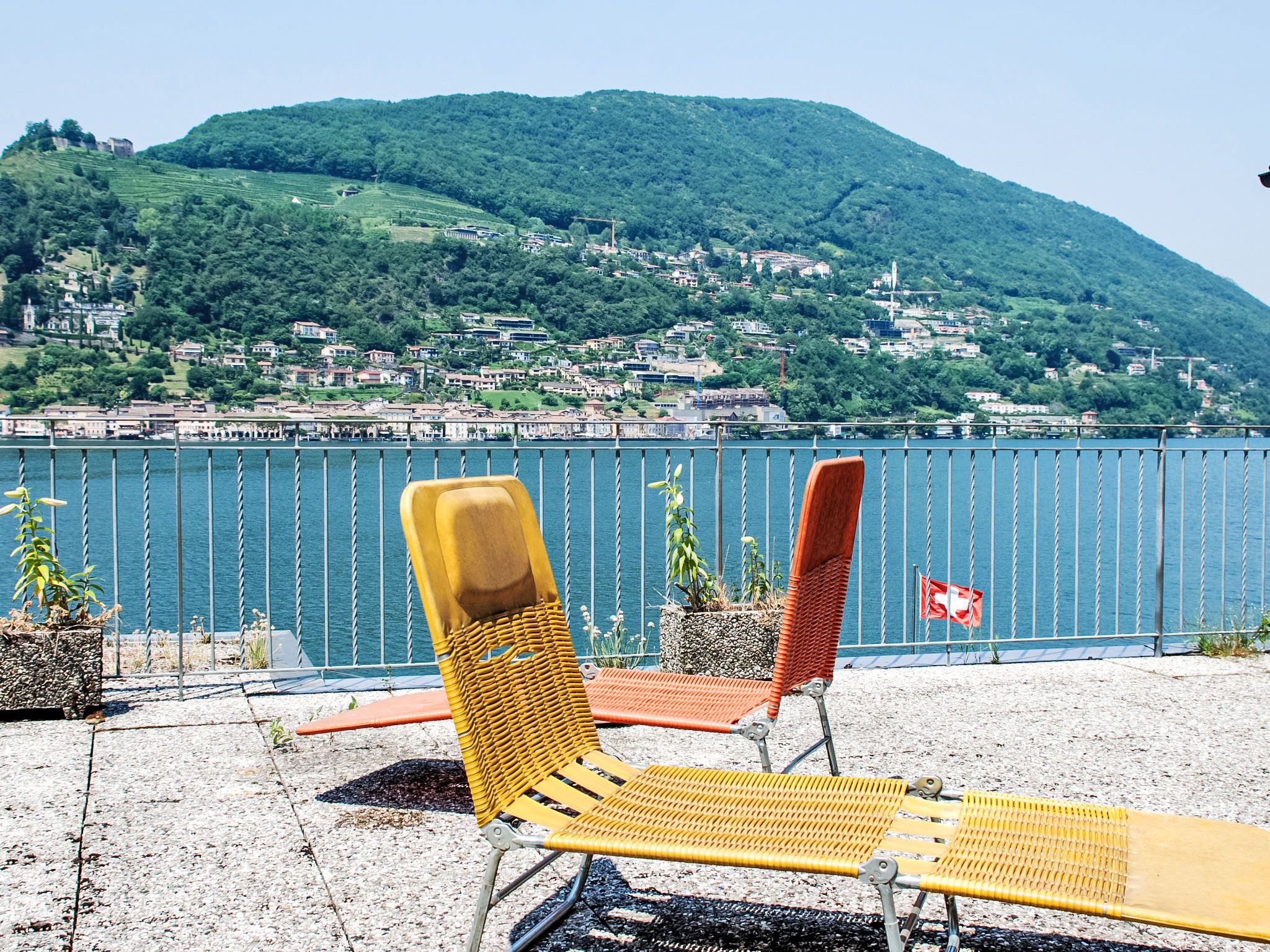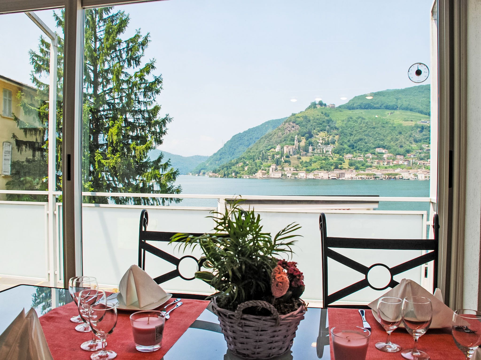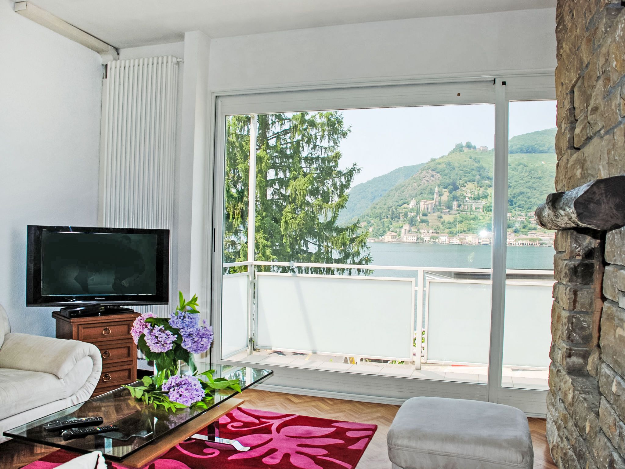 Zappa, 5-Zimmer-Wohnung 125 m2 im 1. Stock. Geräumig und hell, zweckmässig eingerichtet: offenes grosses Wohn-/Esszimmer mit Schiebetür, Panoramafenster mit offenem Kamin, Esstisch und Sat-TV (Flachbildschirm), Radio. Ausgang zum Balkon. 1 Doppelzimmer mit 1 Doppelbett (2 x 90 cm, Länge 200 cm). Ausgang zum Balkon. 1 Doppelzimmer mit 1 franz. Bett (160 cm, Länge 200 cm). 1 Zimmer mit 1 Bett (90 cm, Länge 200 cm). Küche (Backofen, 4 Glaskeramikplatten, elektrische Kaffeemaschine, Kapseln für die Kaffeemaschine (Nespresso (extra)) extra) mit Durchreiche. Bad/WC, Dusche/WC. Heizung. Grosser Balkon, grosse Terrasse 100 m2. Terrassenmöbel, Liegestühle (4). Schöne Panoramasicht auf den See, die Berge, die Landschaft und die Ortschaft. Zur Verfügung: Waschmaschine, Kinderhochstuhl, Babybett bis 2 Jahre (extra). Internet (WLAN, gratis). Bitte beachten: Nichtraucher-Unterkunft. Maximal 1 Haustier/Hund erlaubt. NL-