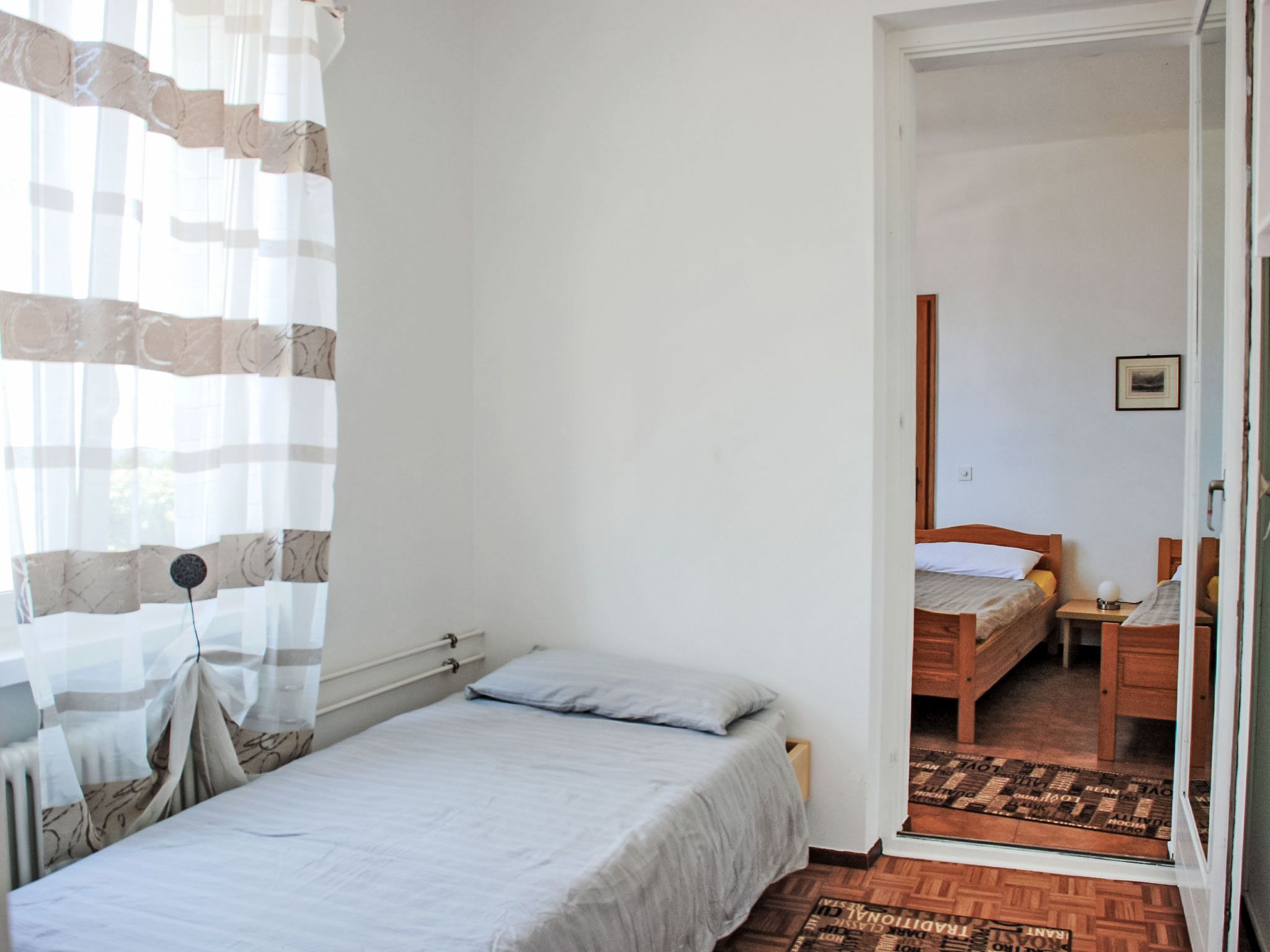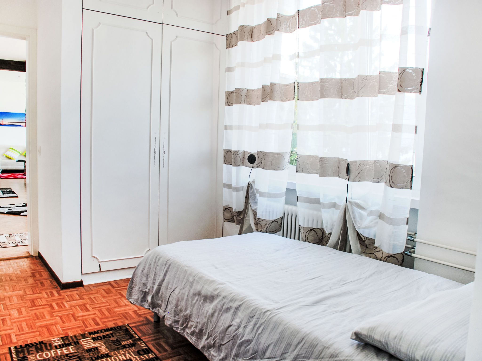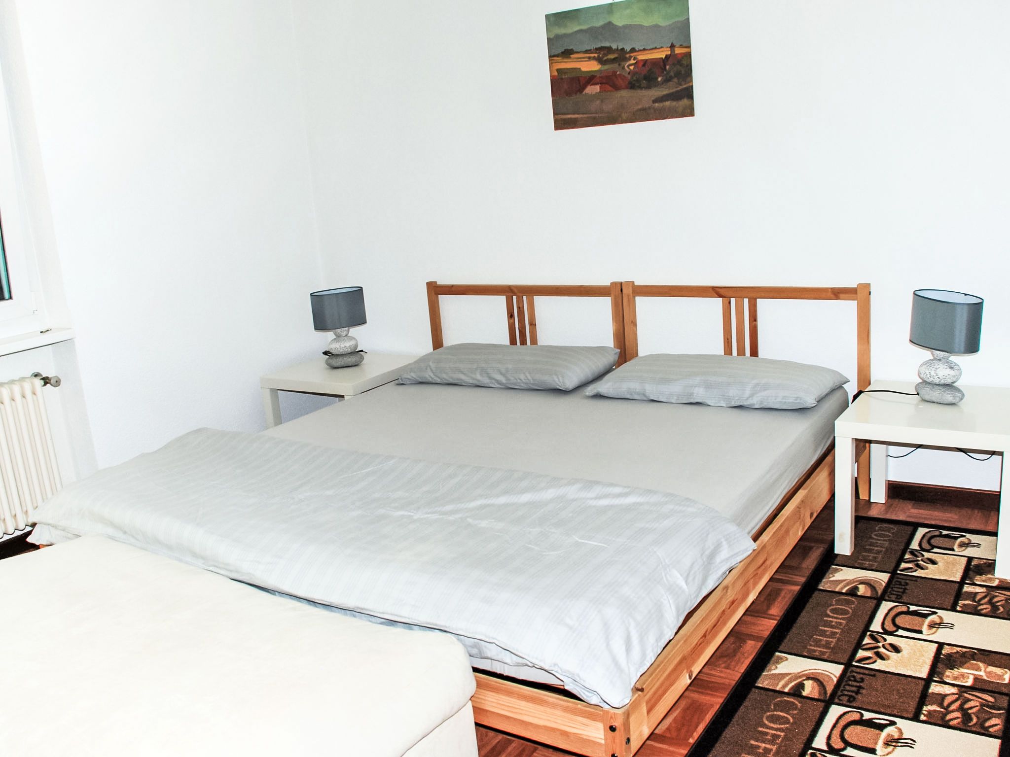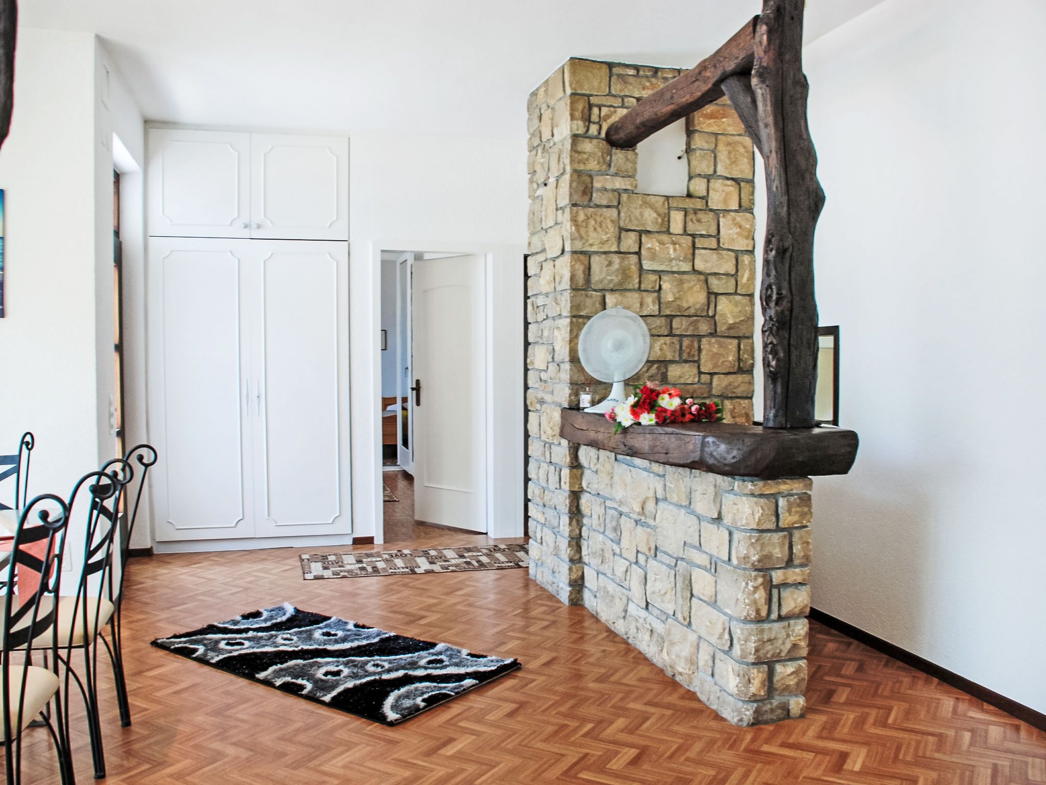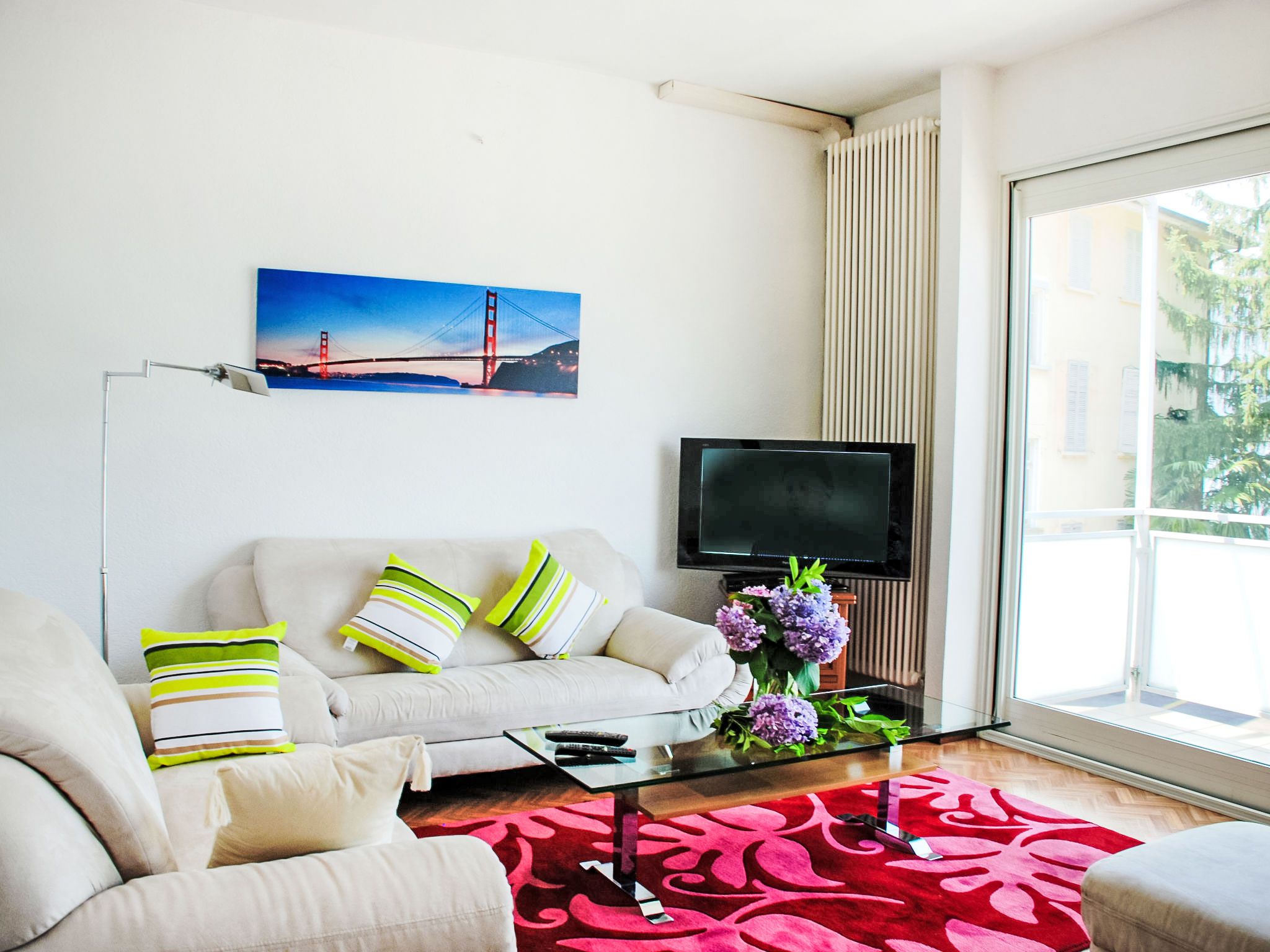 Zappa, 5-Zimmer-Wohnung 125 m2 im 1. Stock. Geräumig und hell, zweckmässig eingerichtet: offenes grosses Wohn-/Esszimmer mit Schiebetür, Panoramafenster mit offenem Kamin, Esstisch und Sat-TV (Flachbildschirm), Radio. Ausgang zum Balkon. 1 Doppelzimmer mit 1 Doppelbett (2 x 90 cm, Länge 200 cm). Ausgang zum Balkon. 1 Doppelzimmer mit 1 franz. Bett (160 cm, Länge 200 cm). 1 Zimmer mit 1 Bett (90 cm, Länge 200 cm). Küche (Backofen, 4 Glaskeramikplatten, elektrische Kaffeemaschine, Kapseln für die Kaffeemaschine (Nespresso (extra)) extra) mit Durchreiche. Bad/WC, Dusche/WC. Heizung. Grosser Balkon, grosse Terrasse 100 m2. Terrassenmöbel, Liegestühle (4). Schöne Panoramasicht auf den See, die Berge, die Landschaft und die Ortschaft. Zur Verfügung: Waschmaschine, Kinderhochstuhl, Babybett bis 2 Jahre (extra). Internet (WLAN, gratis). Bitte beachten: Nichtraucher-Unterkunft. Maximal 1 Haustier/Hund erlaubt. NL-