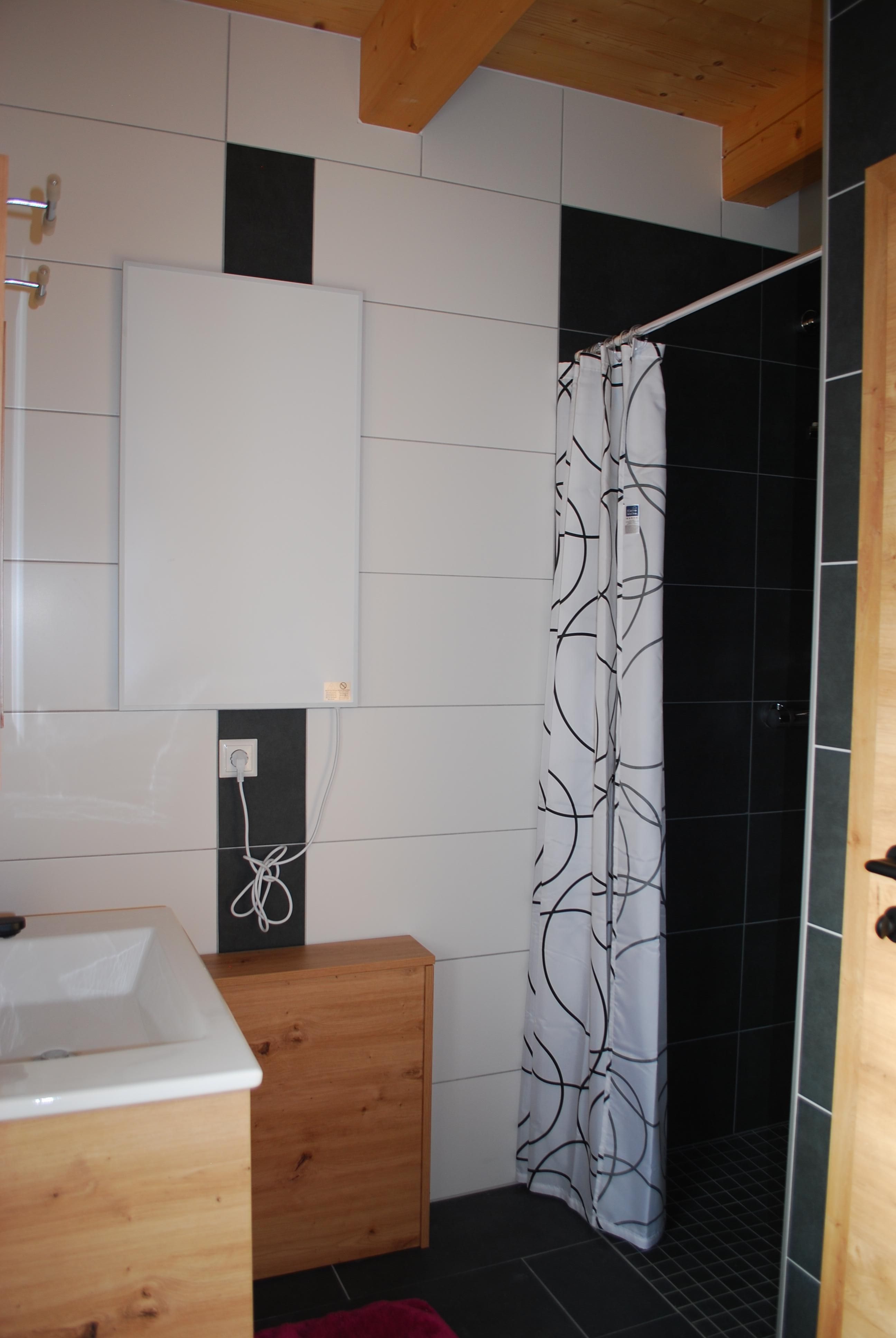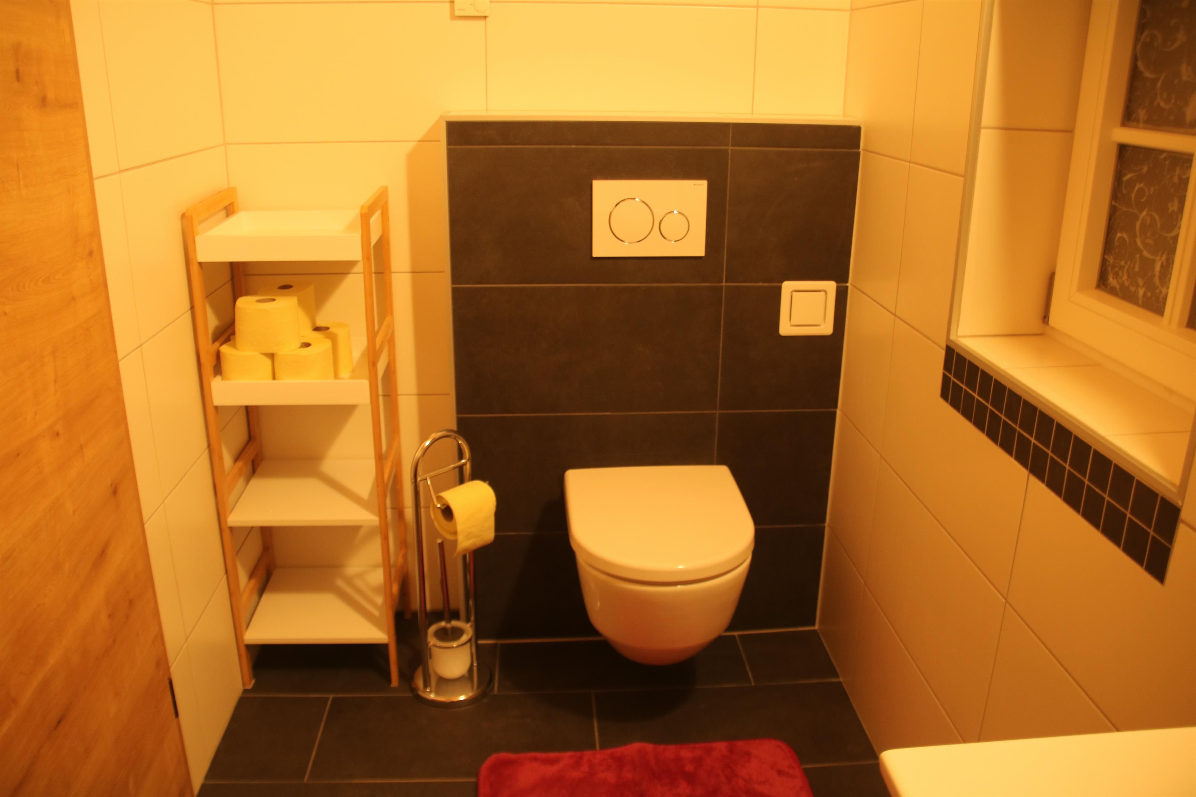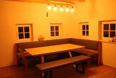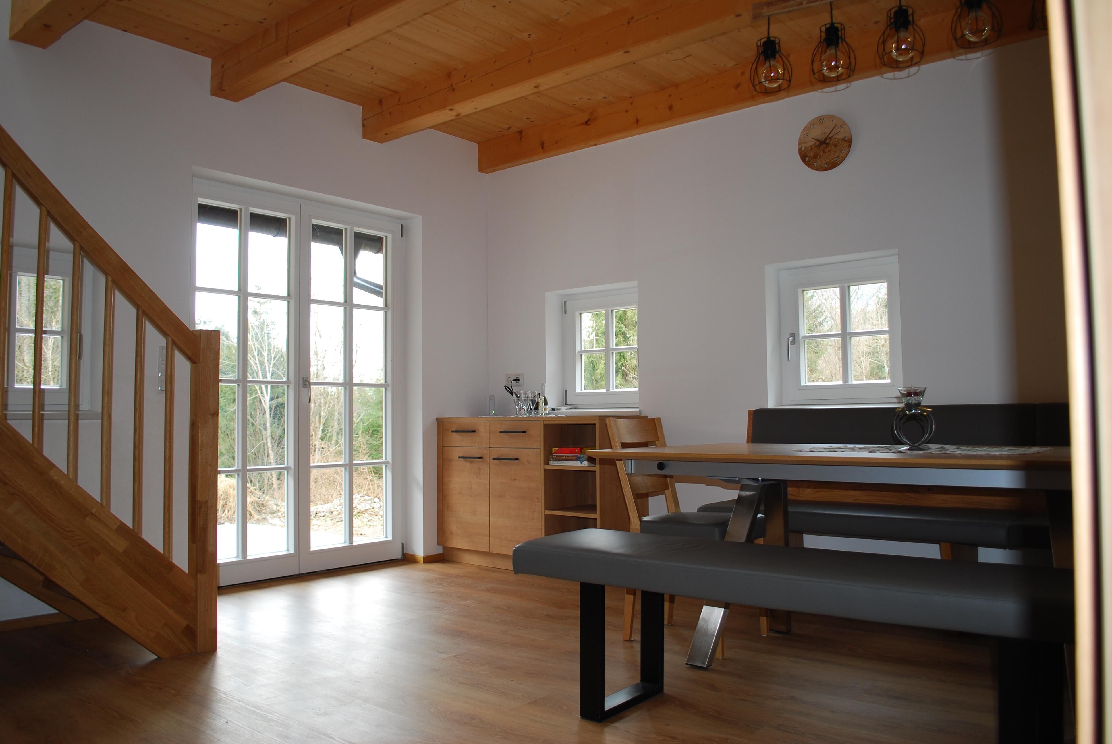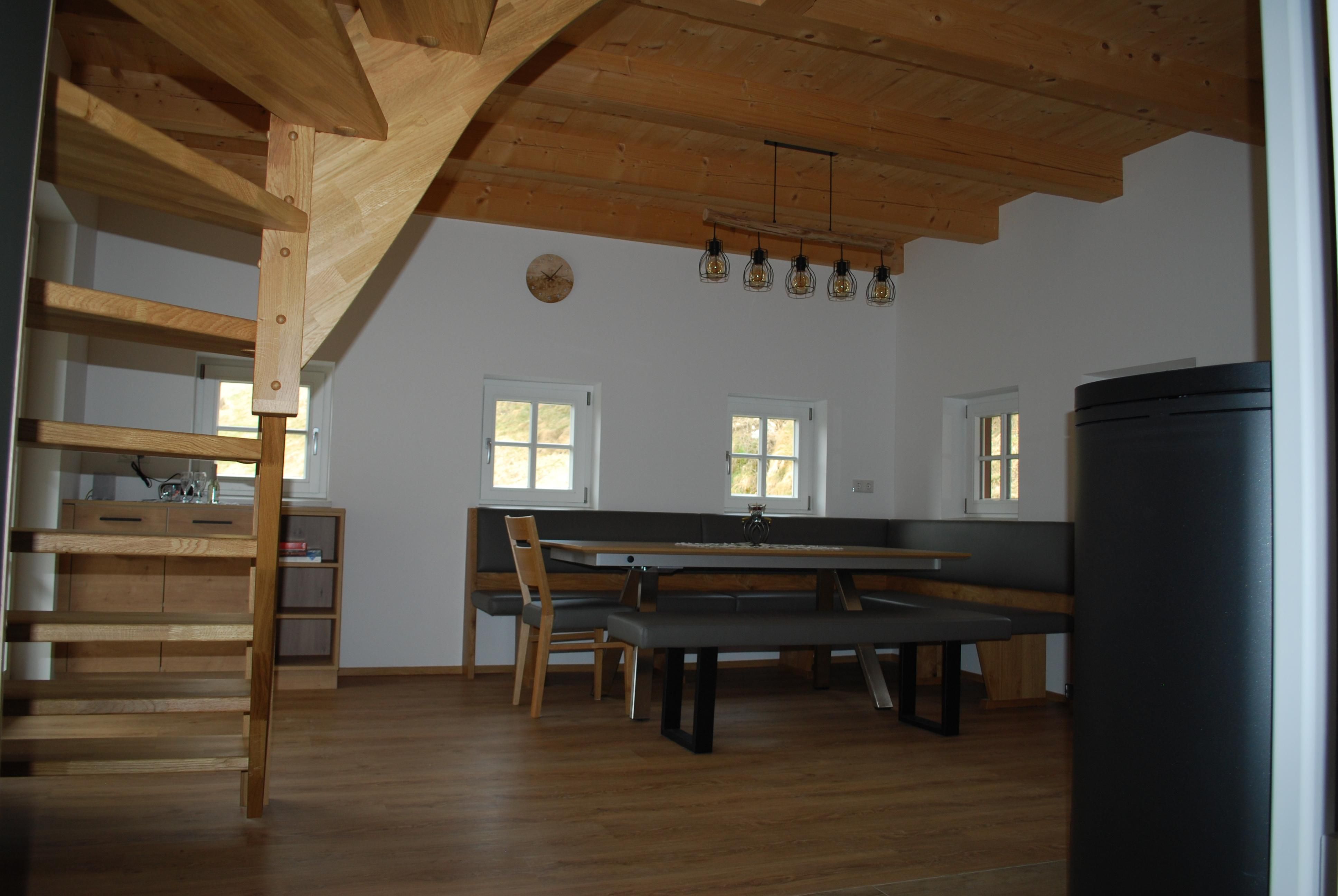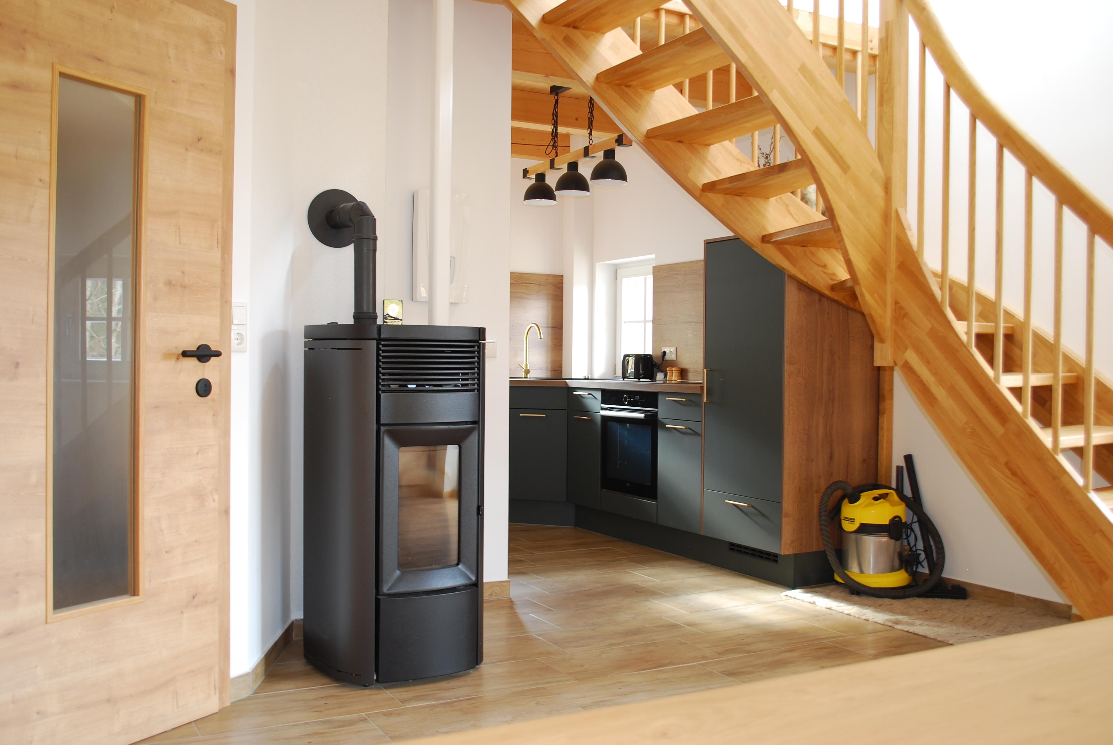 Im Erdgeschoss finden sie eine geräumige, komplett neuwertige Küche mit großem Essbereich. Geheizt wird das Ferienhaus mit einem Pelletofen. Darunter ist auch noch das Badezimmer mit WC vorzufinden.