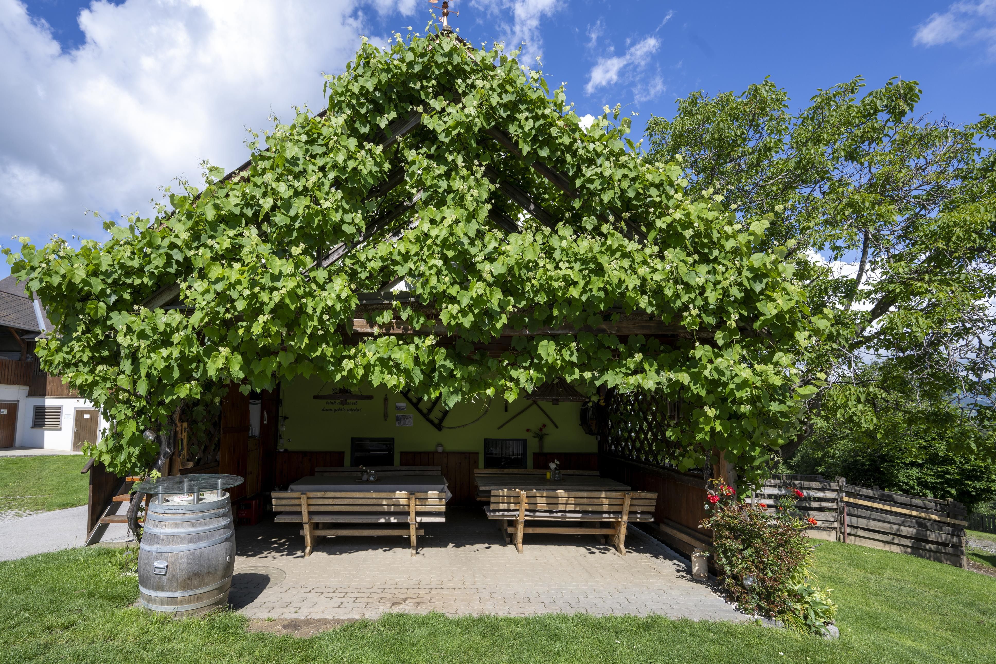 Hausgemachte Produkte können unter der gemütlichen Laube oder im Weinkeller verkostet werden.
