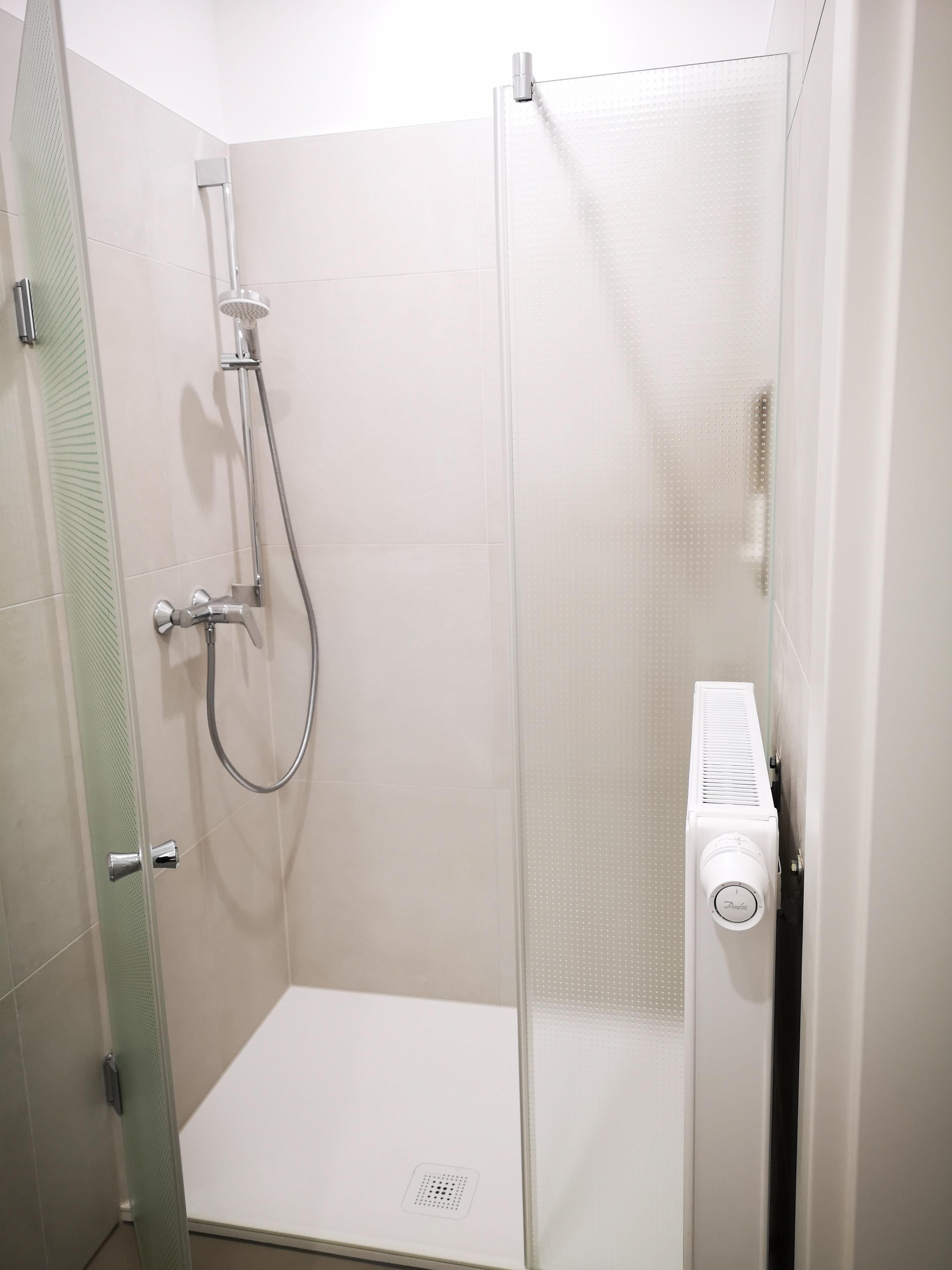 Das moderne Badezimmer hat eine bodengleiche Dusche, einen gut beleuchteten Spiegel und genügend Ablageflächen für Ihren Komfort. Selbstverständlich sind ein Haarföhn und flauschige Handtücher für Sie vorbereitet.