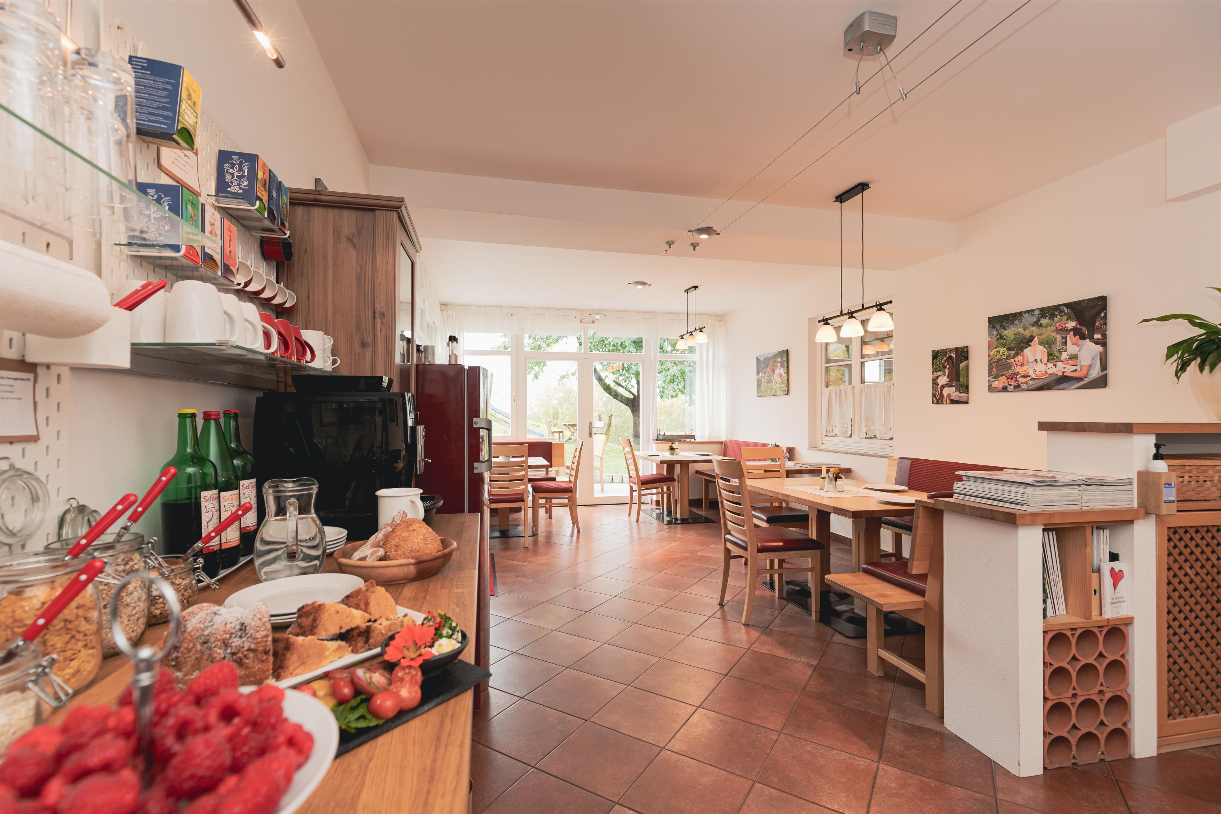 Gut zu wissen für alle Eltern: Kinder können im sicheren Innenhof spielen, vom Frühstückstisch hat man den Bereich gut im Blick. Gerne kann der Frühstückraum (oder die Terrasse und verschiedene Sitzplätze im Garten) auch tagsüber oder abends genutzt werden, es steht hier ein Kühlschrank, gefüllt mit Säften, Wein und Bier aus der Region zur Verfügung, außerdem ein Kaffeeautomat und viele Gesellschaftsspiele.