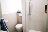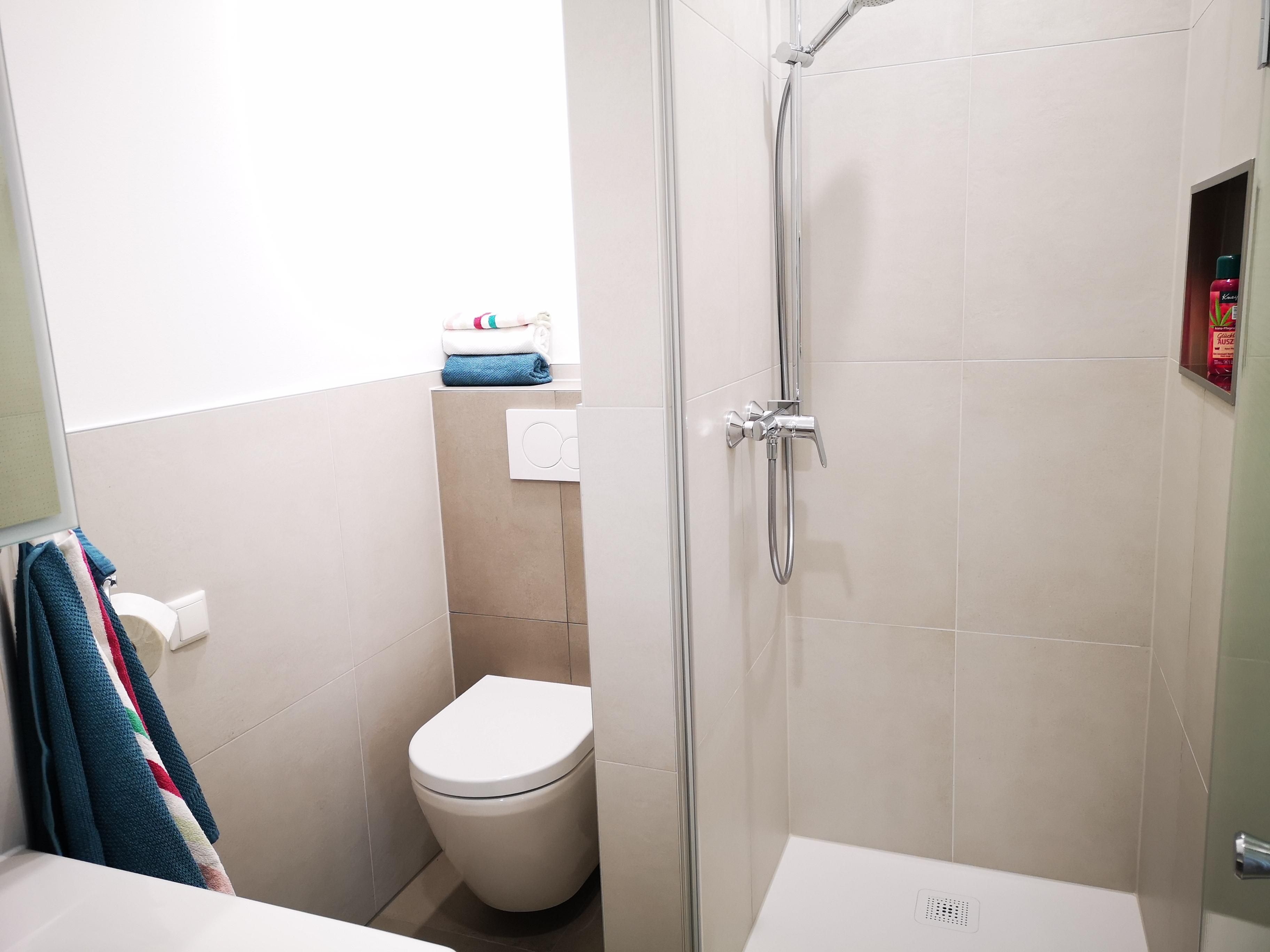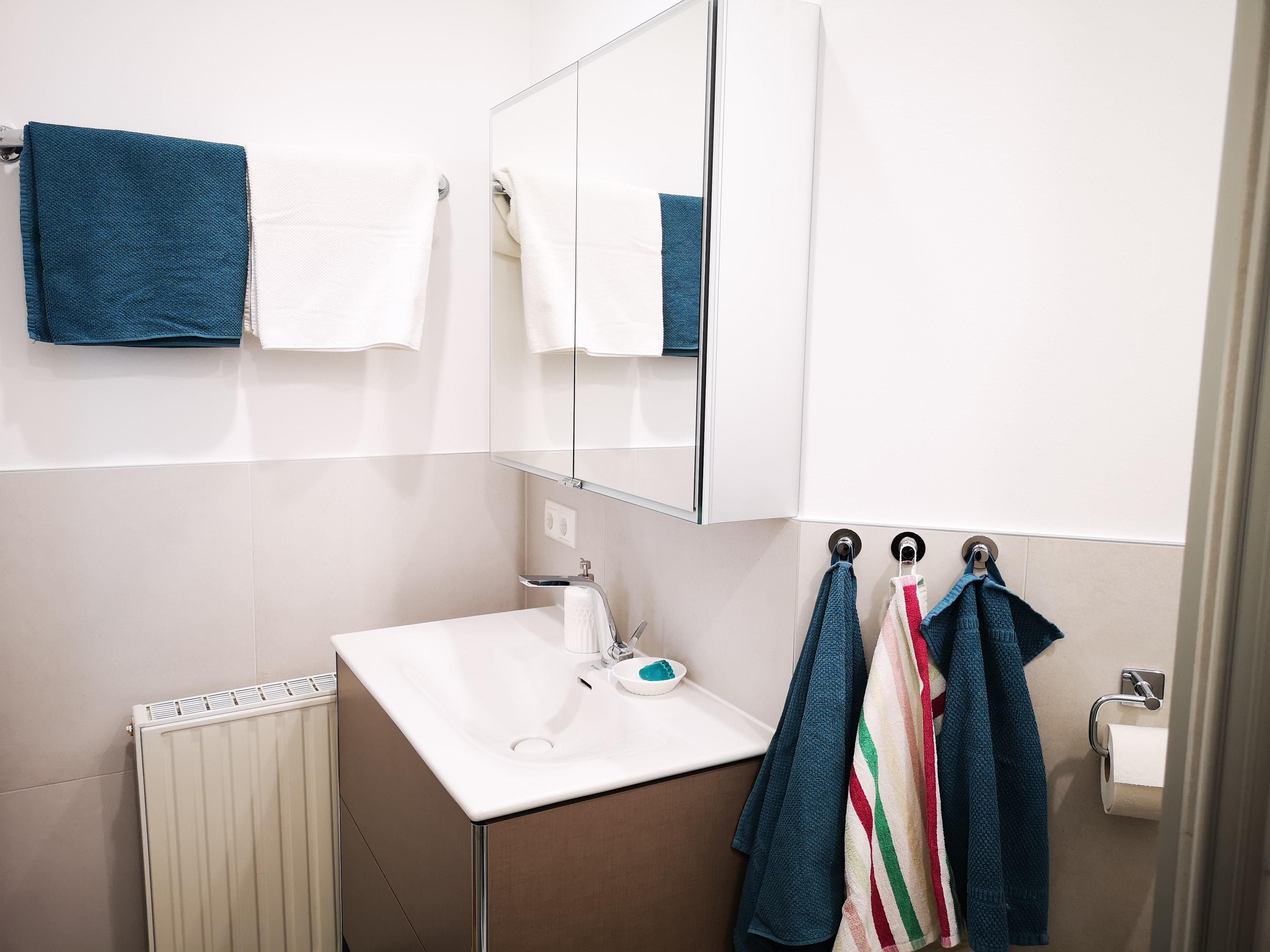 Im modern ausgestatteten Bad gibt es eine bodengleiche Dusche für höchsten Komfort, im großzügigen Waschtischunterschrank mit zwei Auszügen und im gut beleuchtetem Spiegelschrank über dem Waschbecken finden alle Utensilien ihren Platz. Fön und Handtücher liegen selbstverständlich für Sie bereit.