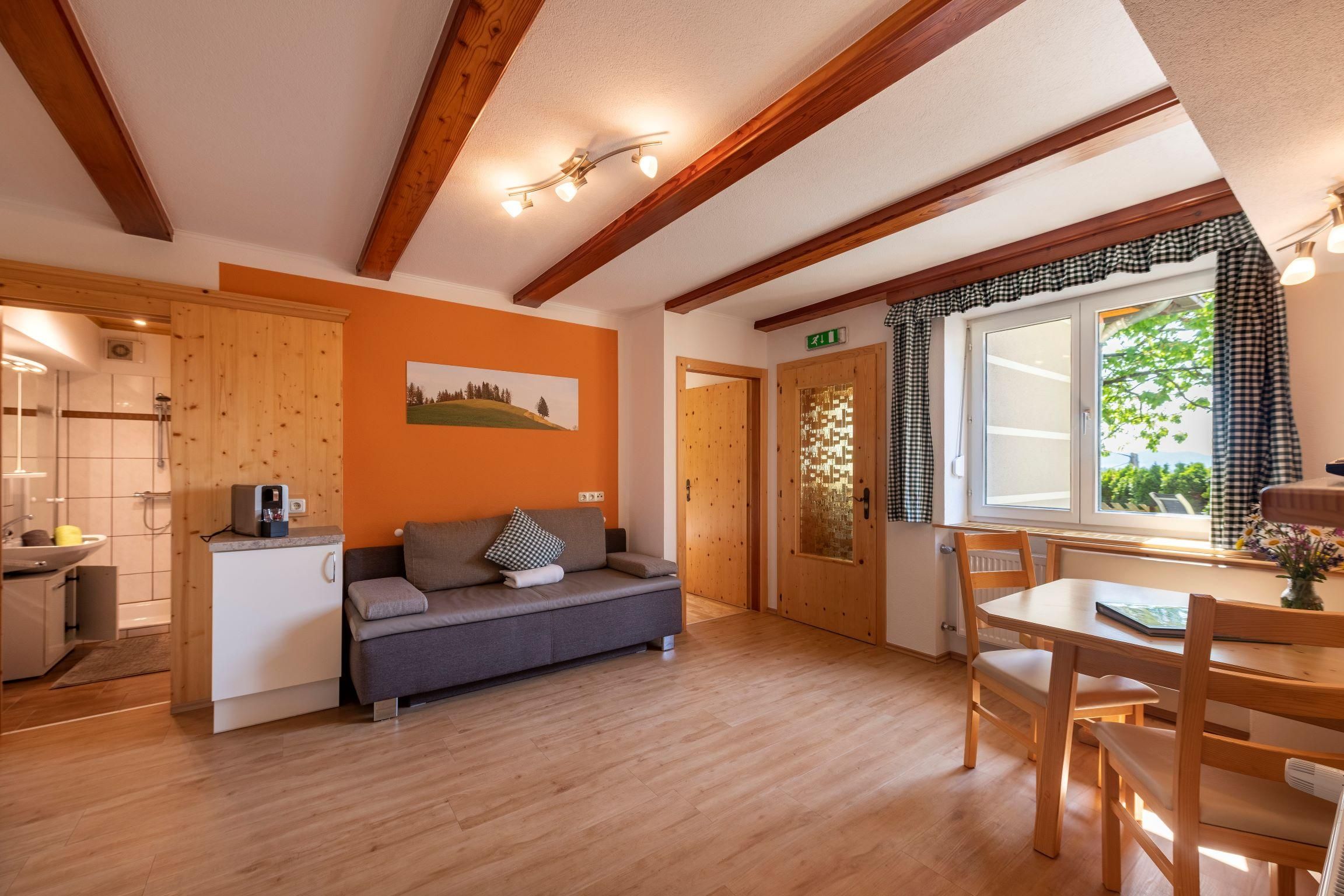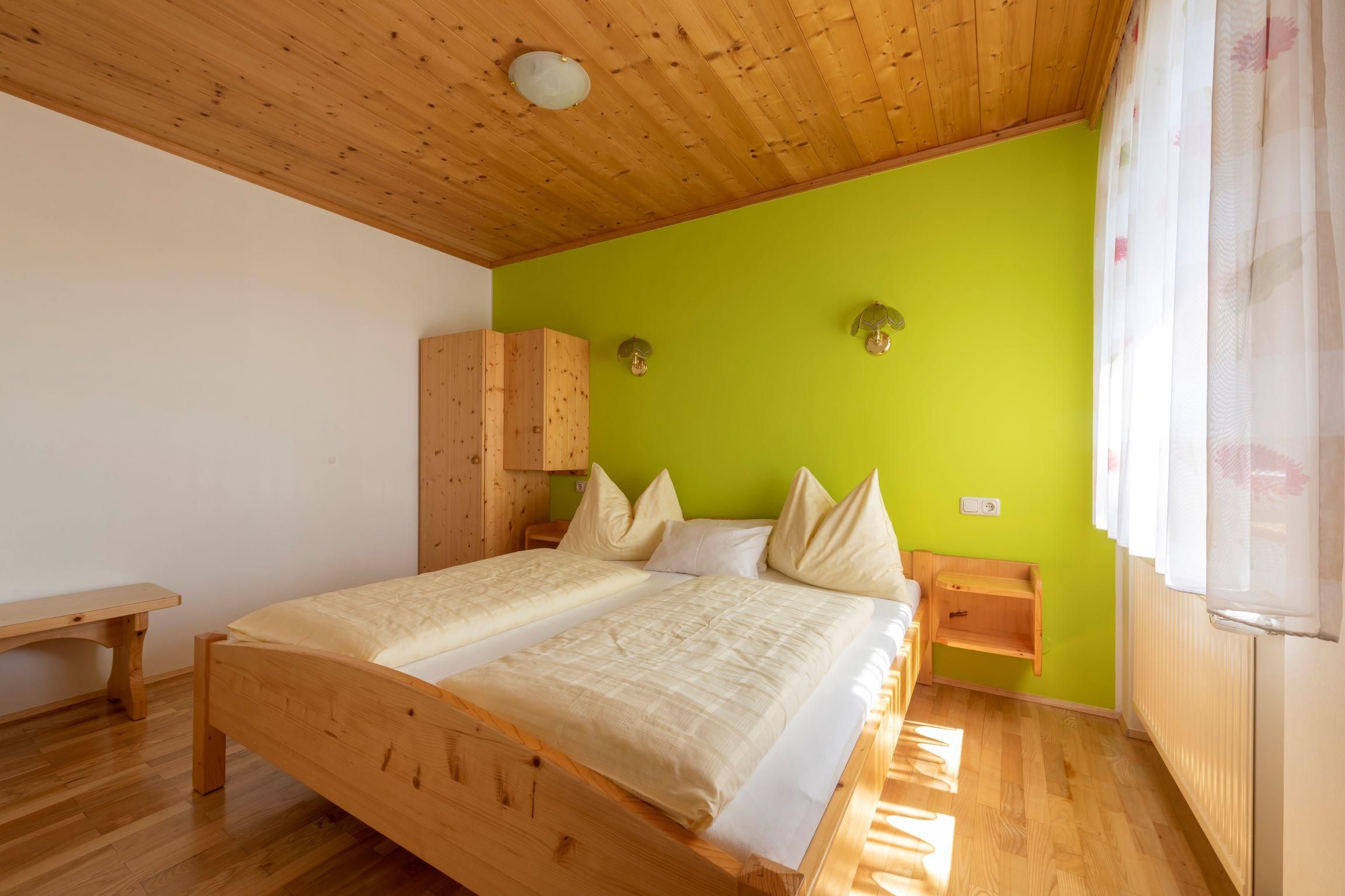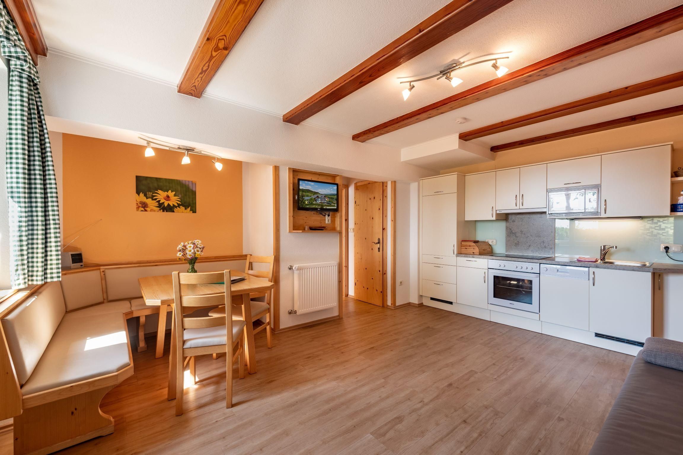 Die Ferienwohnung ist mit viel Holz ausgestattet. In der Wohnküche mit gemütlichen Sofa finden Sie einen Geschirrspüler, Mikrowelle, Kühlschrank, E-Herd mit Backrohr, Wasserkocher eine Kaffeemaschine und Sat-TV, 2 getrennte Schlafzimmer (1 Zimmer mit Doppelbett, ein 3 Bettzimmer davon ein Stockbett). Bad und WC getrennt, Vorraum. Um die herrliche Aussicht und frische Luft zu genießen gibt es einen eigenen großen Sitzgarten zum Faulenzen. Sehr beliebt ist die Wohnung, da Sie alleinstehend und ebenerdig ist.