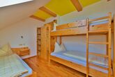 Holztreppe ins Obergeschoß mit Gitter gesichert, 2 Schlafzimmer davon ein 3 Bettzimmer mit Stockbett, Dusche, WC
