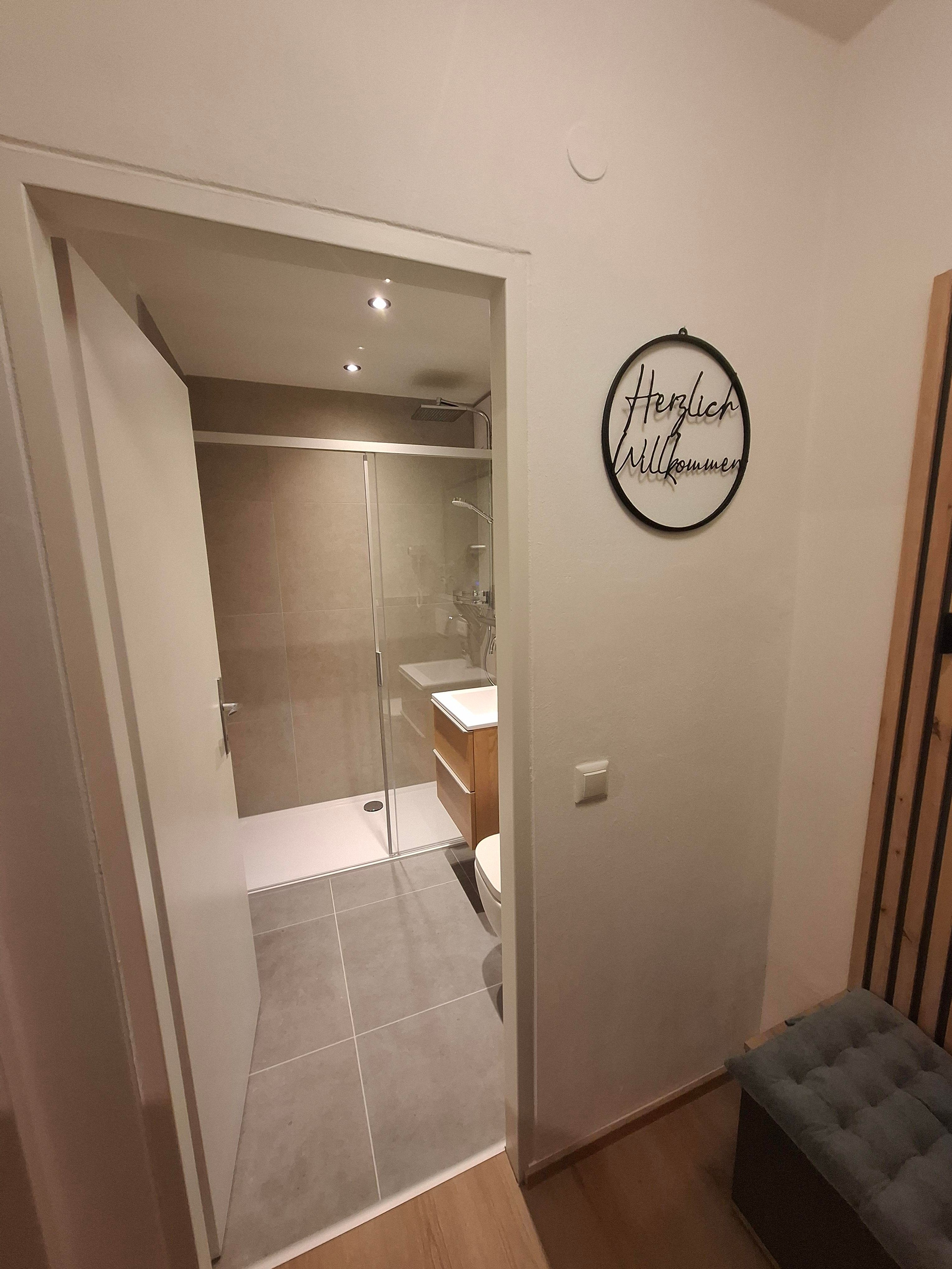 ein einladender Vorraum, ein modernes Badezimmer, ein gemütlicher Wohn- und Schlafraum, eine voll ausgestattete Küche sowie ein Balkon mit herrlicher Aussicht.