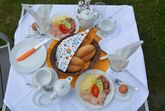 Bei Sonnenaufgang können Sie draußen frühstücken und den Tag mit einer herrlichen Aussicht beginnen wo Sie hausgemachte Säfte, Marmeladen, Eier, selbstgemachtes Joghurt, saisonales Obst und Gemüse vom eigenen Garten genießen können.
