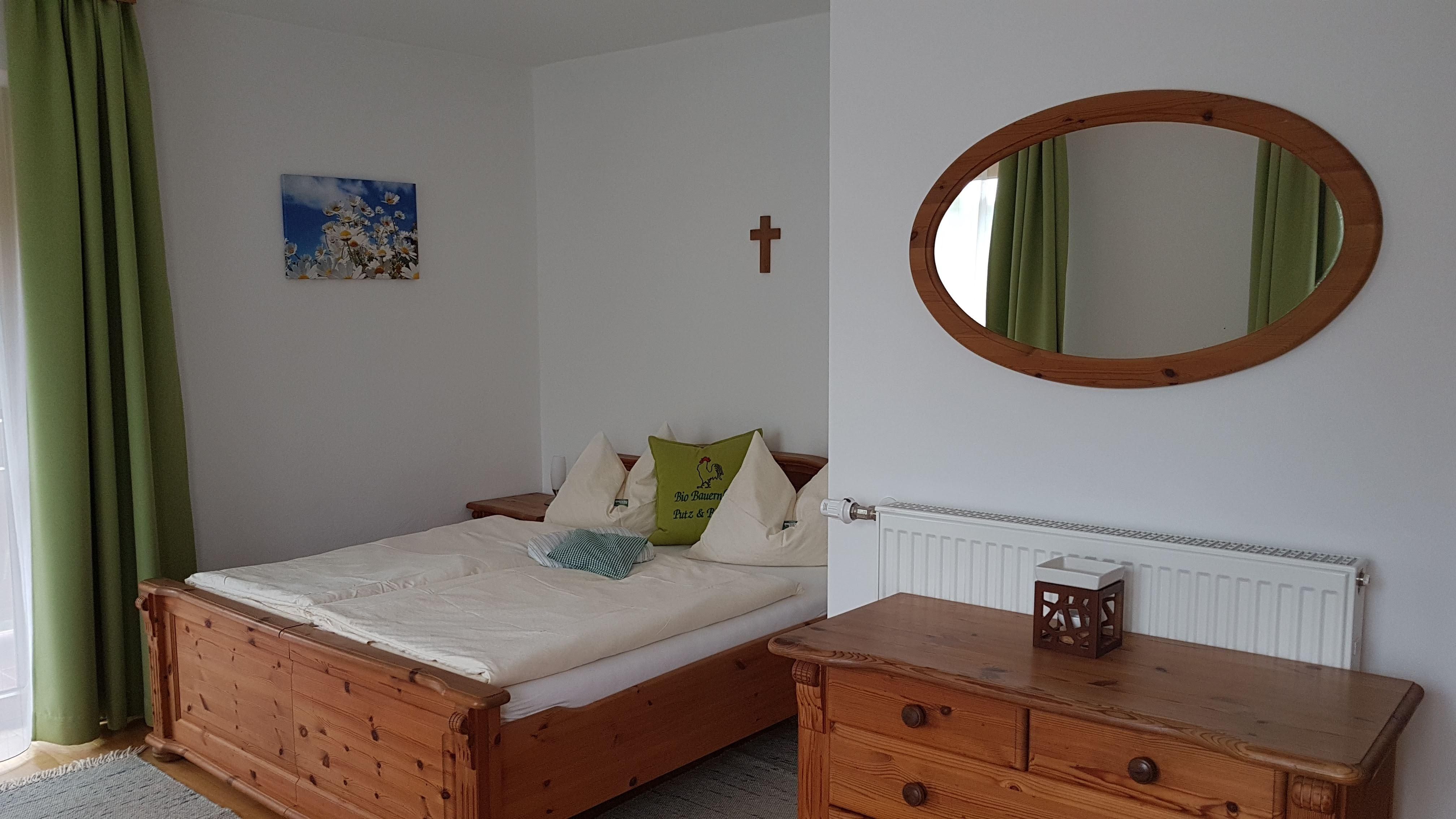 Unsere Gästezimmer sind alle mit Dusche/WC swoie Balkon ausgesattet und mit natürlichen Materialien eingerichtet. So finden Sie Wendematratzen im Sommer, - Winterseite, Parkettböden, Vollholzmöbel, sowie Decken und Pölster hergestellt aus der Schur unserer hofeigenen Schafe.