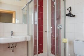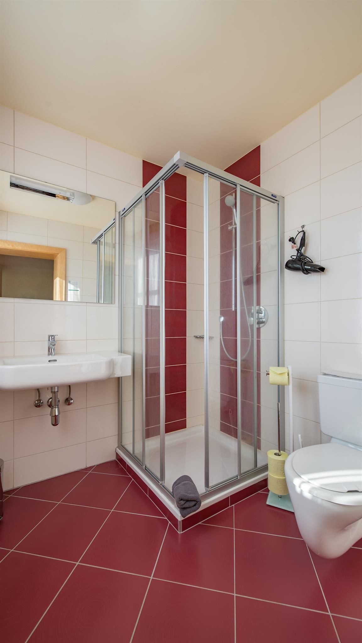 • Badezimmer mit Dusche, WC, Föhn, Kosmetikspiegel