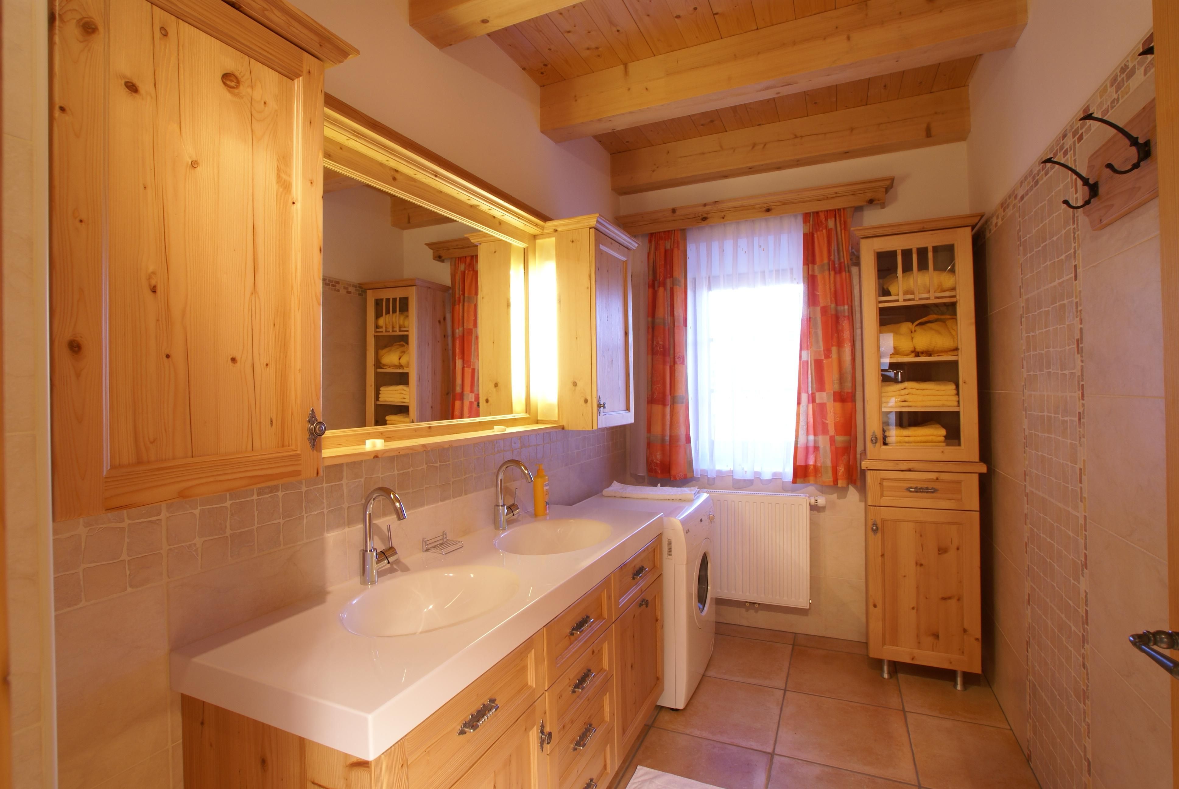 Geräumiges Badezimmer (7 m²) mit Doppelwaschtisch, Spiegelschrank, Waschmaschine, Dusche, Fön, Handtücher und Bademäntel.