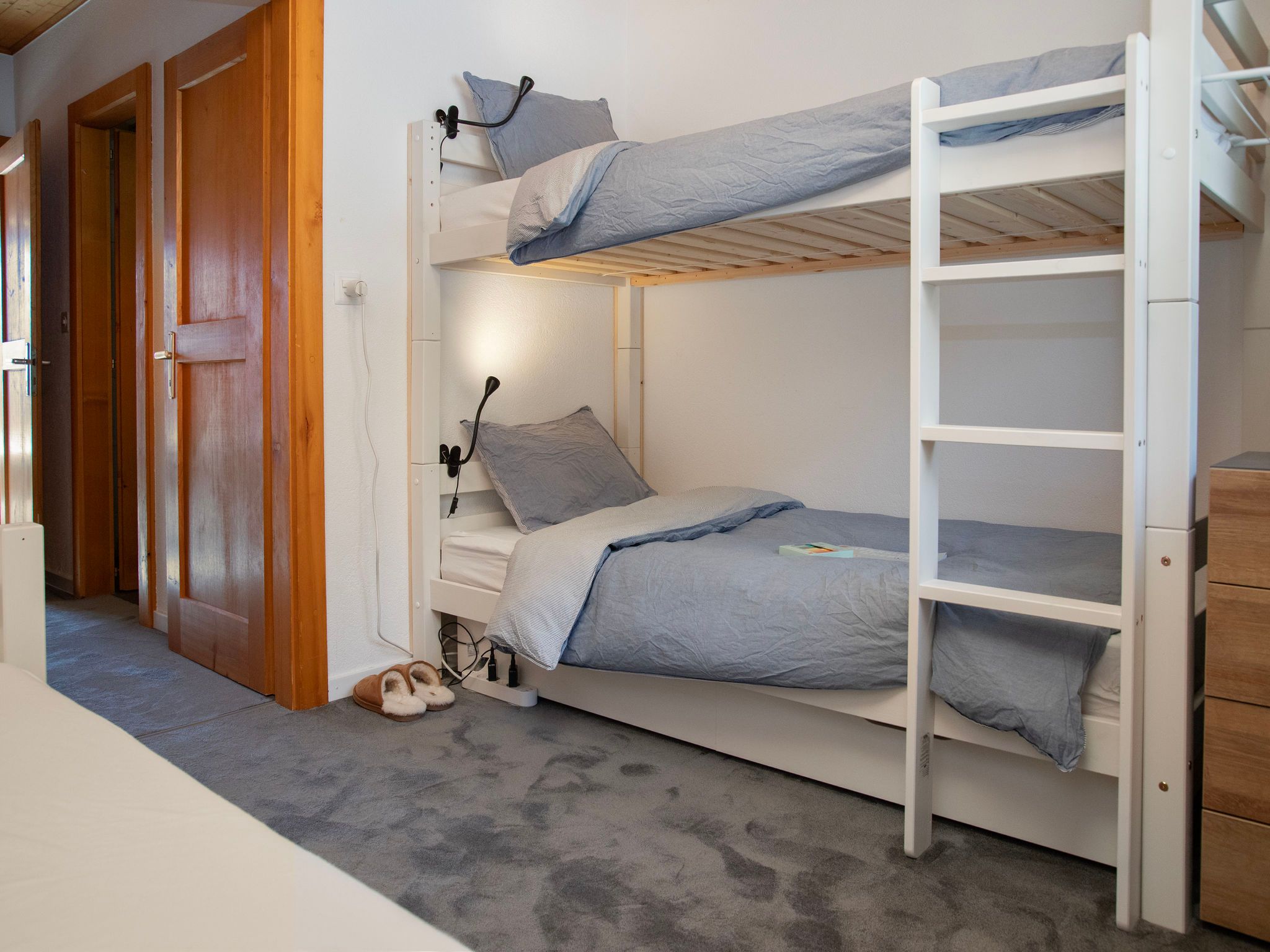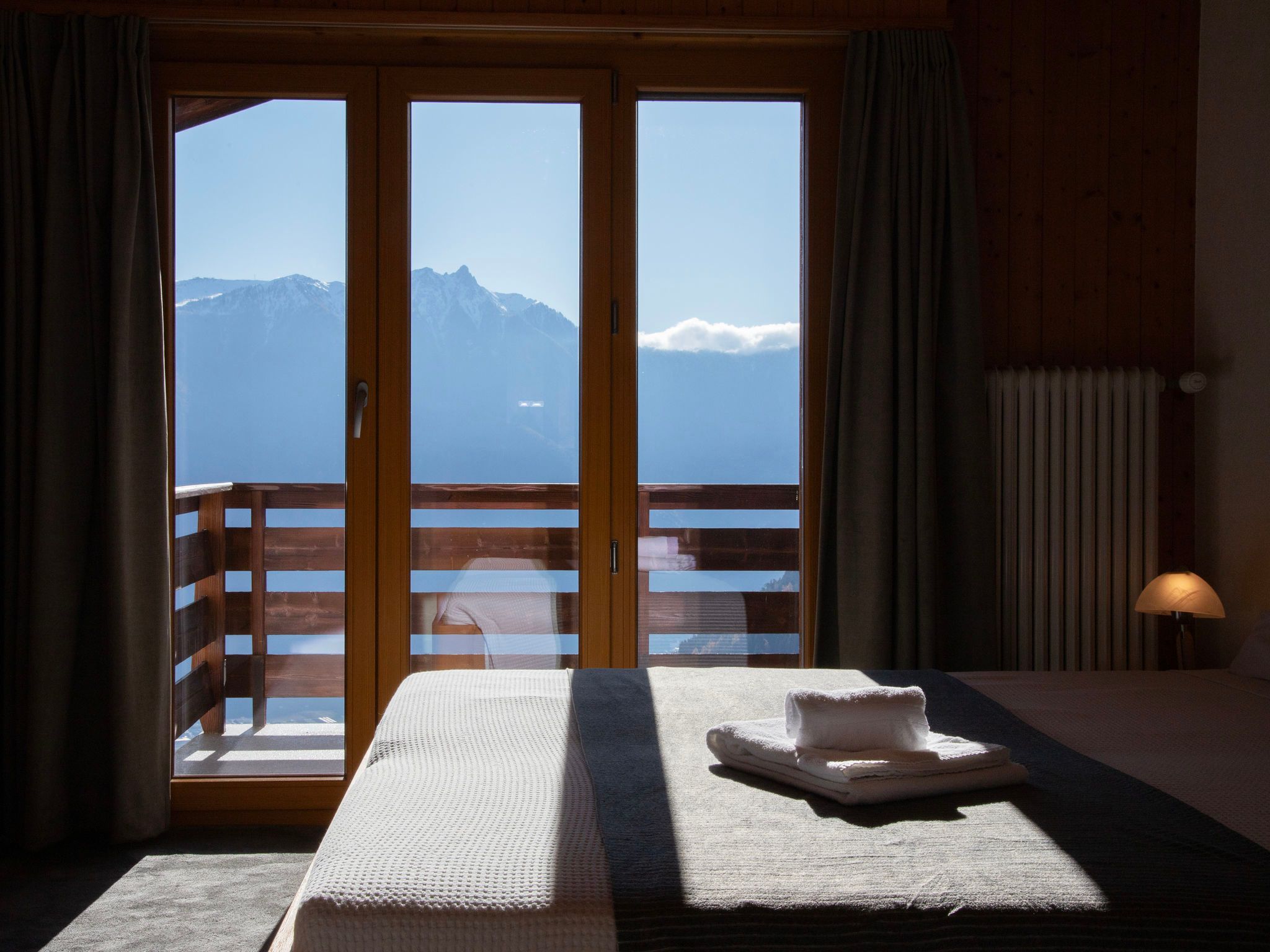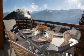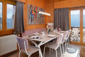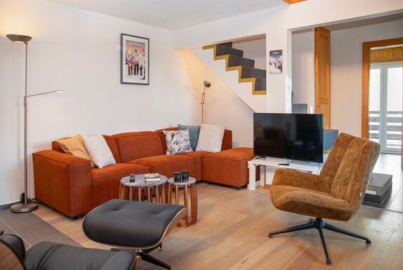 Plein Soleil B 19, 4-Zimmer-Wohnung 90 m2 im 3. Stock, Südostlage. Geräumig, abgeschrägt, renoviert im Jahre 2024, komfortabel und schön eingerichtet: Eingang. Grosses Wohn-/Esszimmer mit Schwedenofen und Kabel-TV. Ausgang zum Balkon, Richtung Südosten. Küche (4 Induktionskochplatten, Wasserkocher, elektrische Kaffeemaschine, Kapseln für die Kaffeemaschine (nespresso) extra, Racletteofen, Fondue Set (Käse)). Ausgang zum Balkon, Richtung Nordosten. Bad/WC. Obergeschoss: 1 grosses Zimmer mit 1 Doppelbett (2 x 90 cm, Länge 200 cm). Ausgang zum Balkon, Richtung Südosten. 1 Zimmer mit 1 Bett (90 cm, Länge 200 cm), 1 x 1 Etagenbetten (90 cm, Länge 200 cm). 1 Zimmer mit 1 franz. Bett (1 x 140 cm, Länge 200 cm). Kleine Galerie mit Kabel-TV. Dusche/WC. Zur Verfügung: Internet (WLAN, gratis). Bitte beachten: Nichtraucher-Unterkunft.