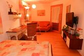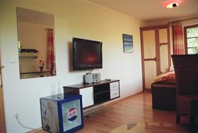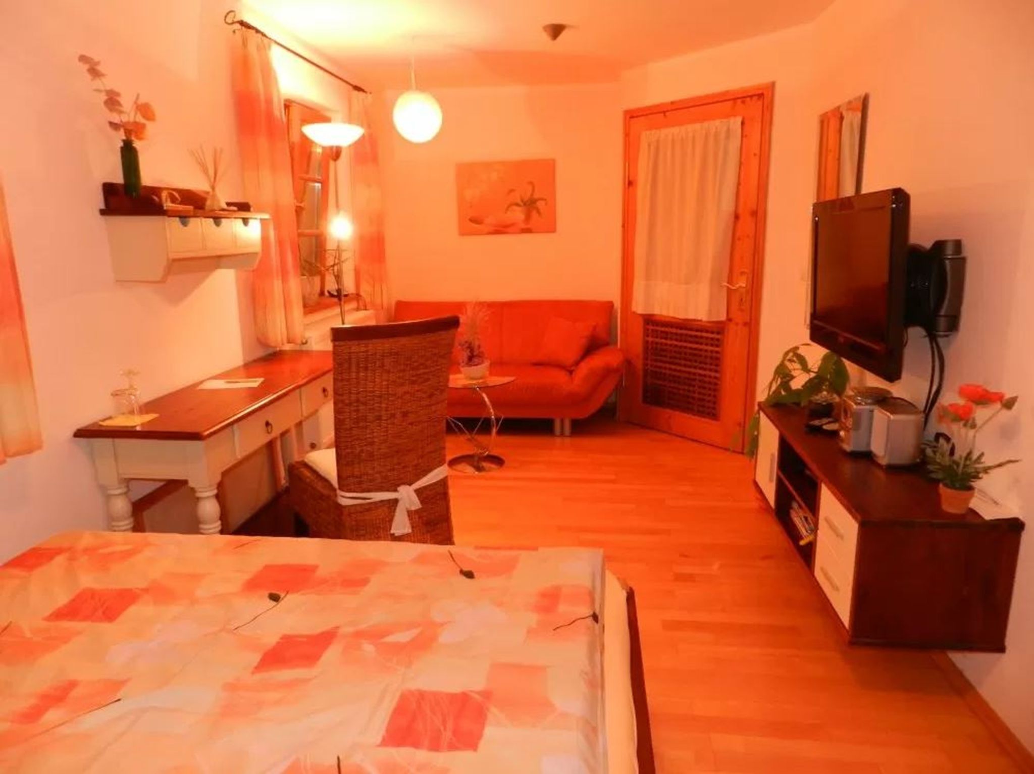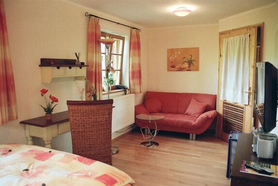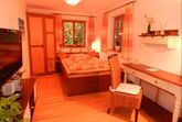UDie Empore I ist unser kleinstes Ferienzimmer. Dieses Einzelzimmer bietet auf ca. 16 qm jeglichen Komfort, der bei 5 Sternen selbstverständlich ist. Hierzu kommen die wohlige Wärme und Liebe, die nicht nur die Farben ausstrahlen, sondern sich auch im Interieur wiederspiegeln. Zur Entspannung können Sie den Flat-Screen Fernseher mit DVD Player entweder zum 140 cm breitem, handgefertigten Bett oder zur Kuschelcouch hin schwenken. Die Nachmittags- und Abendsonne durchflutet diese Zimmer mit seinen Strahlen. Das sonnengelbe WC liegt separat auf den Gang. Leider müssen wir die Gäste dieses Zimmers bitten, die Duschen im Wellnessbereich zu nutzen. In der Gemeinschaftsküche können Sie Ihr Essen zubereiten. Das paradiesische Verwöhnfrühstück können Sie sich auch auf Wunsch von uns zubereiten lassen und im Frühstücksraum einnehmen.