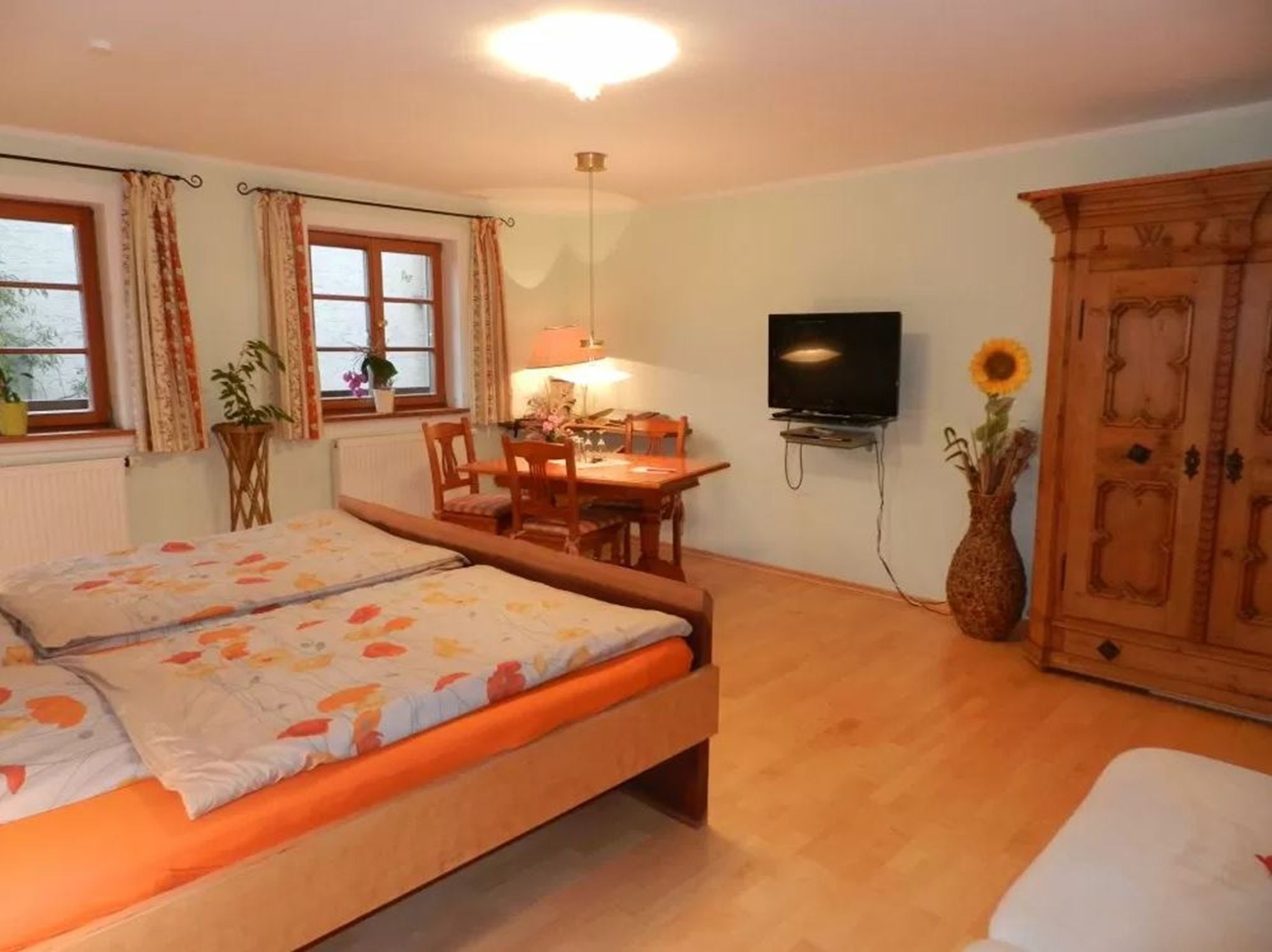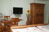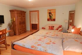 Dieses Ferienzimmer trägt den Namen Empore II und misst 24 qm. Durch die Ausrichtung der Fenster nach Süden erhellt die Sonne dieses Paradies schon am frühen Vormittag. Vom handgefertigten Doppelbett, das selbstverständlich wieder ein Unikat ist, schwenkt der Blick von den Fenstern über den Fernseher hin zu einem weiteren Unikat, einem Kleiderschrank aus 1773. Ein wunderschöner, herrschaftlich, bäuerlicher Tisch mit Stühlen ändert den Charakter dieses gemütlichen Schlafraumes hin zu einem wohnlichen Zimmer. Zur technischen Ausstattung gehört ein Telefon mit eigener Rufnummer, ein Sat-Fernseher, DVD-Recorder, Kompakt-Stereo-Anlage mit Weckfunktion. Ihr separates WC mit Dusche liegt über dem Gang. Hier tauchen Sie in eine blaue Atmosphäre ein. Die Fußbodenheizung geht bis in den mit Mosaik belegten ebenerdigen Duschbereich hinein. Selbstverständlich liegt ein Fön neben dem Waschtisch bereit. Der Spiegel ist in die Fliesen eingearbeitet. In der 20 qm großen Gemeinschaftsküche können Sie Ihr Frühstück oder Essen zubereiten. Selbstverständlich können Sie auch den Frühstücksraum nutzen. Wenn Sie sich kein Frühstück machen wollen, so können Sie sich auch von unserem paradiesischen Frühstück verwöhnen lassen.