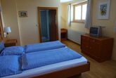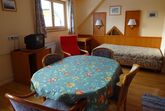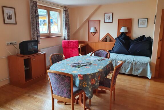 • 1 Wohn/Schlafzimmer mit Miniküche (Kühlschrank, Ceranfeld, Mikrowelle, Wasserkocher, Kaffeemaschine), Esstisch, Doppelcouch und Bad/WC