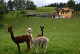 Umgeben von den Wiesen, Wäldern und der gesunden Luft des Jogllandes fühlen sich unsere Alpakas und Schafe sichtlich wohl. Die Alpakas sind sehr ruhige, neugierige und überaus kinderfreundliche Tiere. Das macht einfach die Atmosphäre auf unserem Biohof aus.
