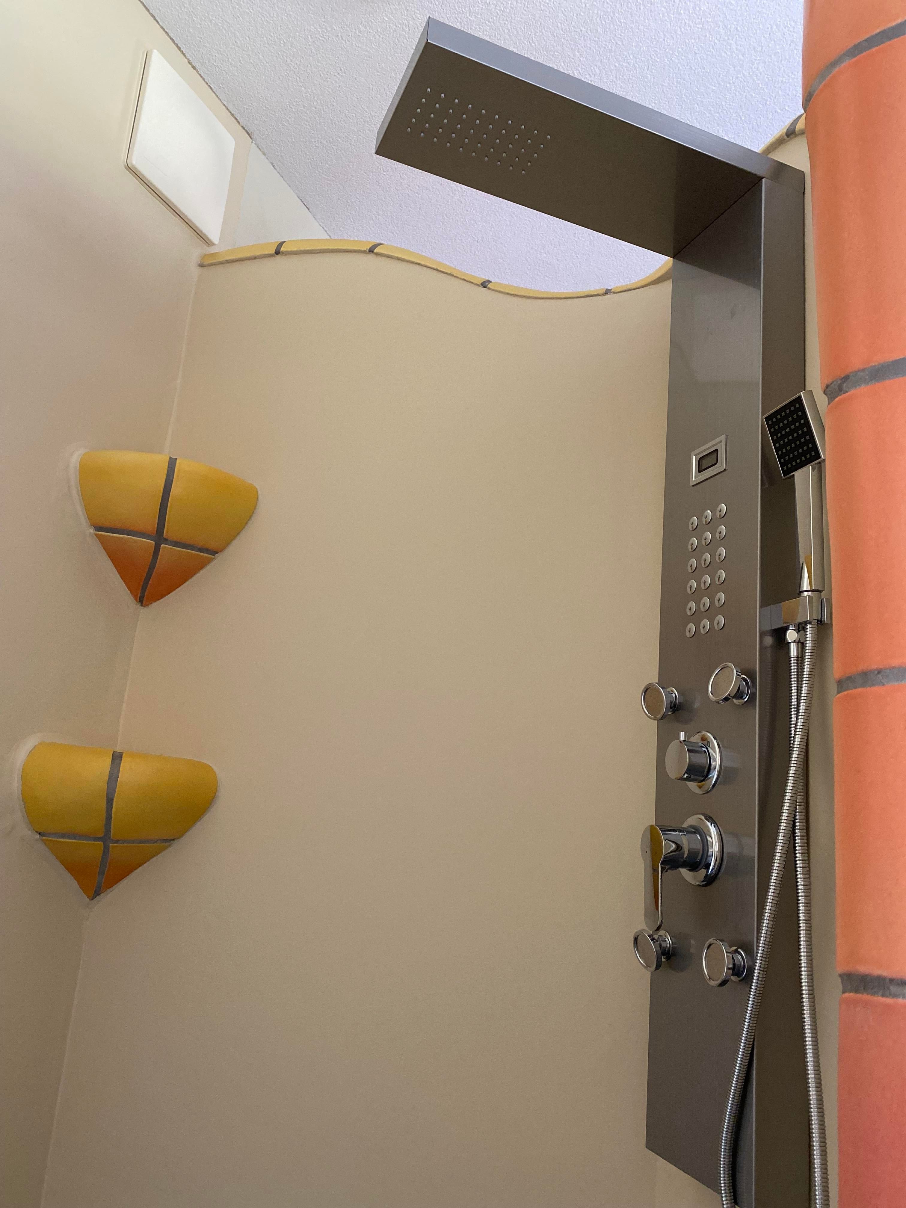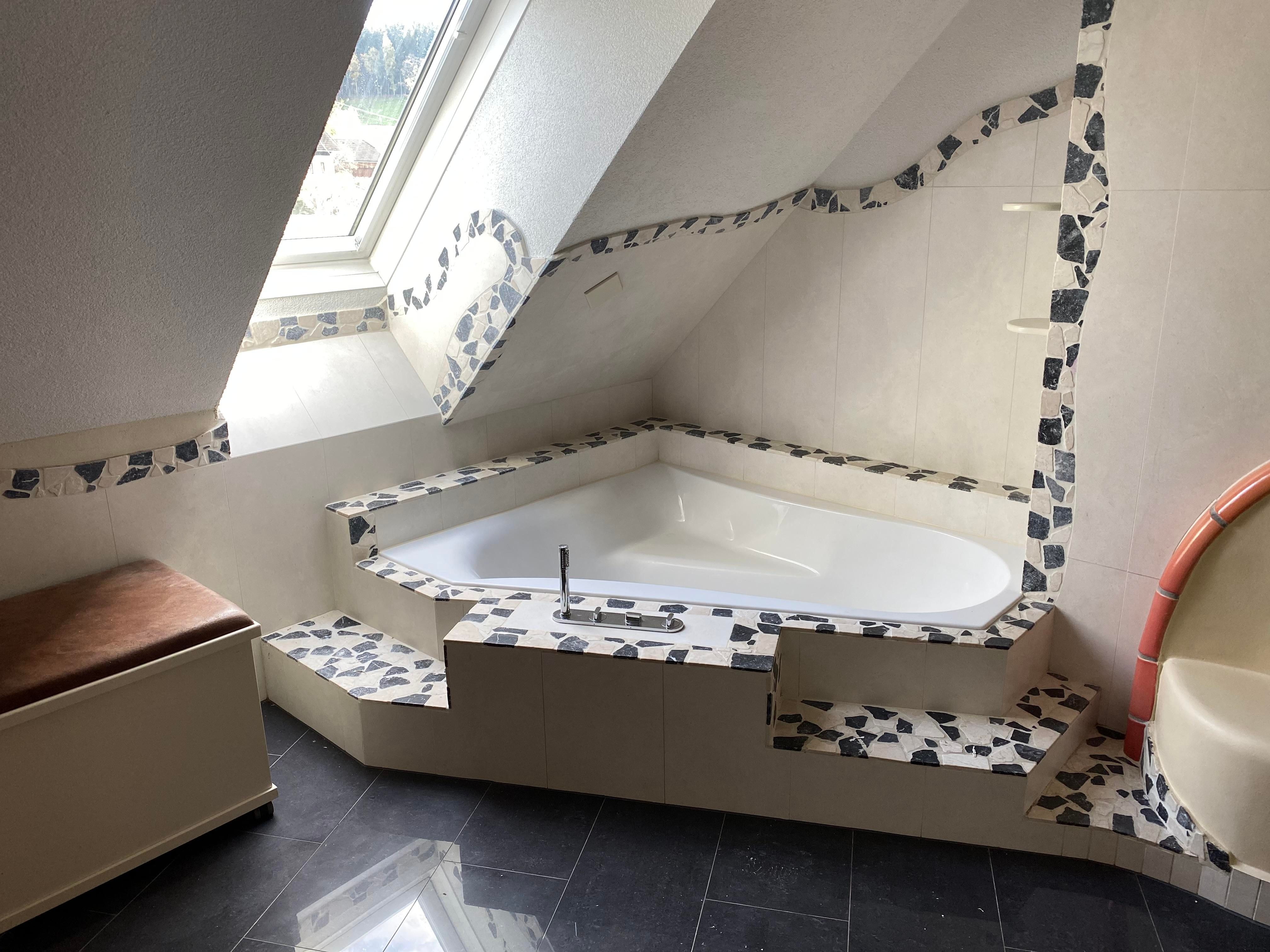• Das Badezimmer verfügt über eine Badewanne, Dusche und Doppelwaschbecken.