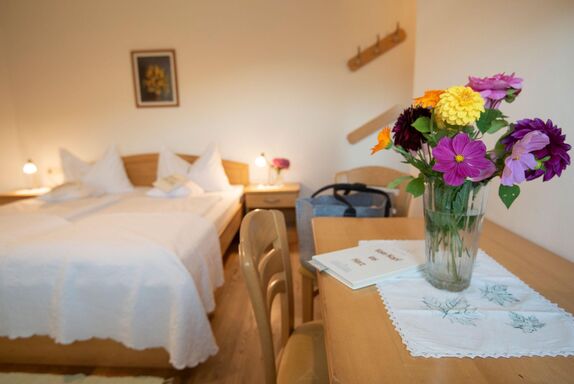 In zwei von den Doppelzimmern gibt es eine ausziehbare Couch. Im Erlen- und im Fichten-Zimmer haben Sie eine Aussicht auf die weitreichende Blumenwiese und den angrenzenden Wald. Im Erlen-Zimmer blicken Sie sogar auf die Fischbacher Alpen.