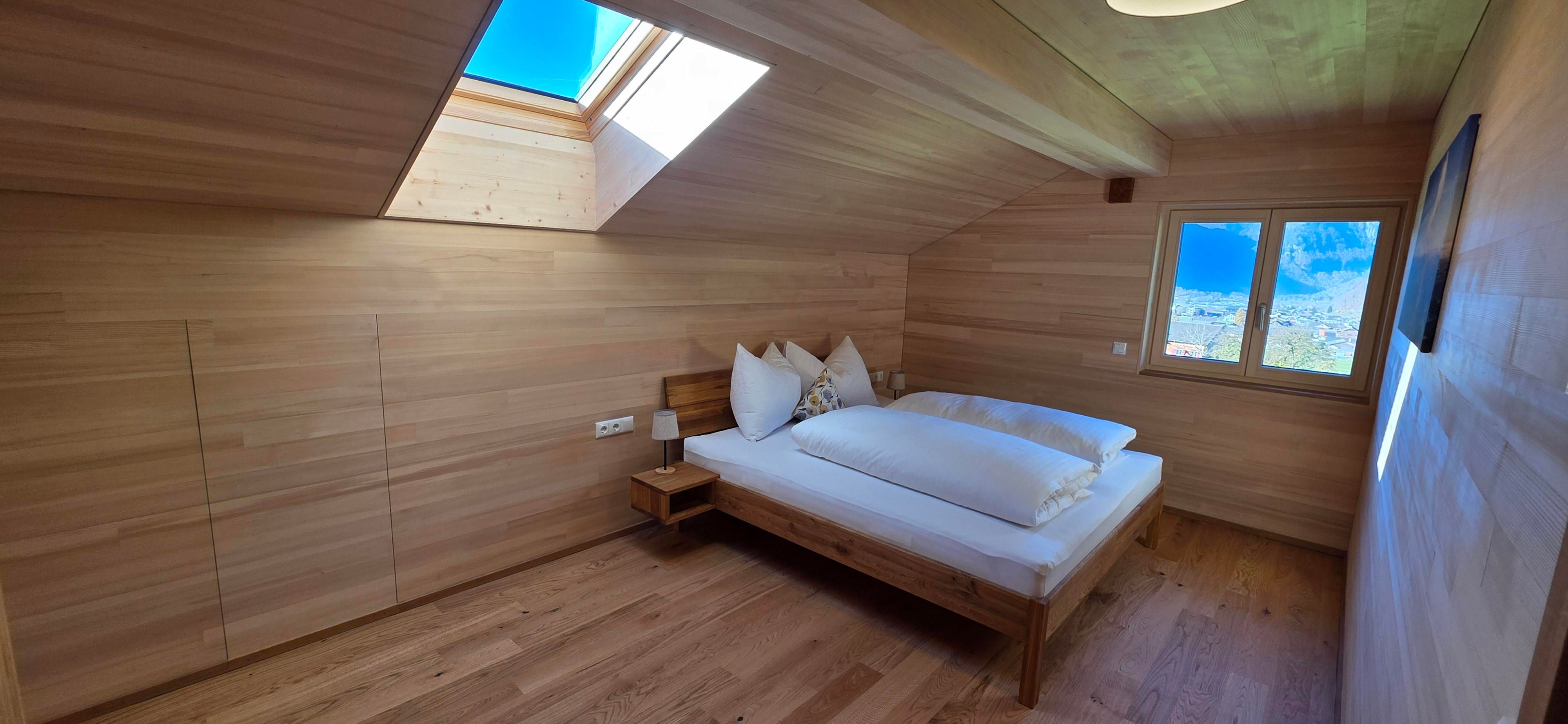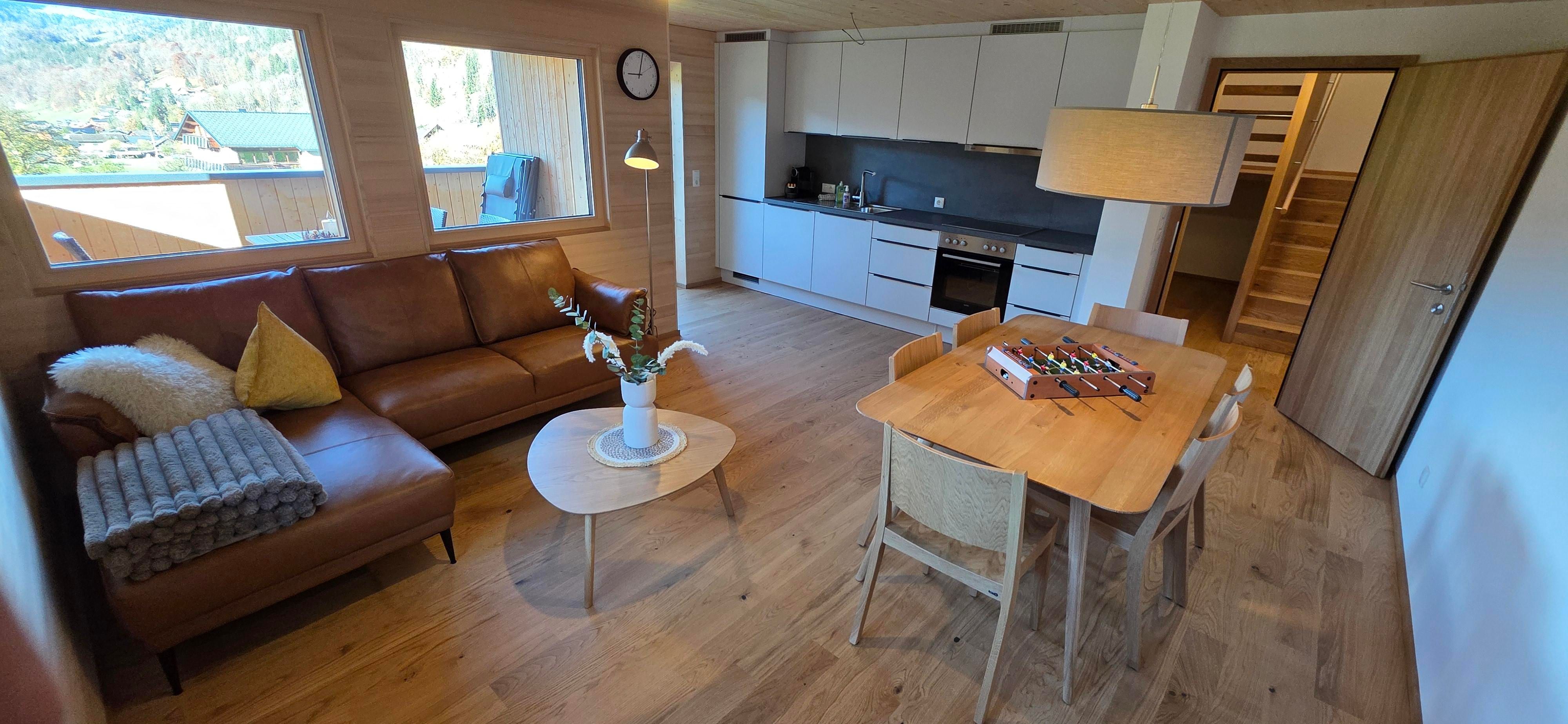 Unser Apartment verfügt über zwei Schlafzimmer, ein helles Wohnzimmer, eine komplett ausgestattete Küche und ein modernes Bad. Große Fenster lassen das Alpenlicht herein und bieten eine wunderschöne Aussicht auf die umliegende Bergwelt. Das Apartment ist sonnig, gemütlich und mit viel Liebe zum Detail eingerichtet.