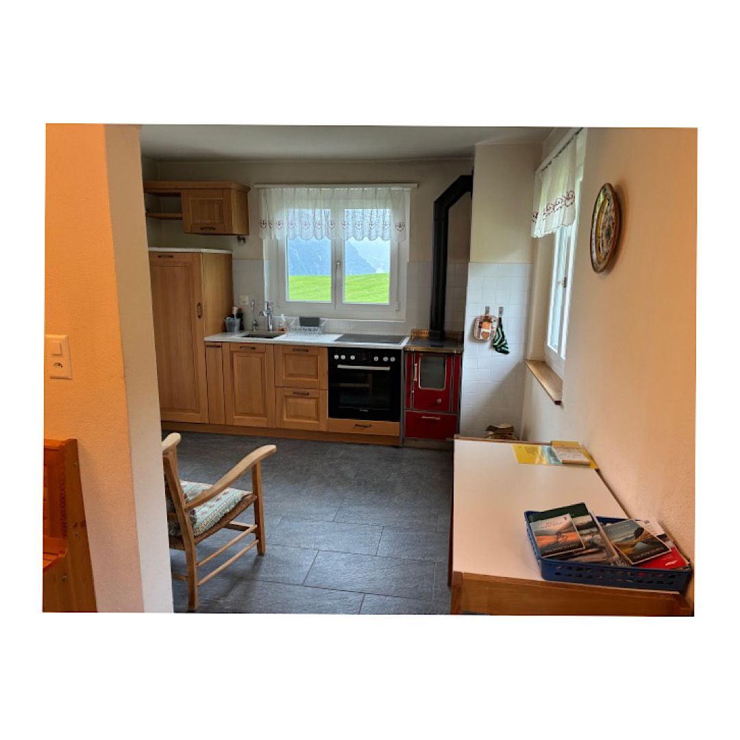 Die Innenausstattung der sorgfältig renovierten Wohnung im ersten Stock verbindet modernen Komfort mit traditionellem Charme und ist direkt von der Außenwiese zugänglich. Sie bietet zwei gemütliche Schlafzimmer und ein Wohnesszimmer, das mit einer renovierten Küche ausgestattet ist. Hier finden Gäste neben einem Holz- und Elektroherd auch einen Kühlschrank. Ein neues Badezimmer mit Dusche, Boiler, WC und Waschmaschine sowie elektrische Heizungen und ein Holzofen sorgen das ganze Jahr über für behagliche Wärme.