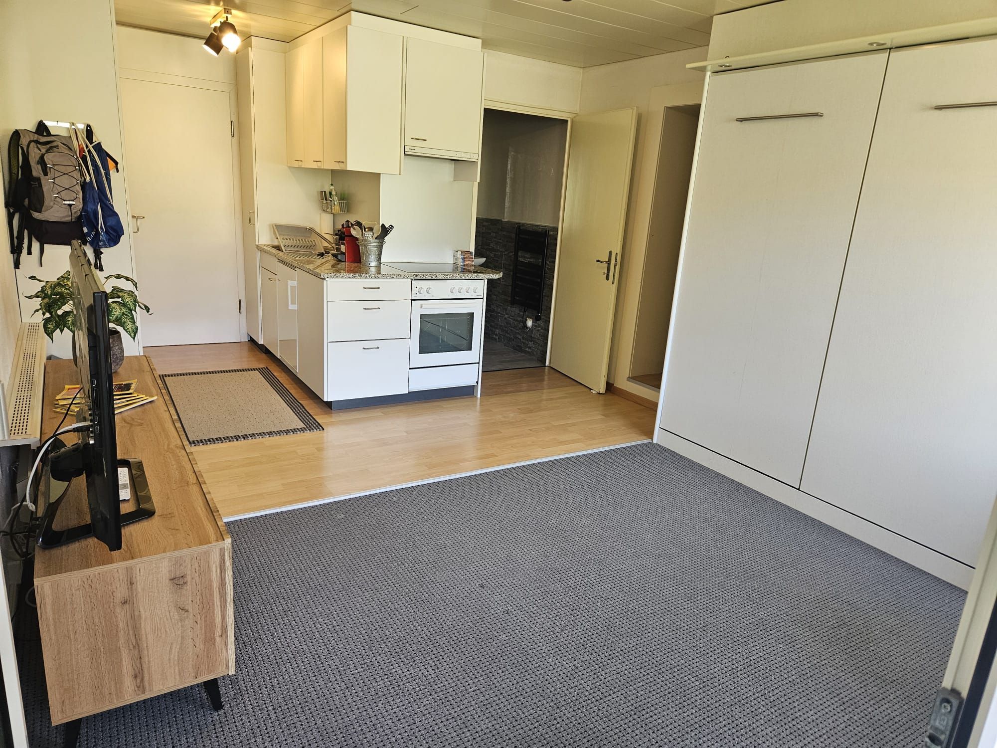 Im Inneren erwartet Sie eine liebevoll eingerichtete Wohnung, die mit einem Kajütenbett im Schlafzimmer sowie einem ausklappbaren Schrank-Doppelbett im Wohnzimmer für wohligen Schlaf sorgt. Die Wohnküche ist komplett ausgestattet mit einem Backofen, Herd und allen notwendigen Utensilien, um köstliche Mahlzeiten zu zaubern. Zur weiteren Ausstattung zählen ein Fernseher mit SAT-Anschluss und gratis WLAN, um auch im Urlaub bestens vernetzt und unterhalten zu sein. Das Badezimmer bietet eine Dusche und ein WC, rundum alles für Ihren Komfort.