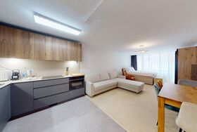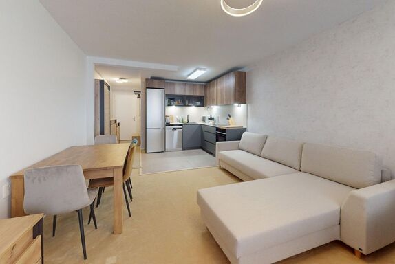 Der Wohnbereich ist offen gestaltet und verfügt über eine gemütliche Sofaecke, einen Essbereich und einen Flachbild-TV. Die komplett ausgestattete Küche bietet alles für unabhängiges Kochen.